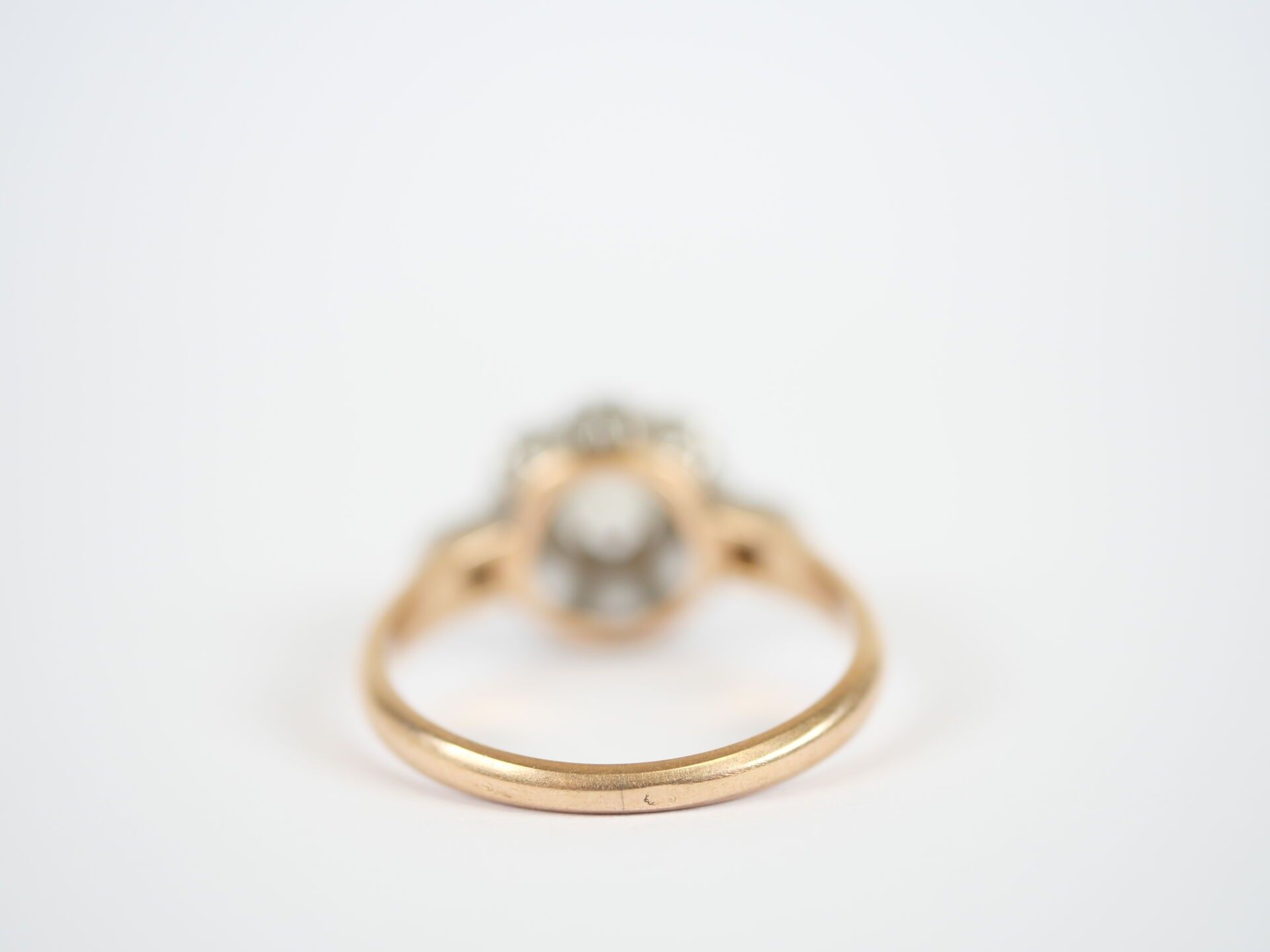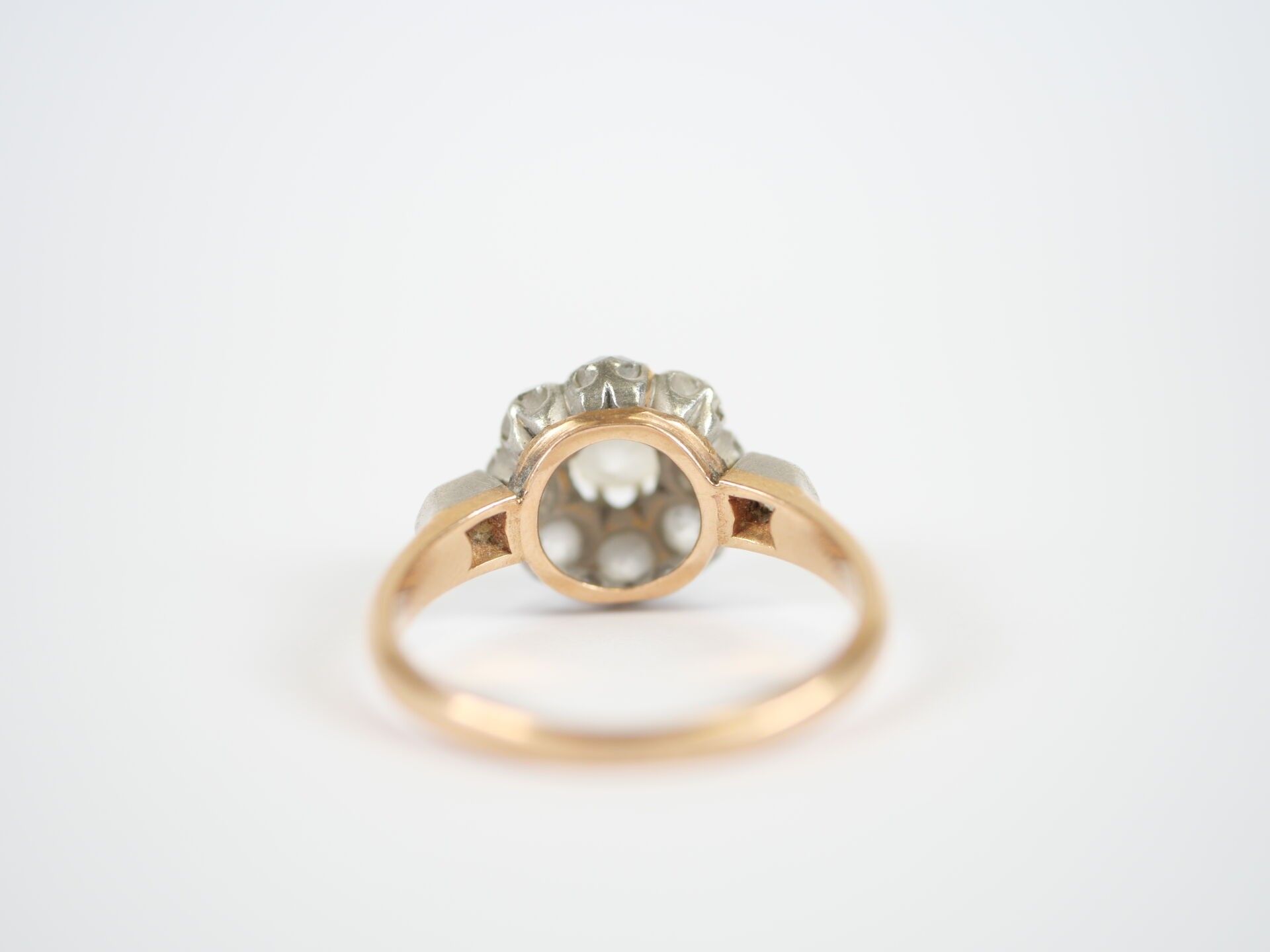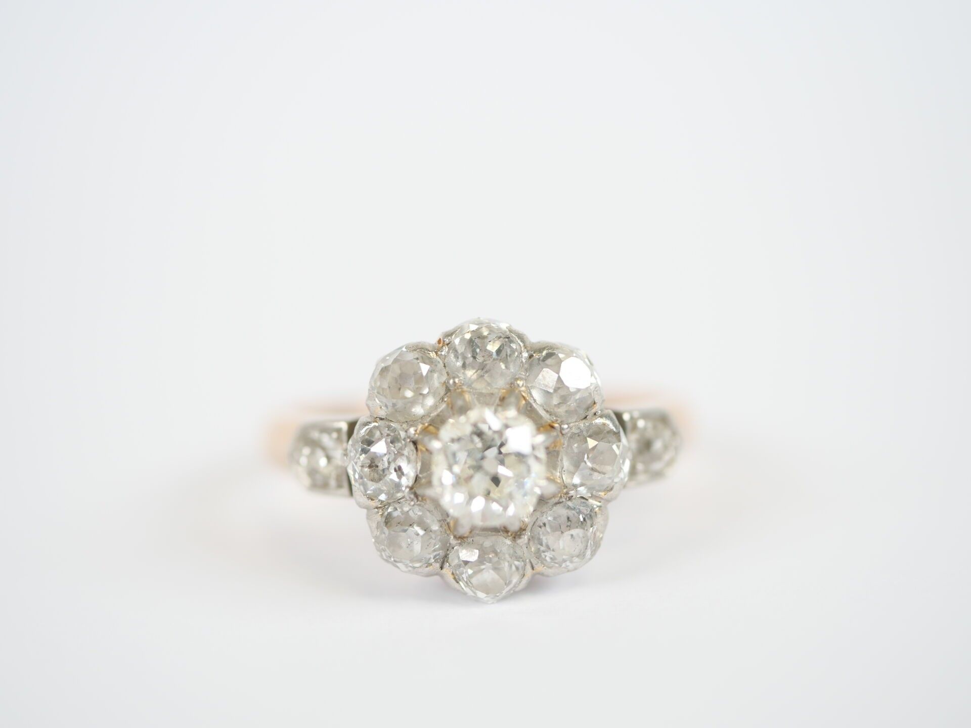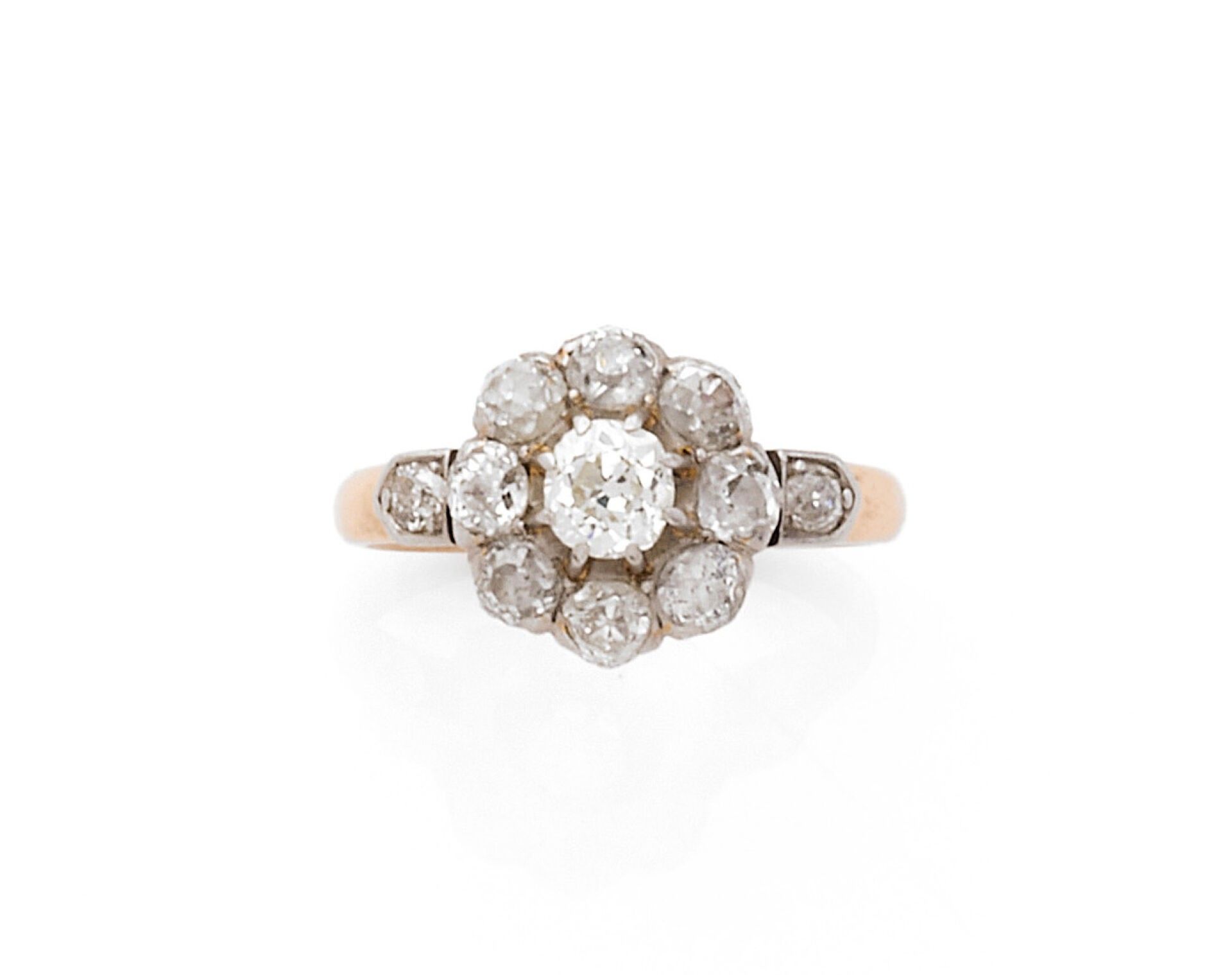 An 18K (750‰) yellow gold and white gold or platinum daisy ring set with ten old-cut diamonds in claw-setting, the largest approximately 0.33 carat.