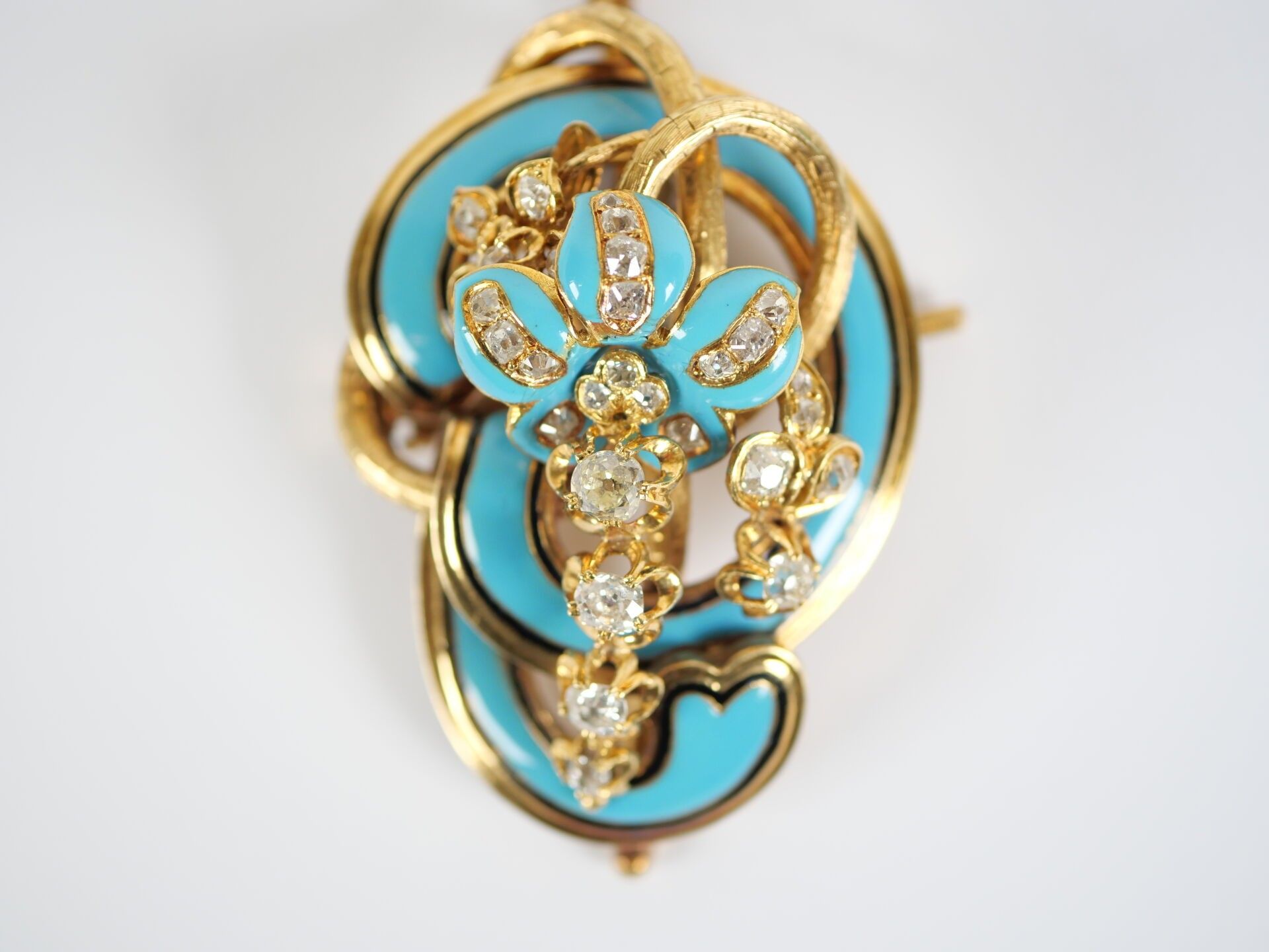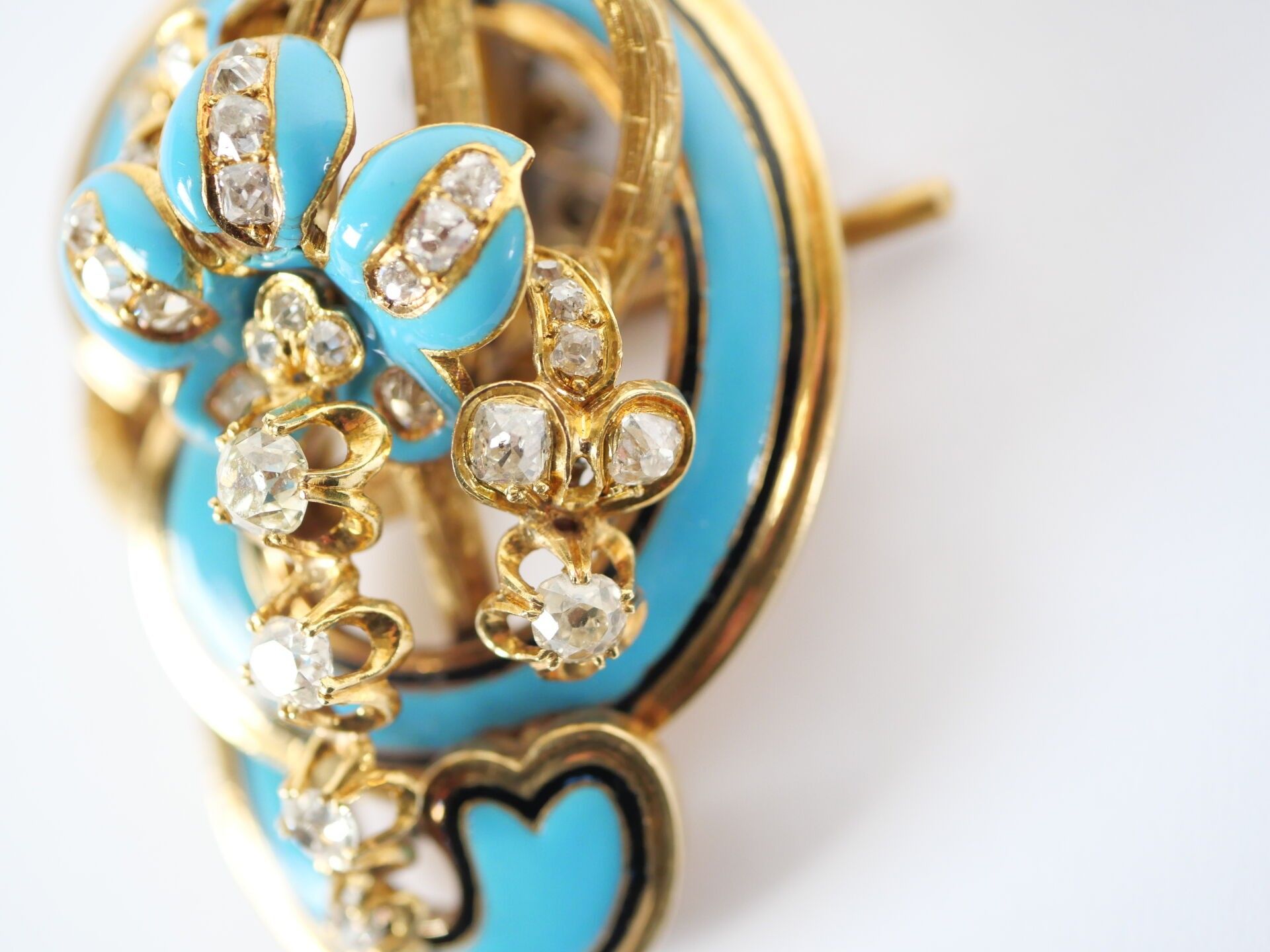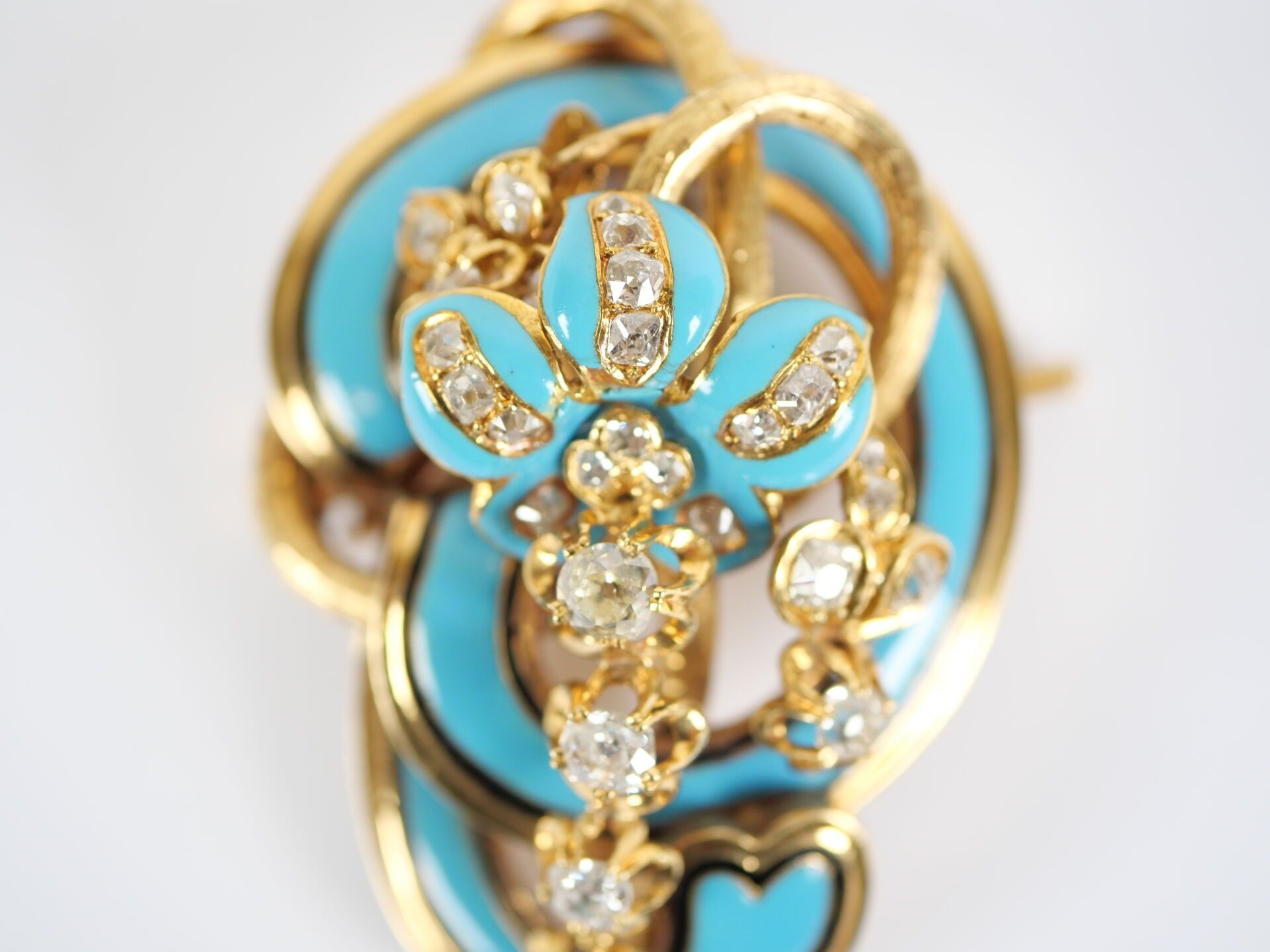 Important 18K yellow gold (750‰) brooch with stylised interlacing and floral decoration, turquoise blue enamel underlined by black enamel fillets, set with numerous old-cut diamonds mounted in claw-sets.