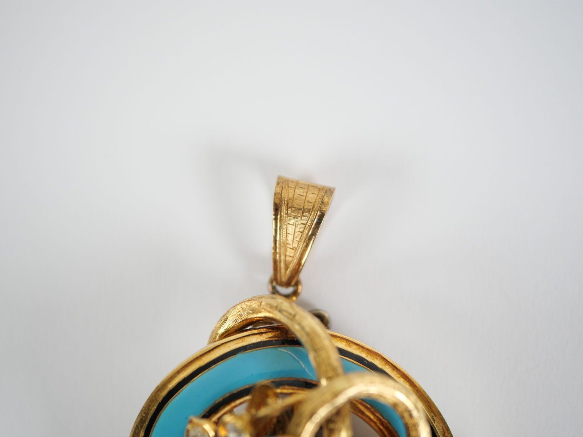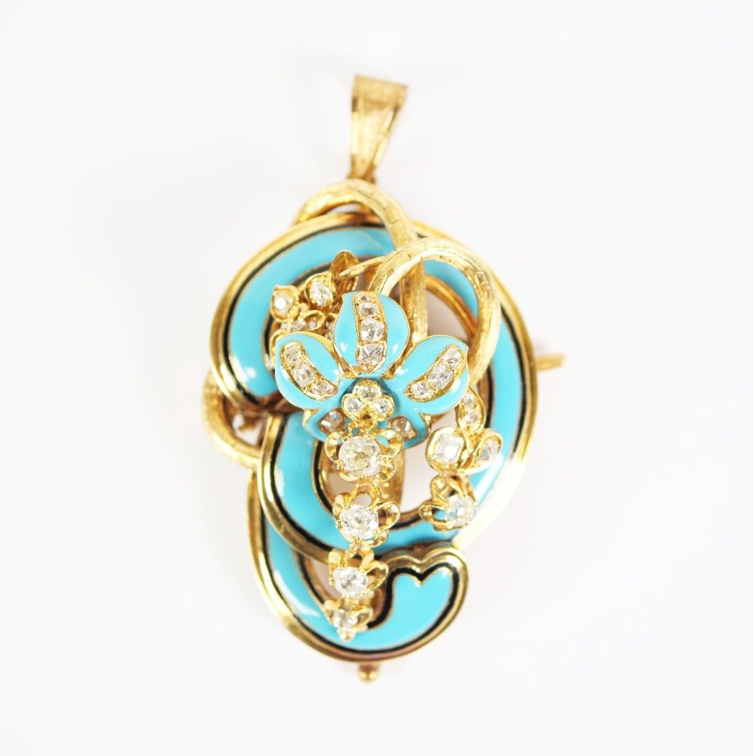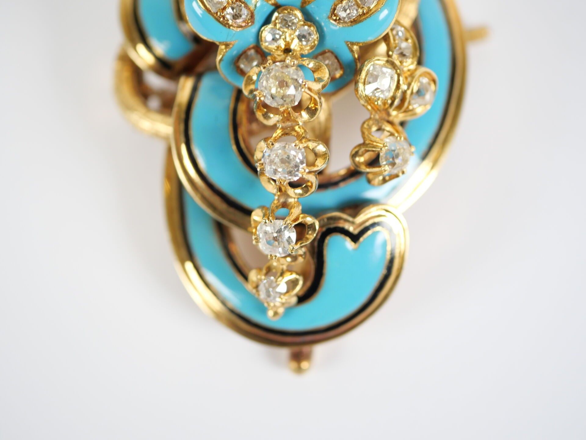 Important 18K yellow gold (750‰) brooch with stylised interlacing and floral decoration, turquoise blue enamel underlined by black enamel fillets, set with numerous old-cut diamonds mounted in claw-sets.