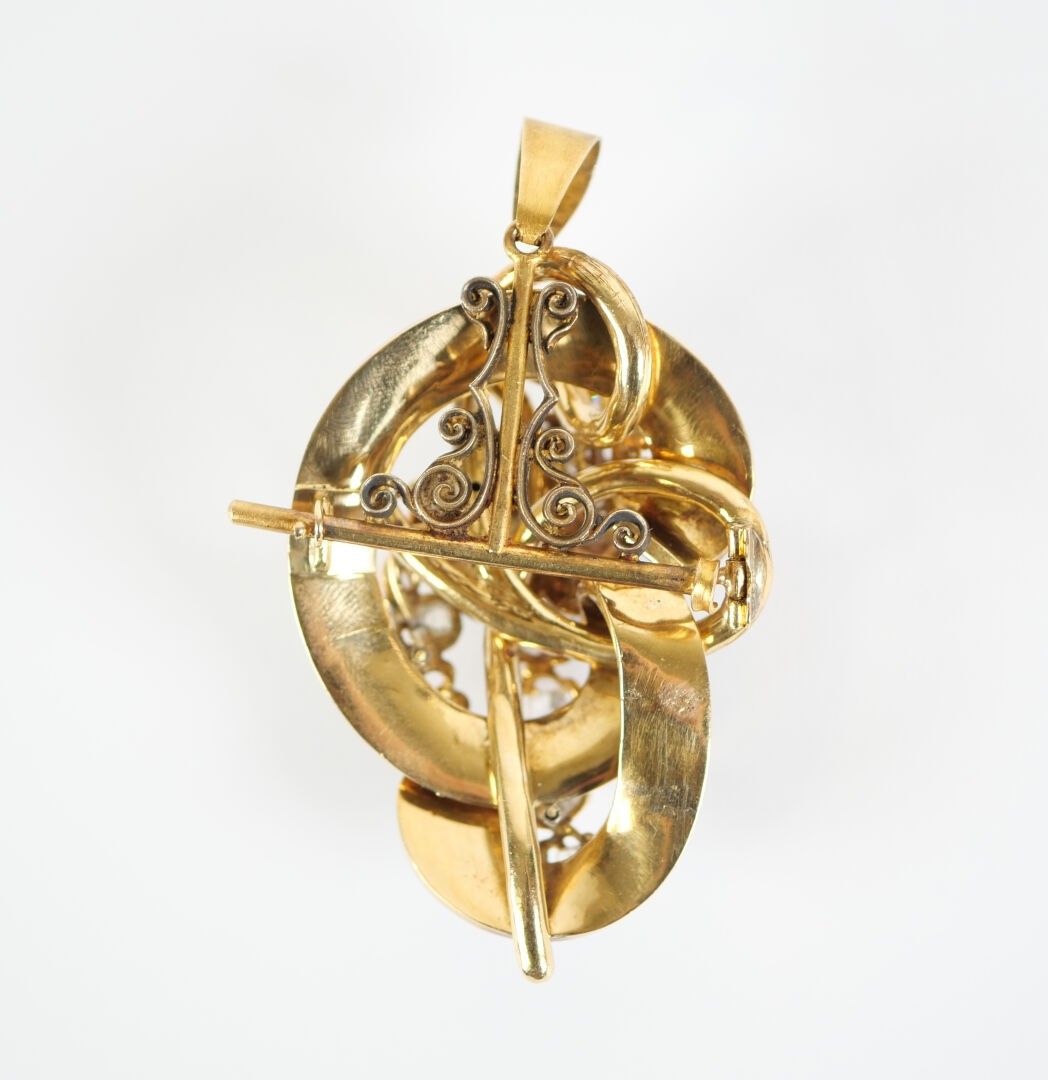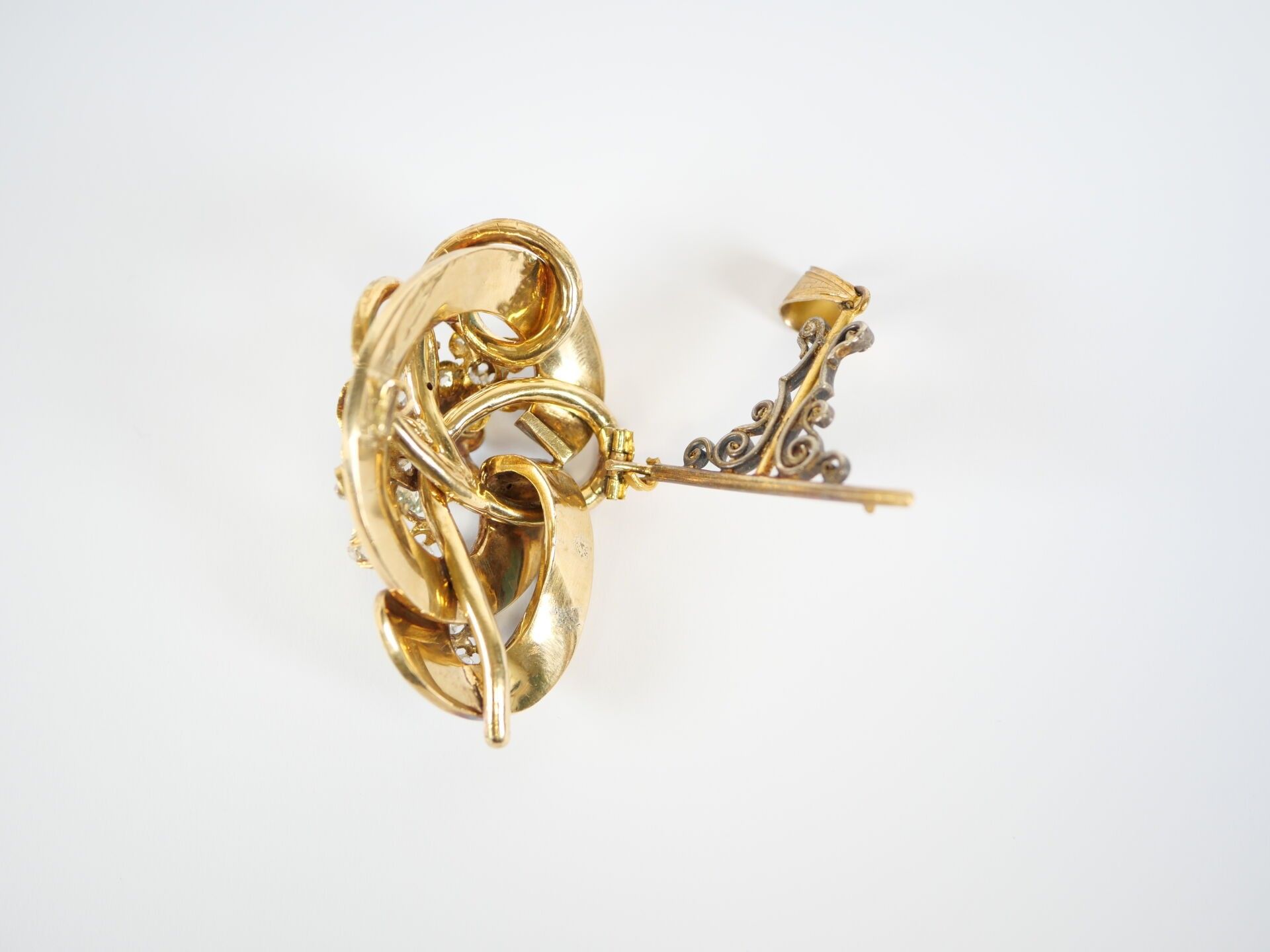 Presented with an 18K (750‰) yellow gold and metal element decorated with scrolls attaching to the prong of the brooch to form a pendant.