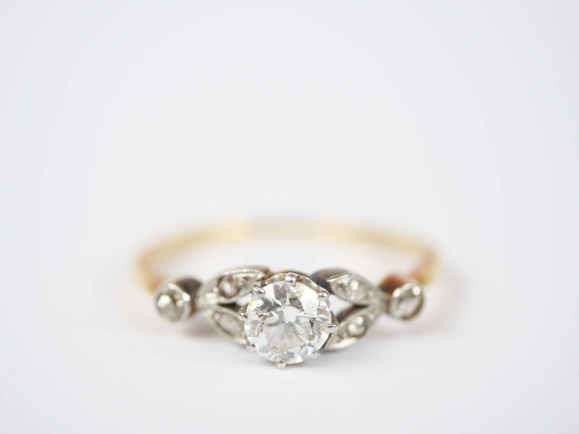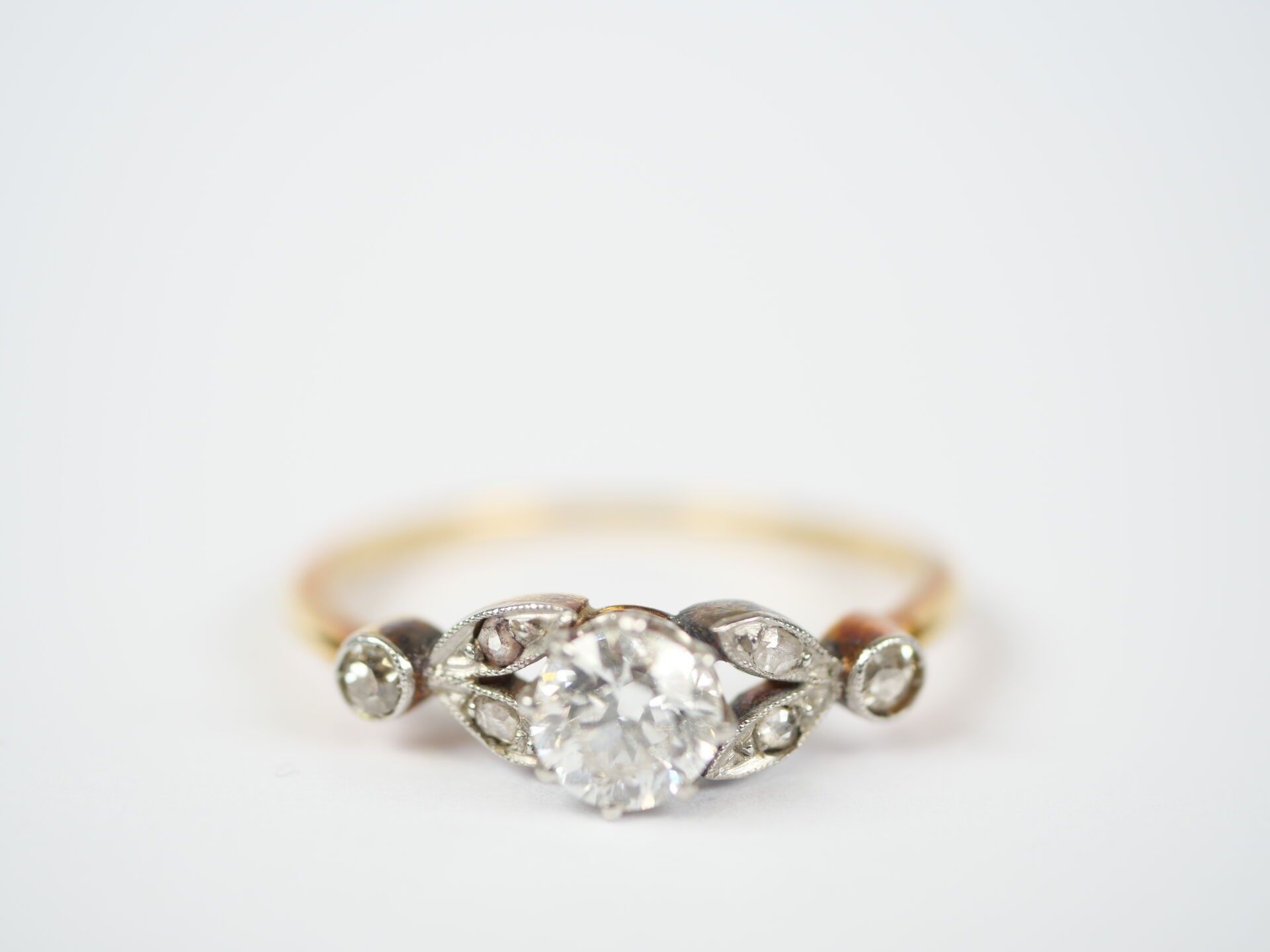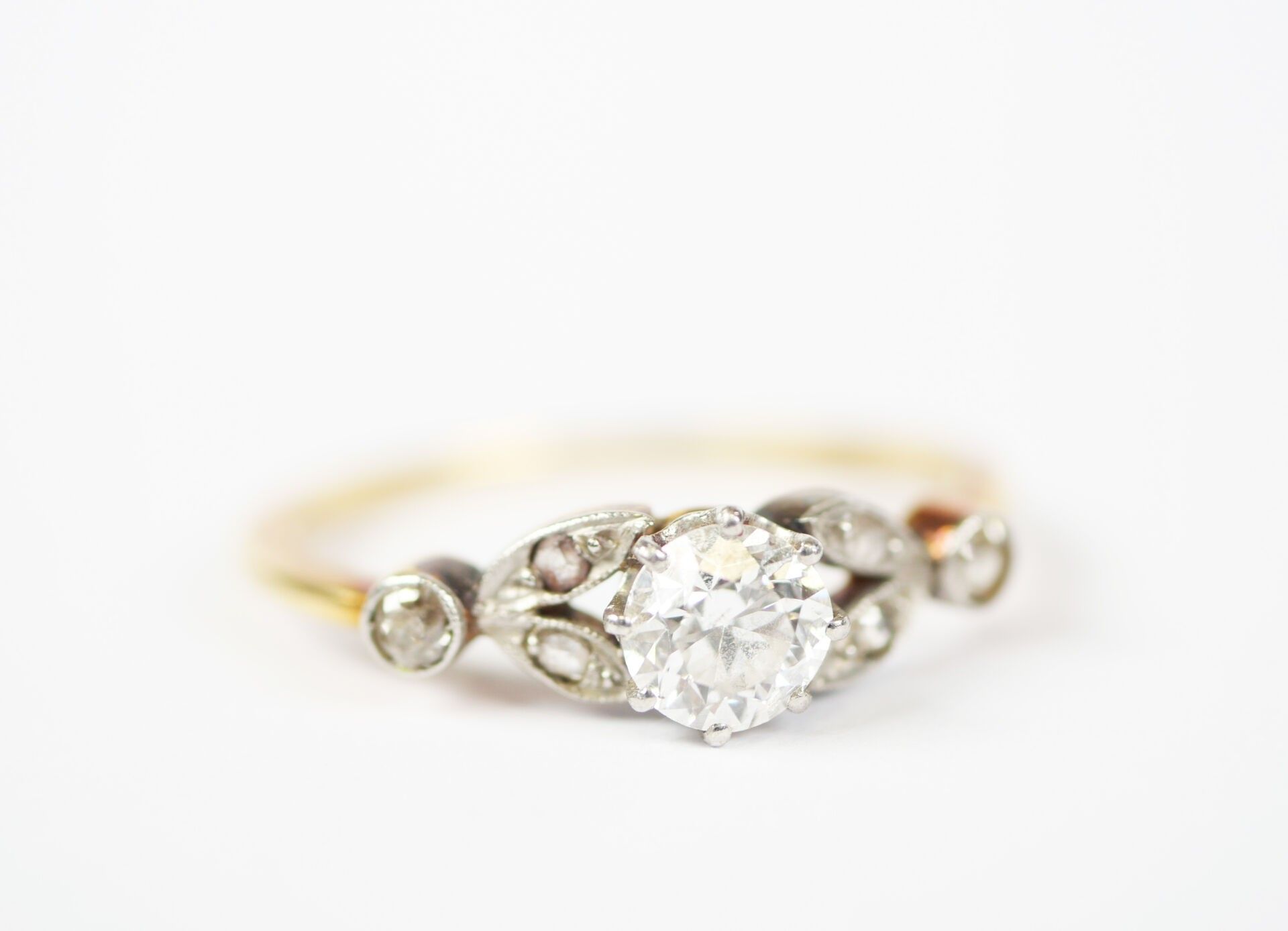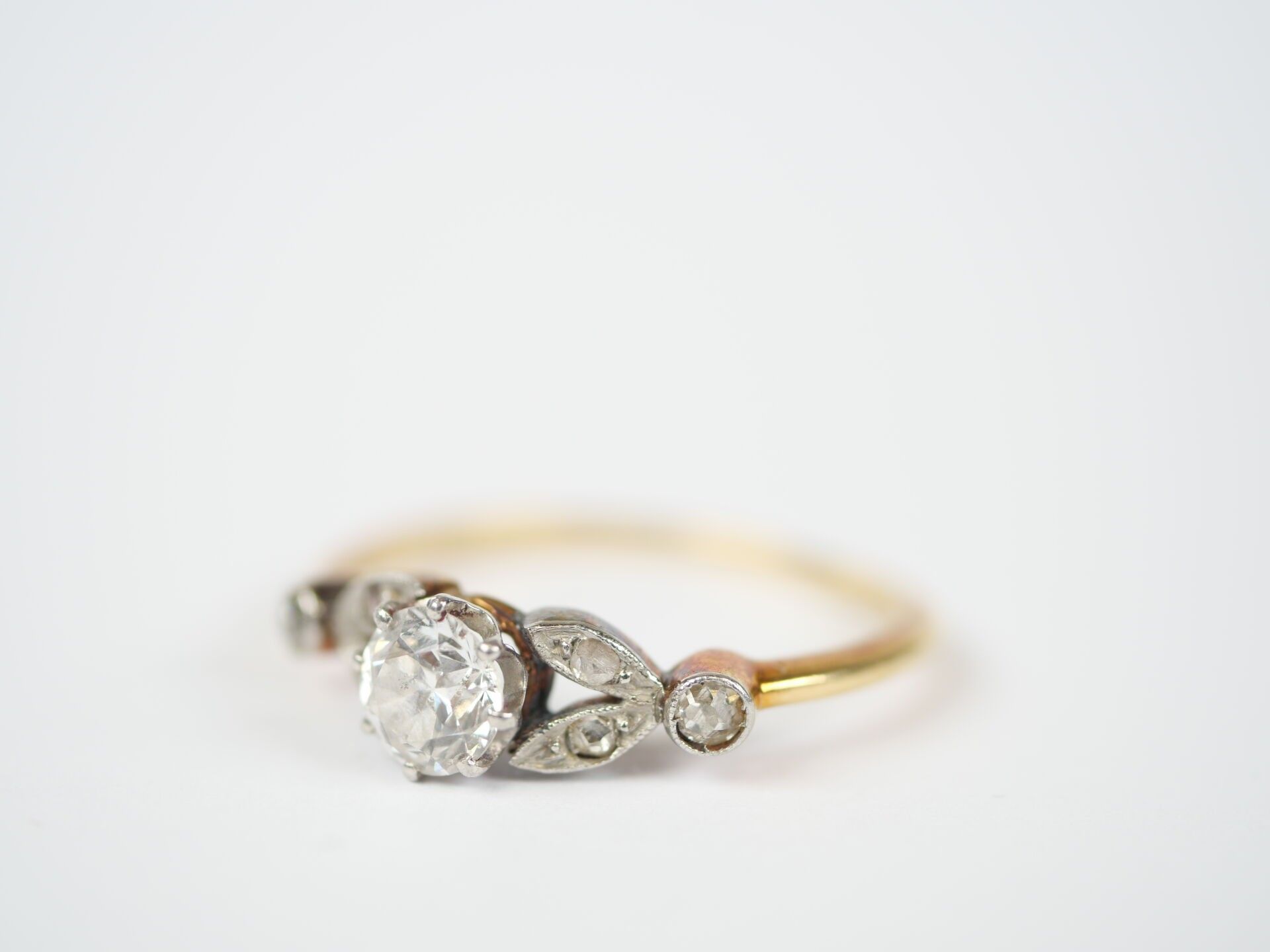 An 18K (750‰) yellow gold and white gold or platinum ring centred with a round diamond, approximately 0.50 carat, shouldered with stylised foliage embellished with small rose slivers, the whole set in claw-sets.