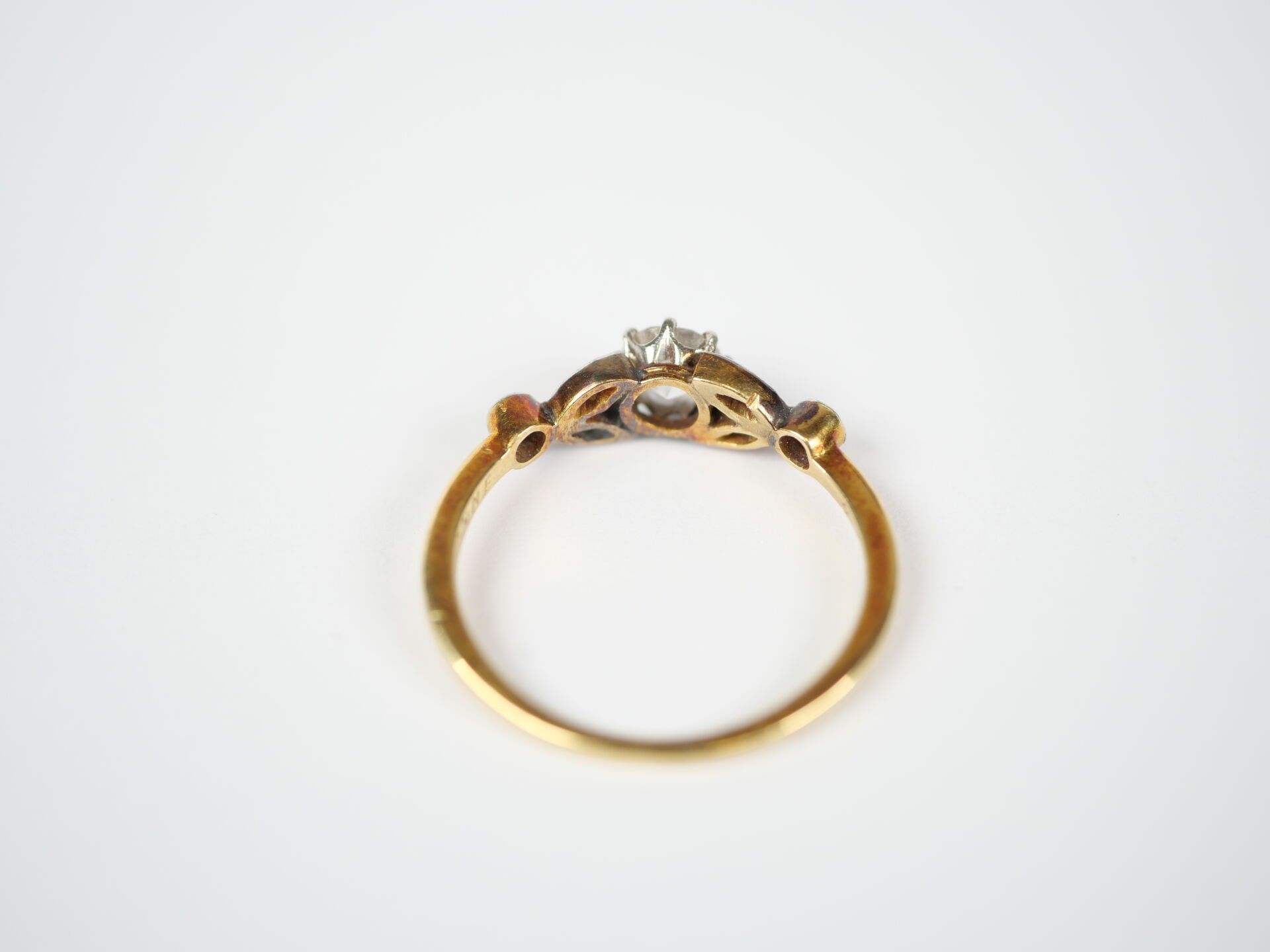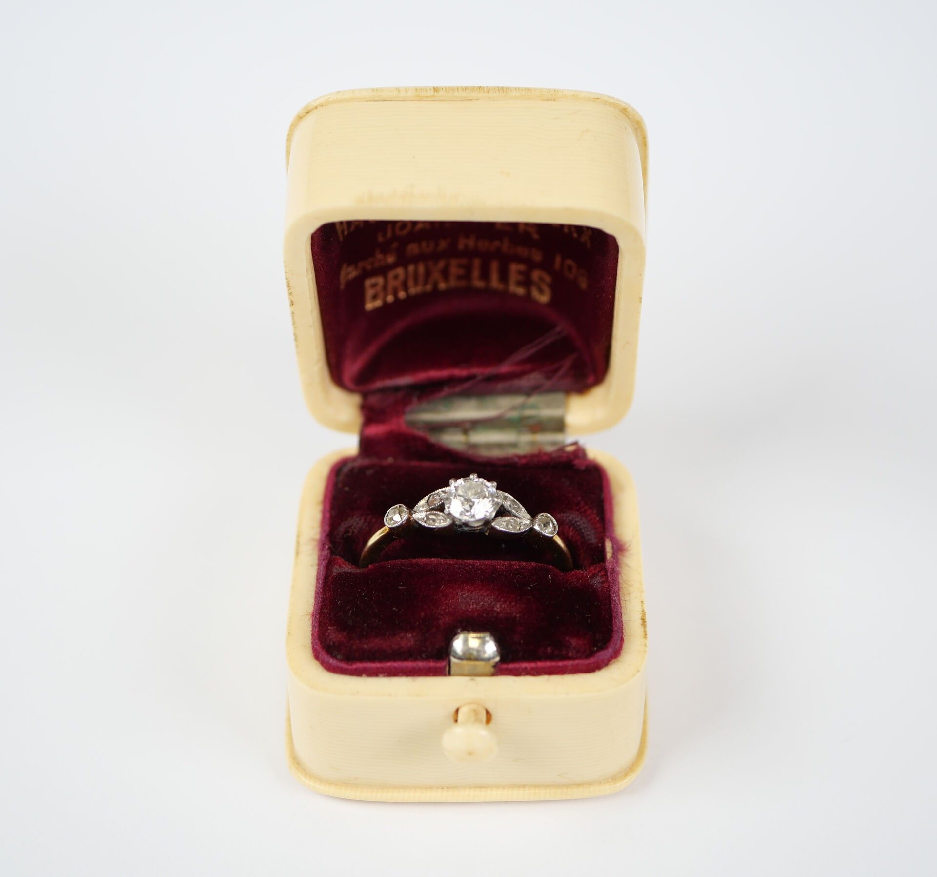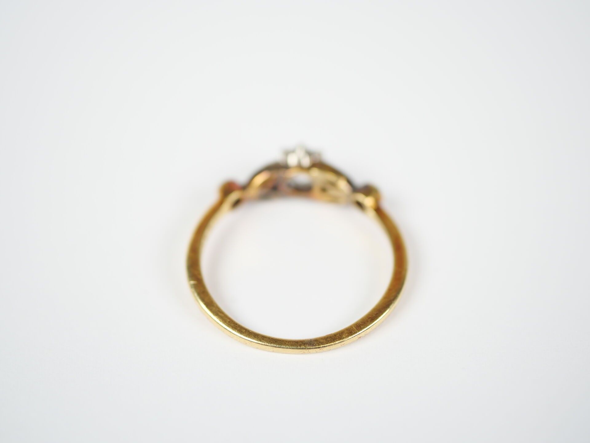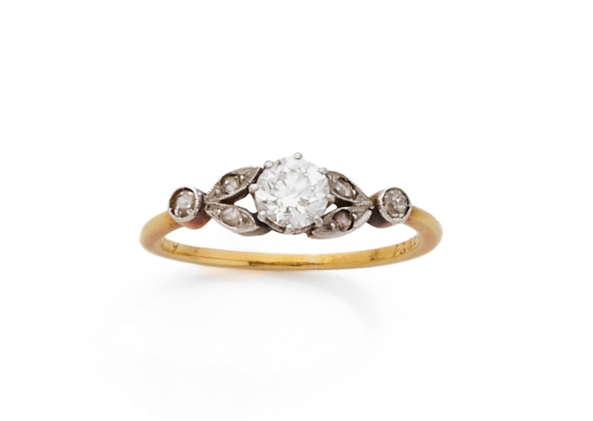 An 18K (750‰) yellow gold and white gold or platinum ring centred with a round diamond, approximately 0.50 carat, shouldered with stylised foliage embellished with small rose slivers, the whole set in claw-sets.