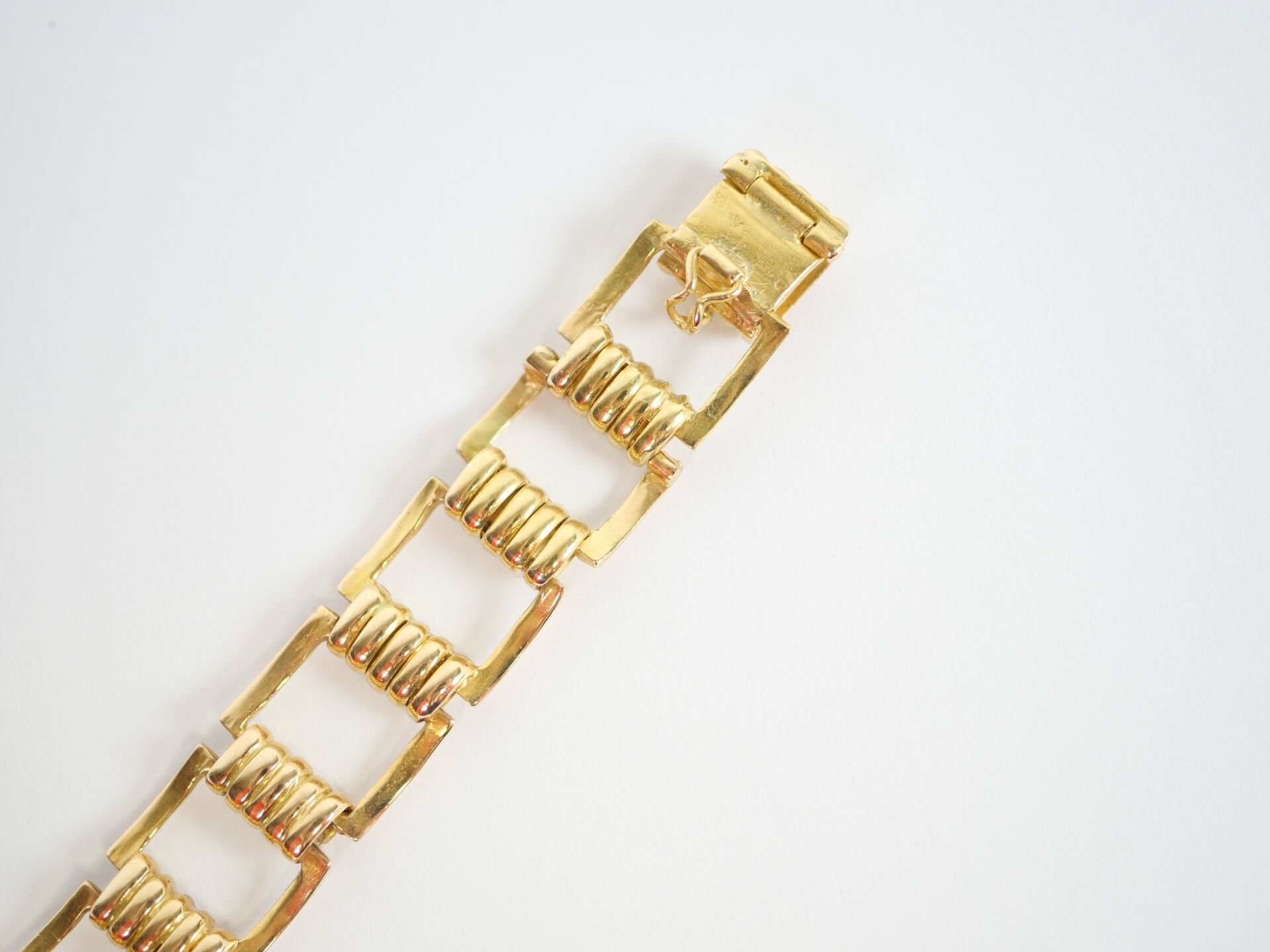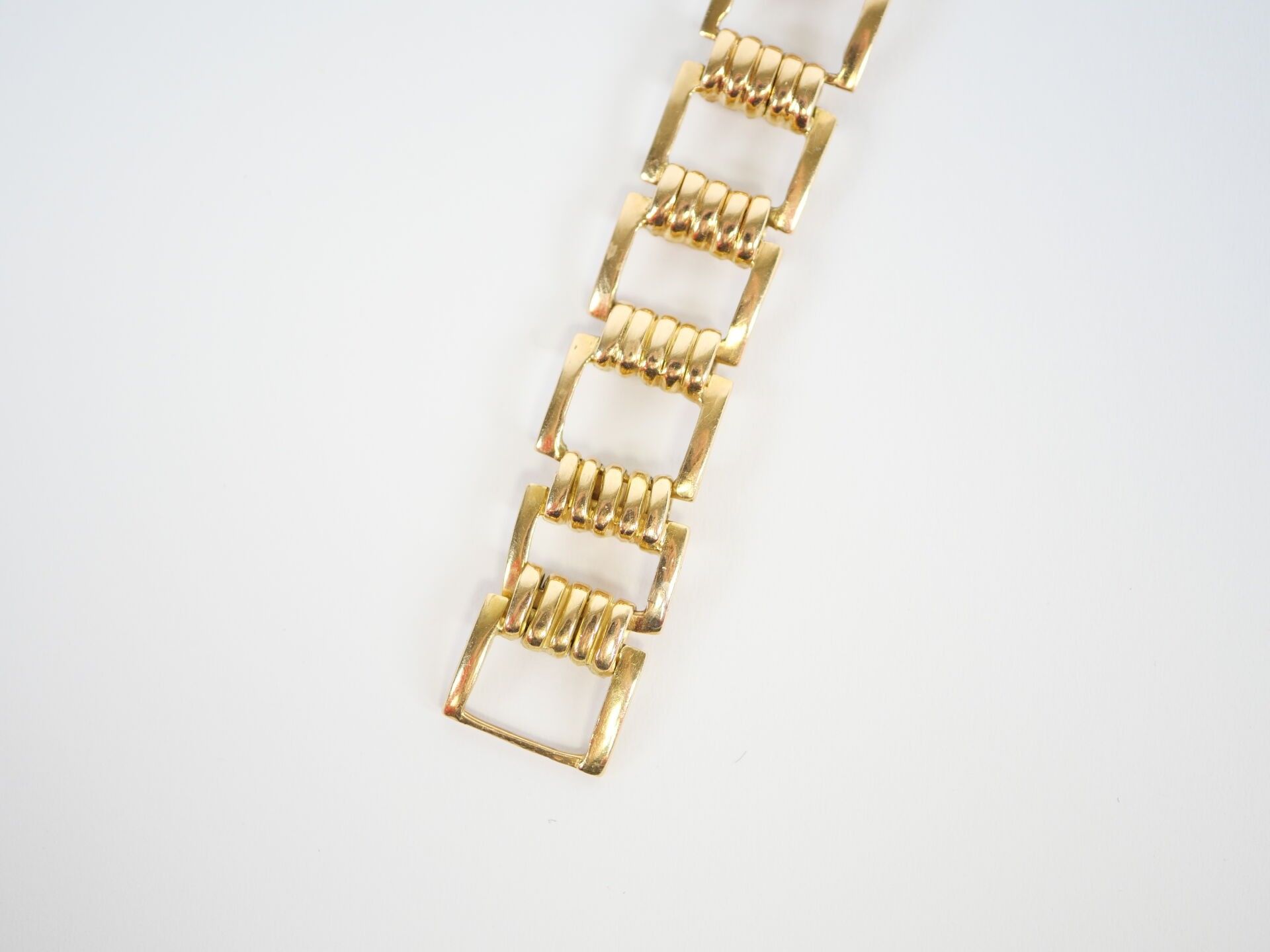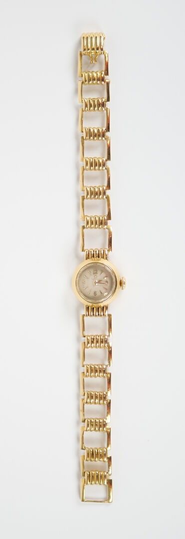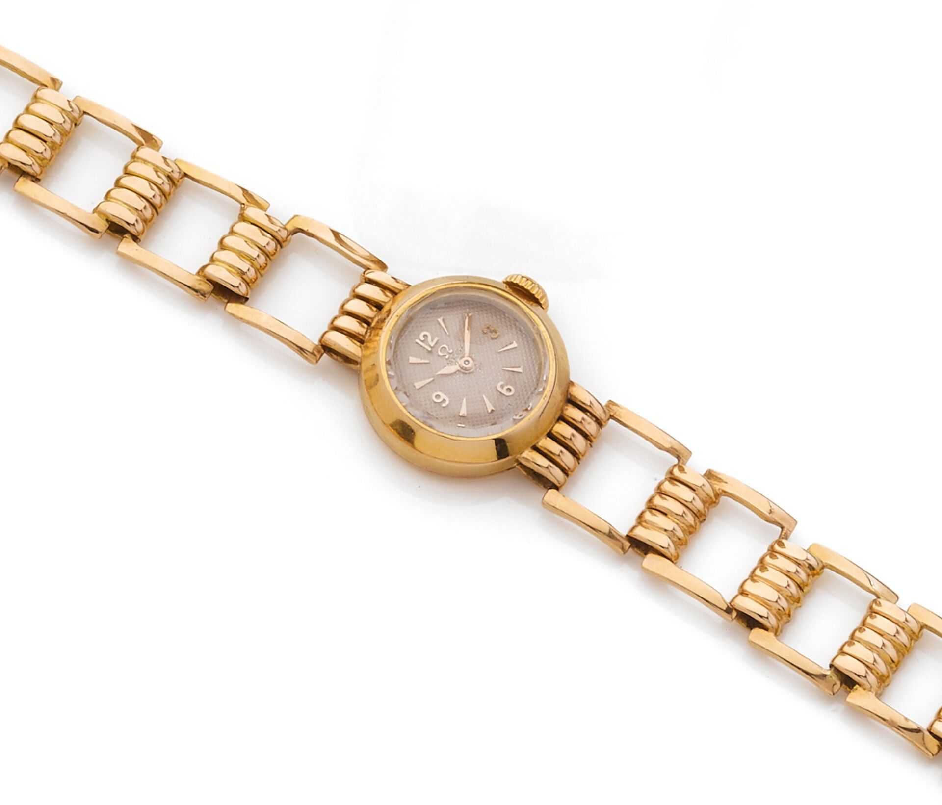 Ladies' watch, the circular case and rectangular openwork link hinged bracelet in 18K (750‰) yellow gold. The mechanical movement with manual winding, the dial guilloché with the hours of the cardinal points in Arabic numerals.