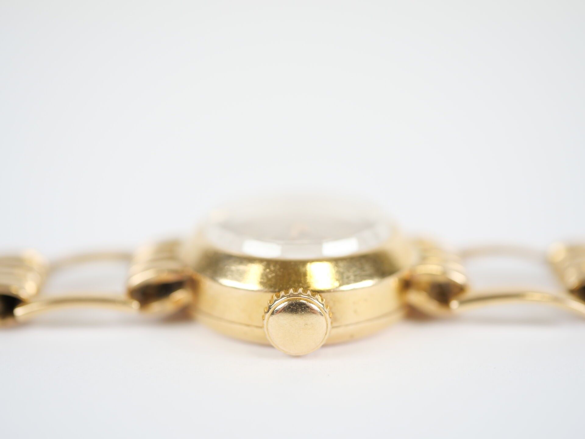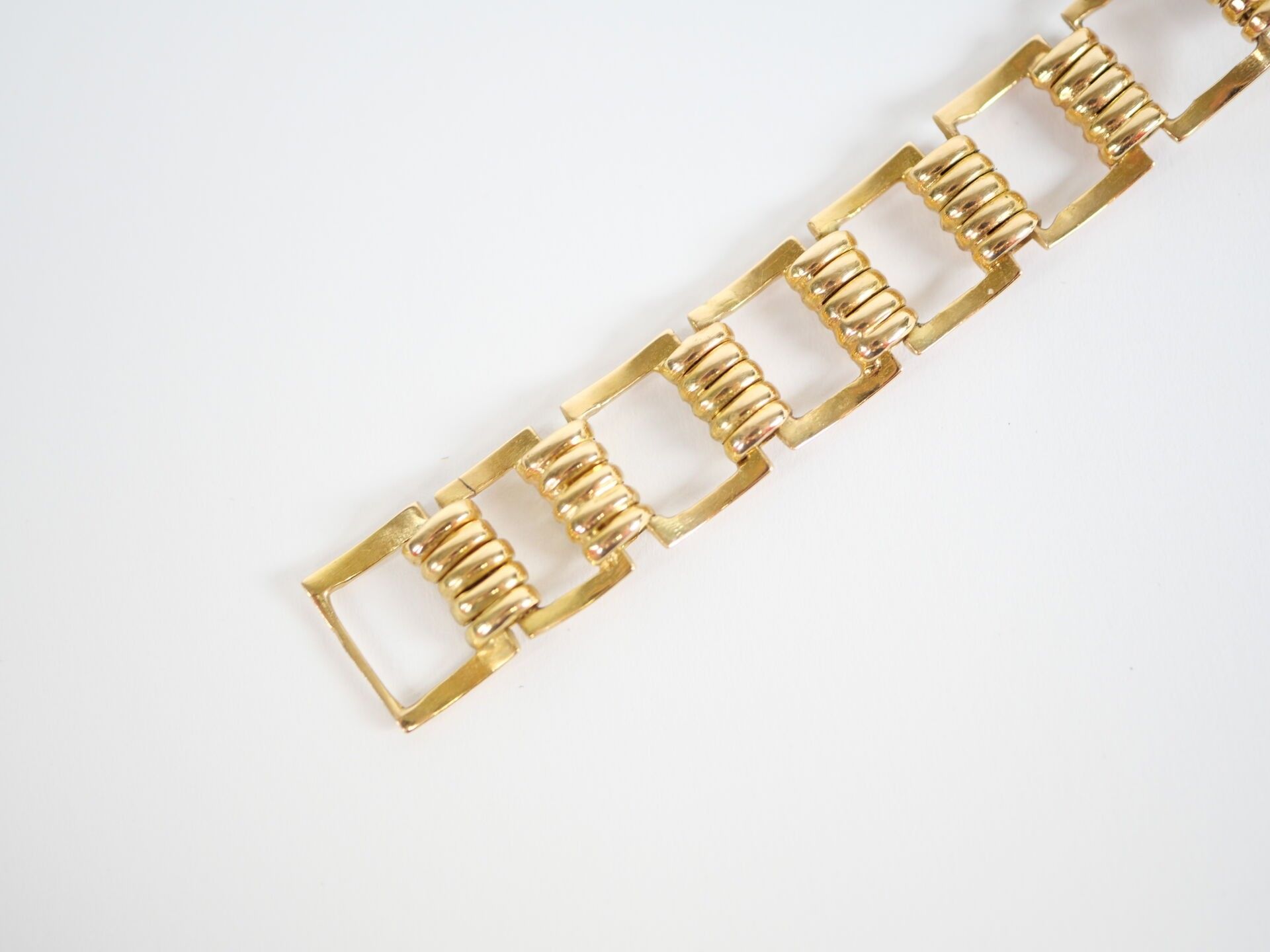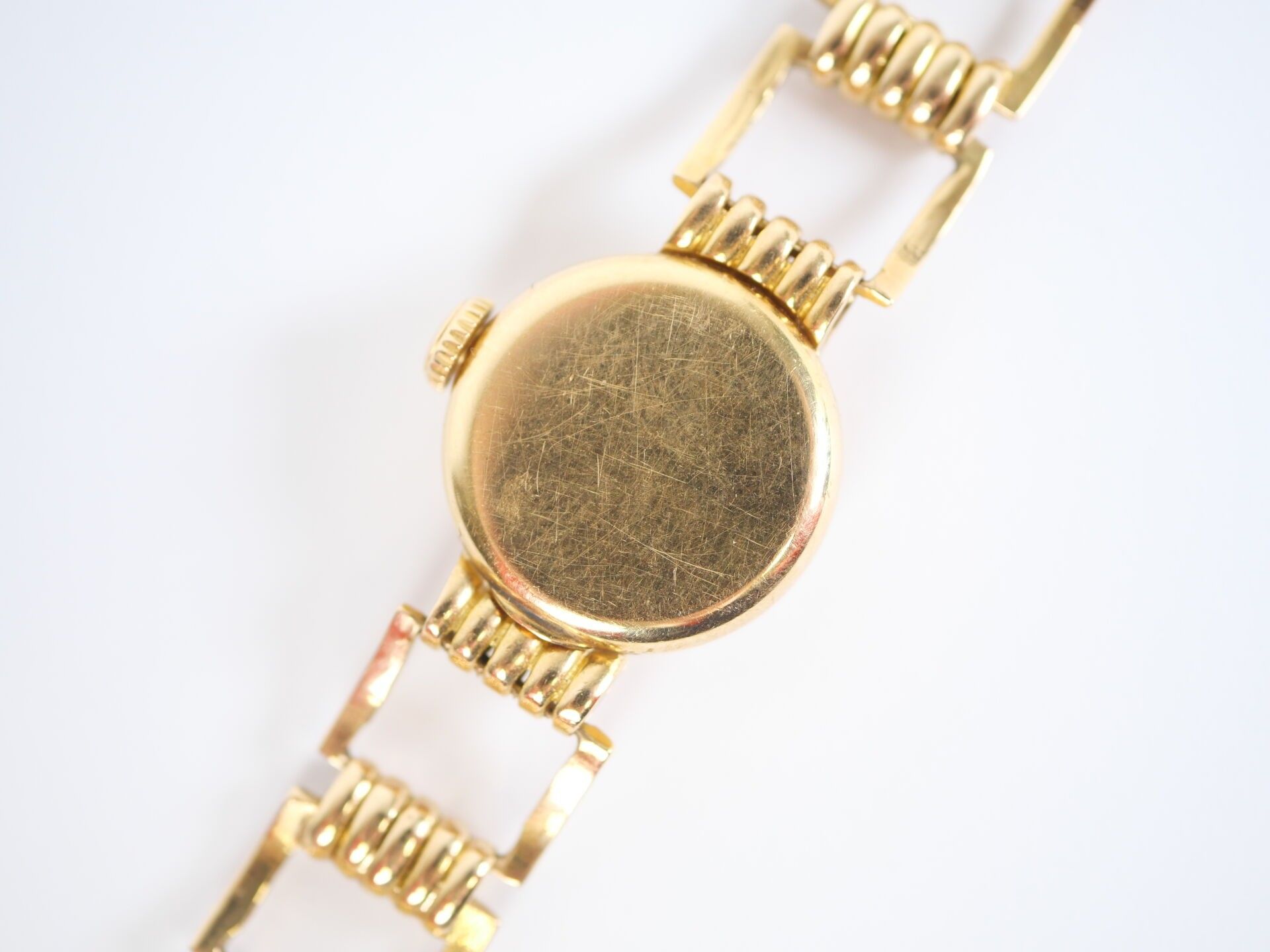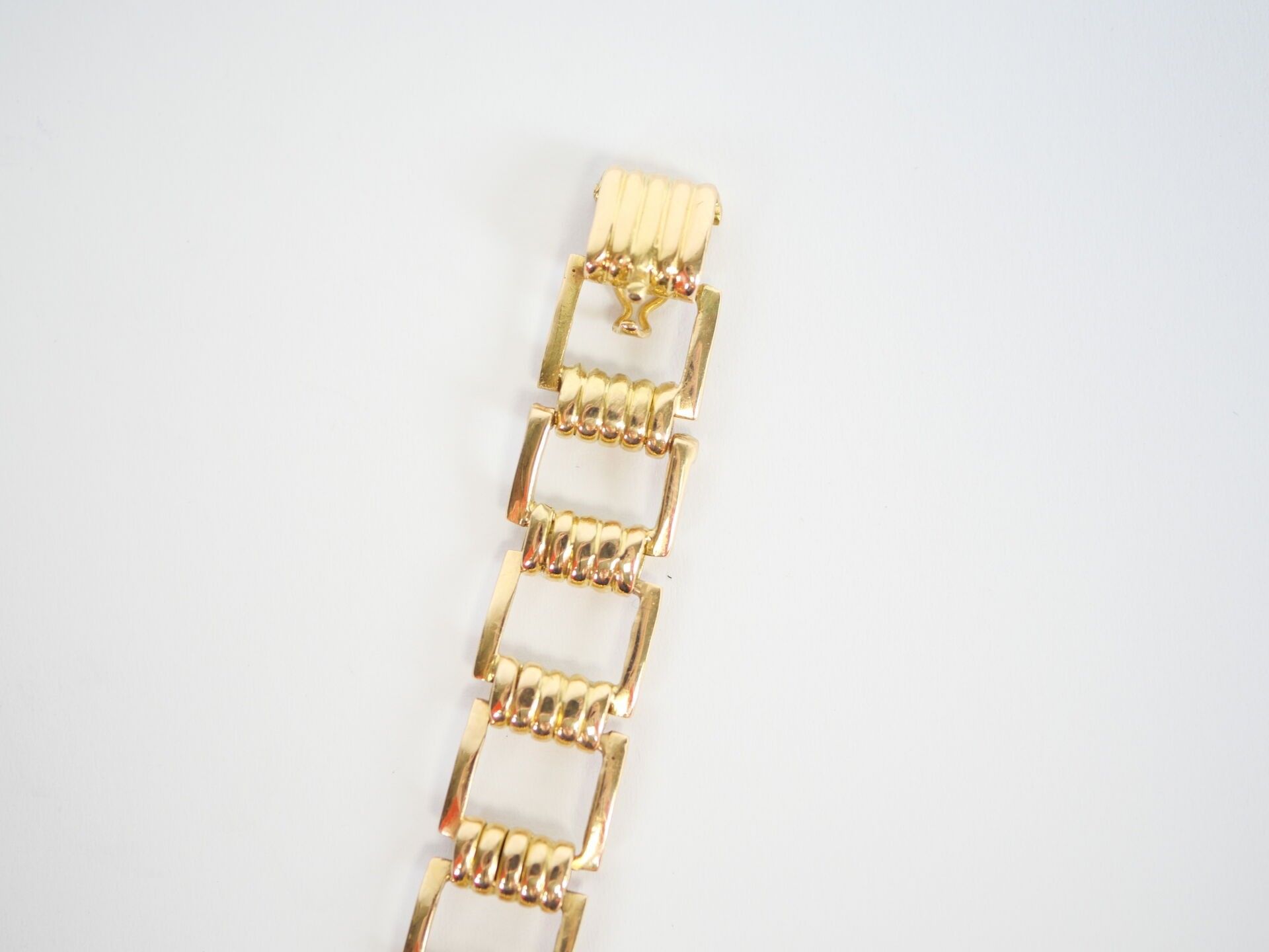 Ladies' watch, the circular case and rectangular openwork link hinged bracelet in 18K (750‰) yellow gold. The mechanical movement with manual winding, the dial guilloché with the hours of the cardinal points in Arabic numerals.