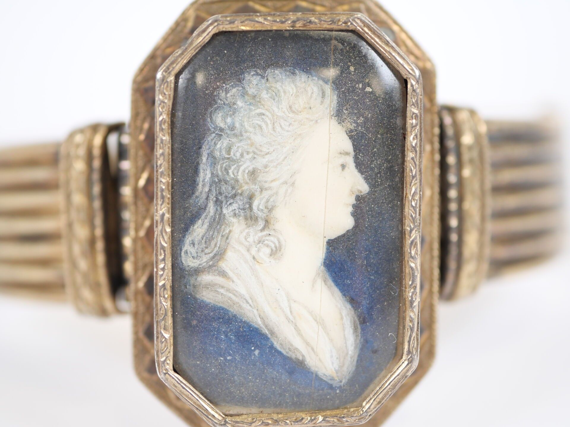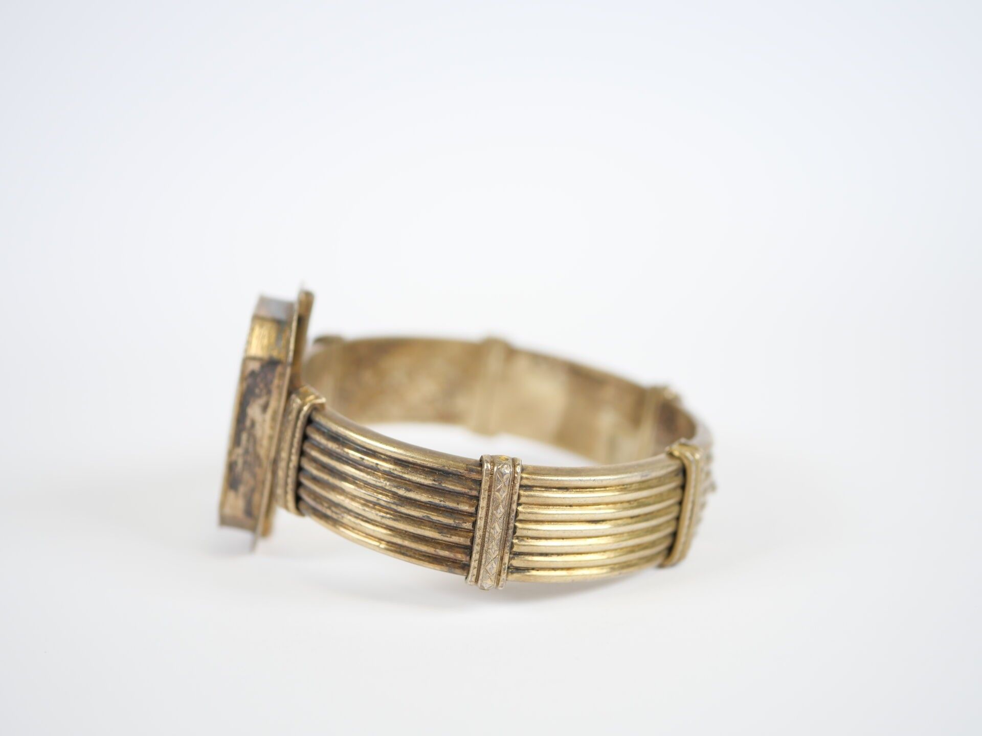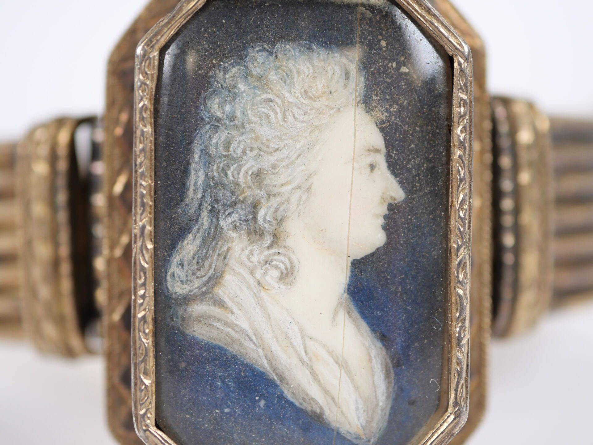 Antique gilt silver articulated bracelet, finely fluted, centred on a late 18th century gouache-painted miniature of a woman's profile against a mother-of-pearl plaque.