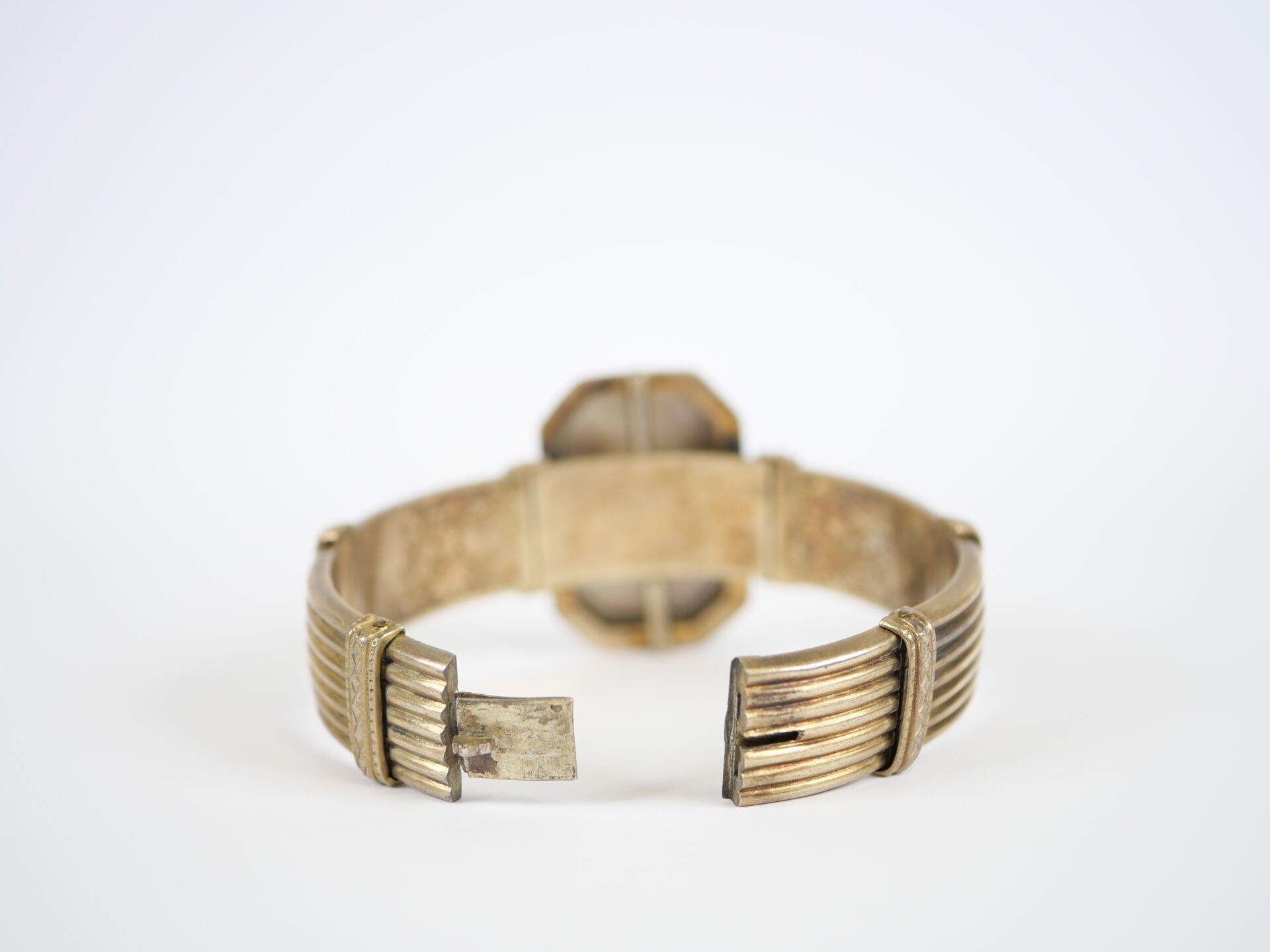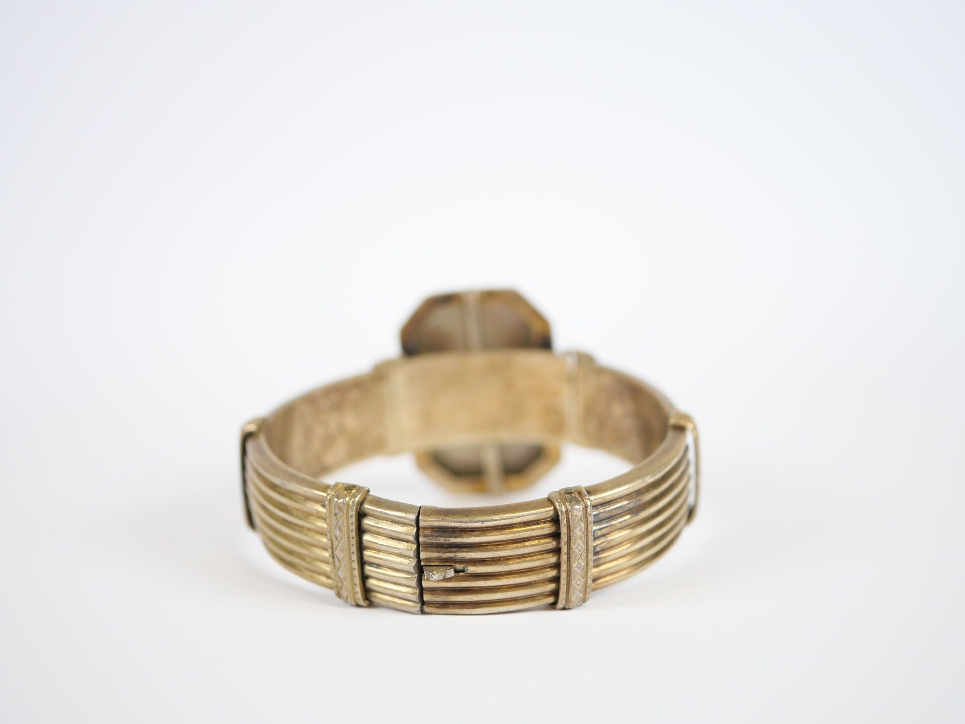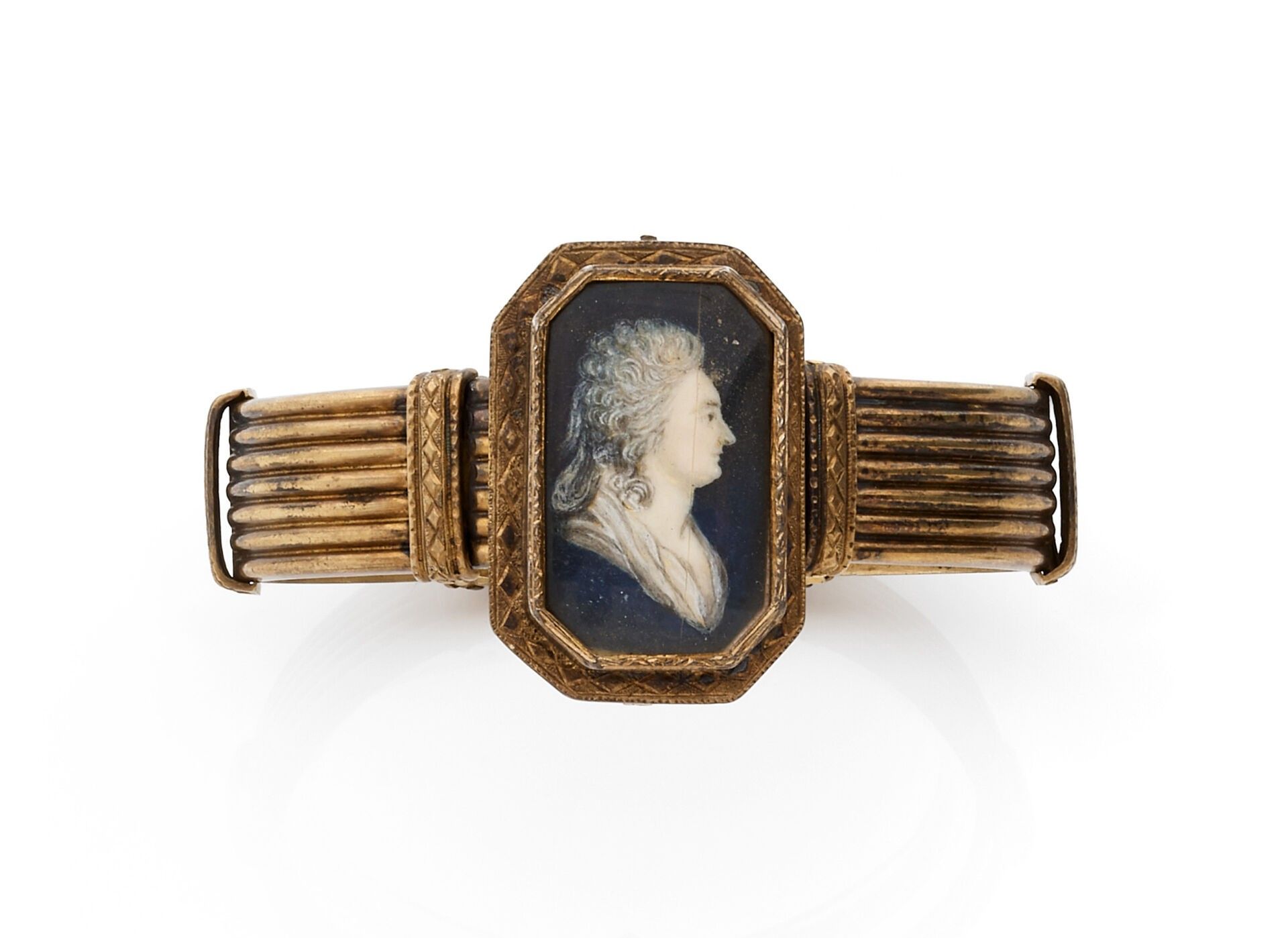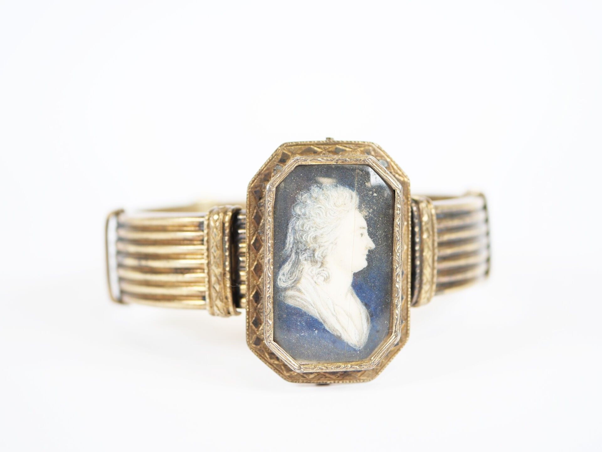 Antique gilt silver articulated bracelet, finely fluted, centred on a late 18th century gouache-painted miniature of a woman's profile against a mother-of-pearl plaque.