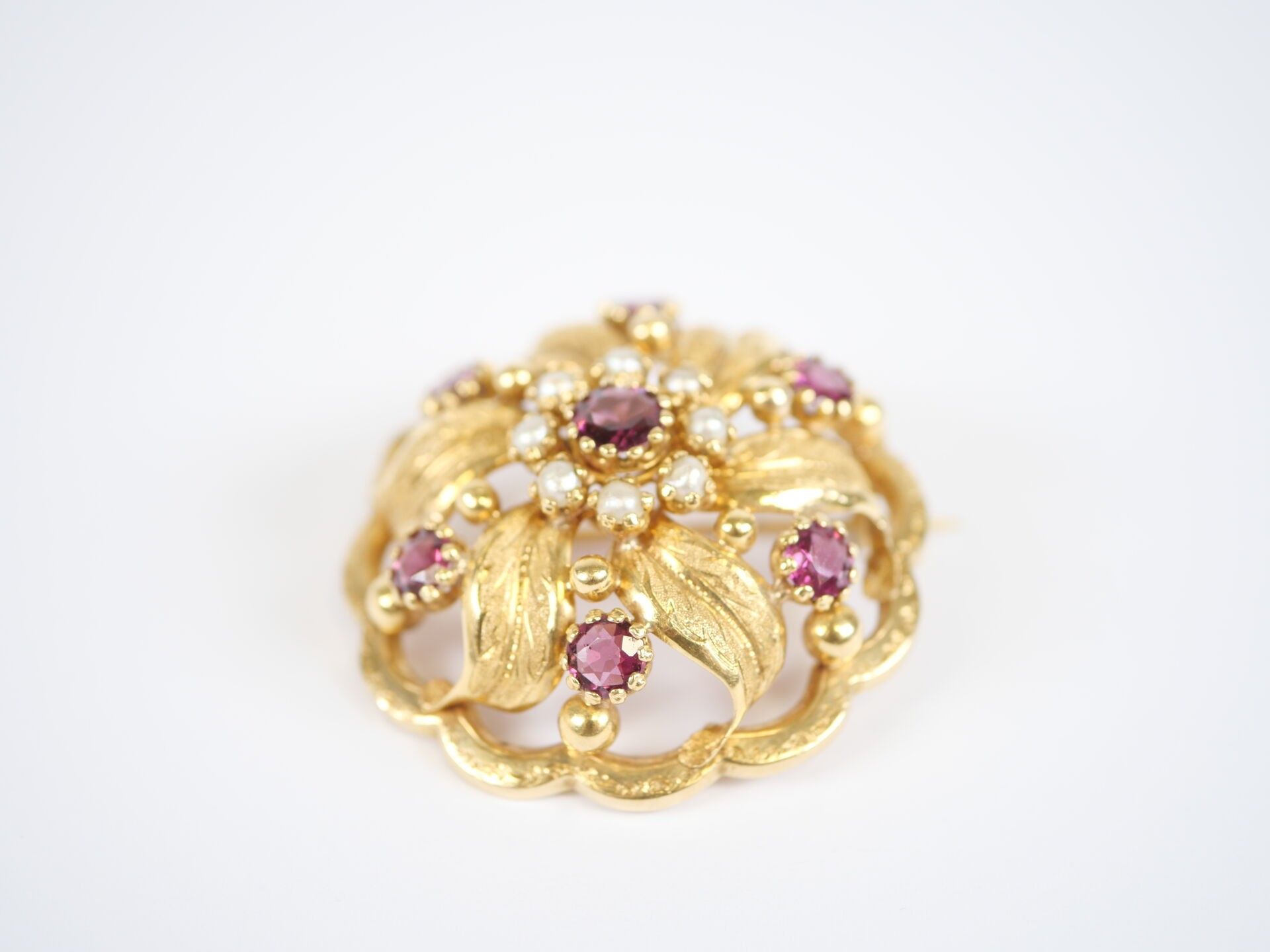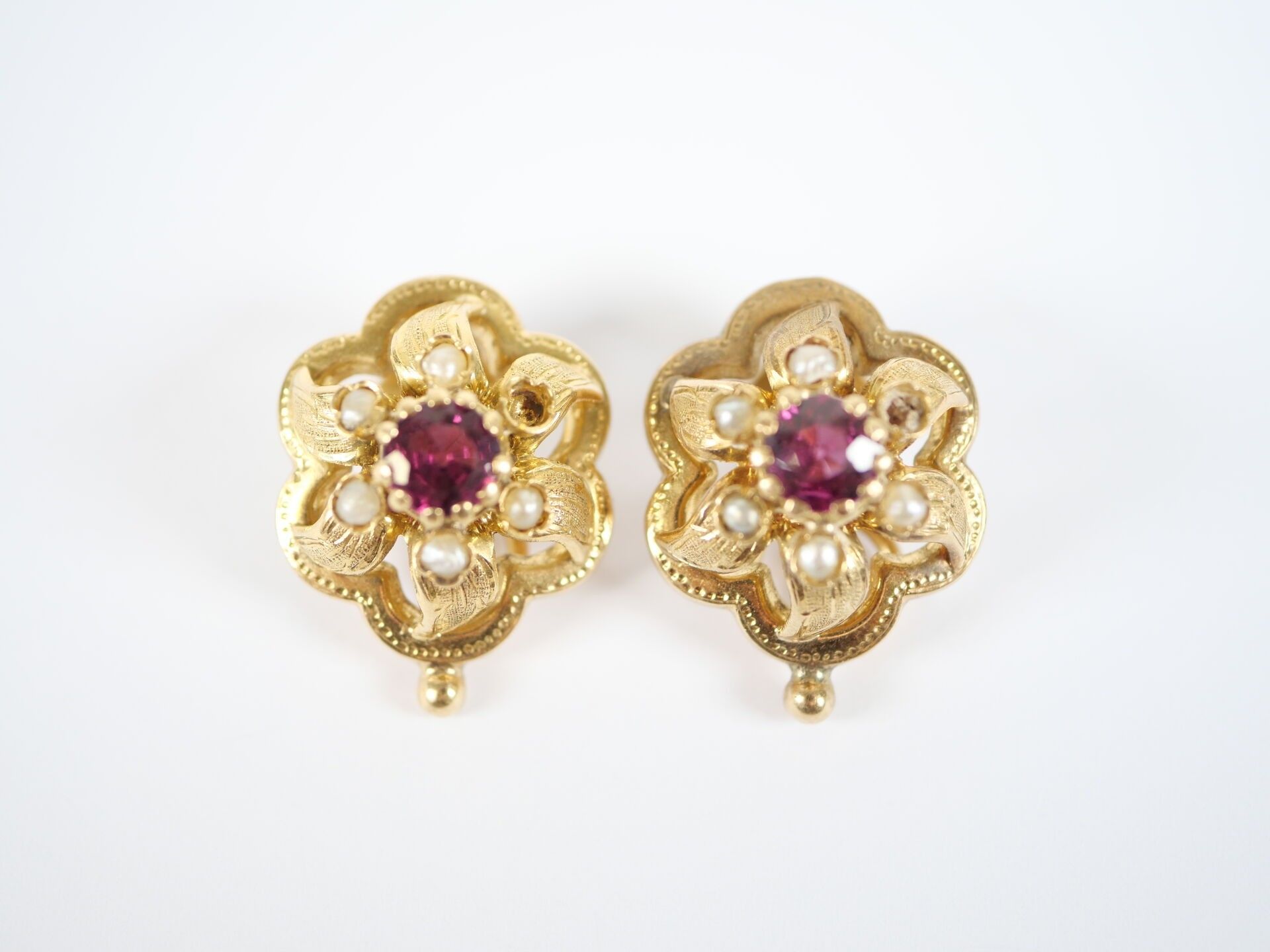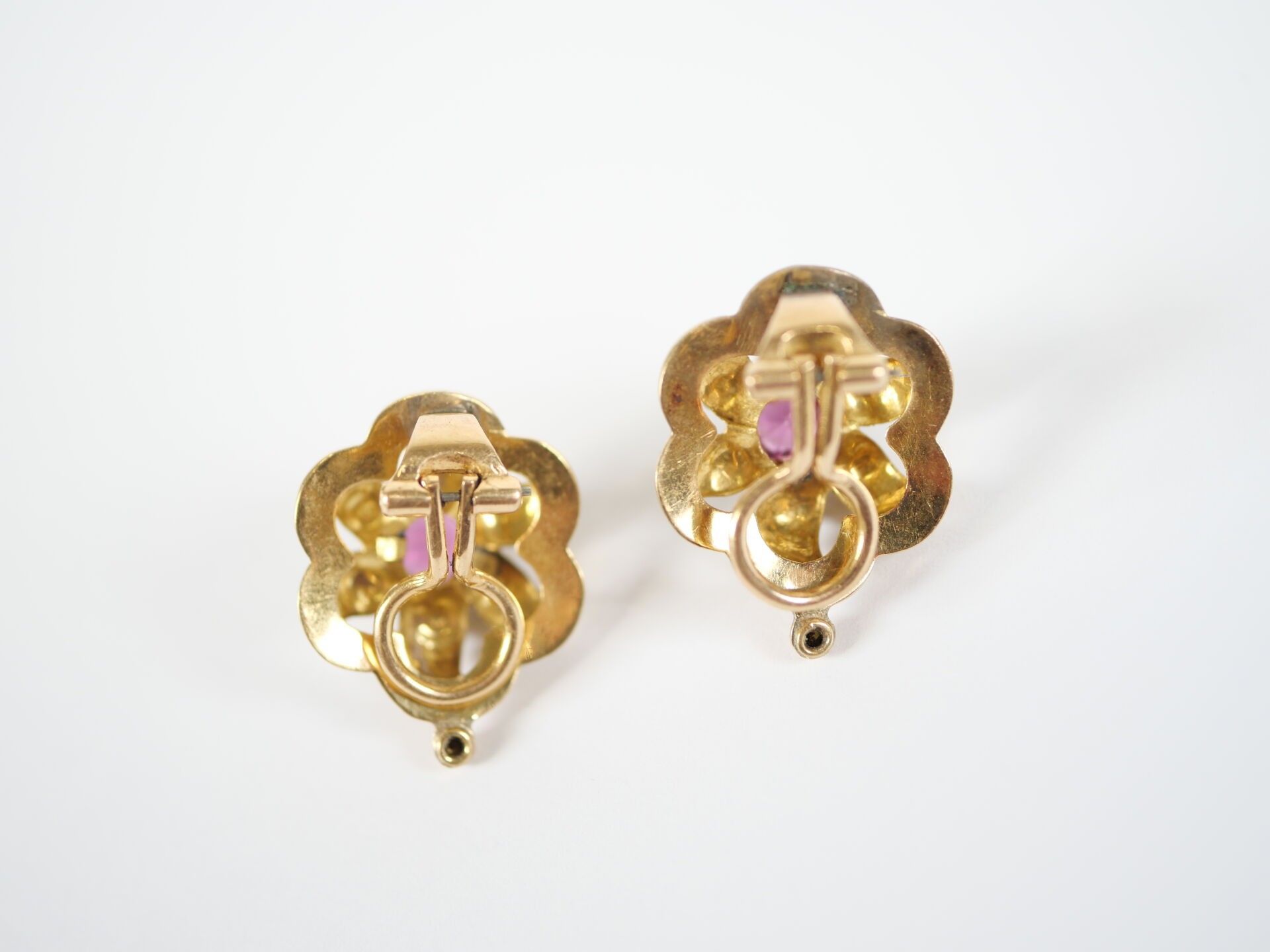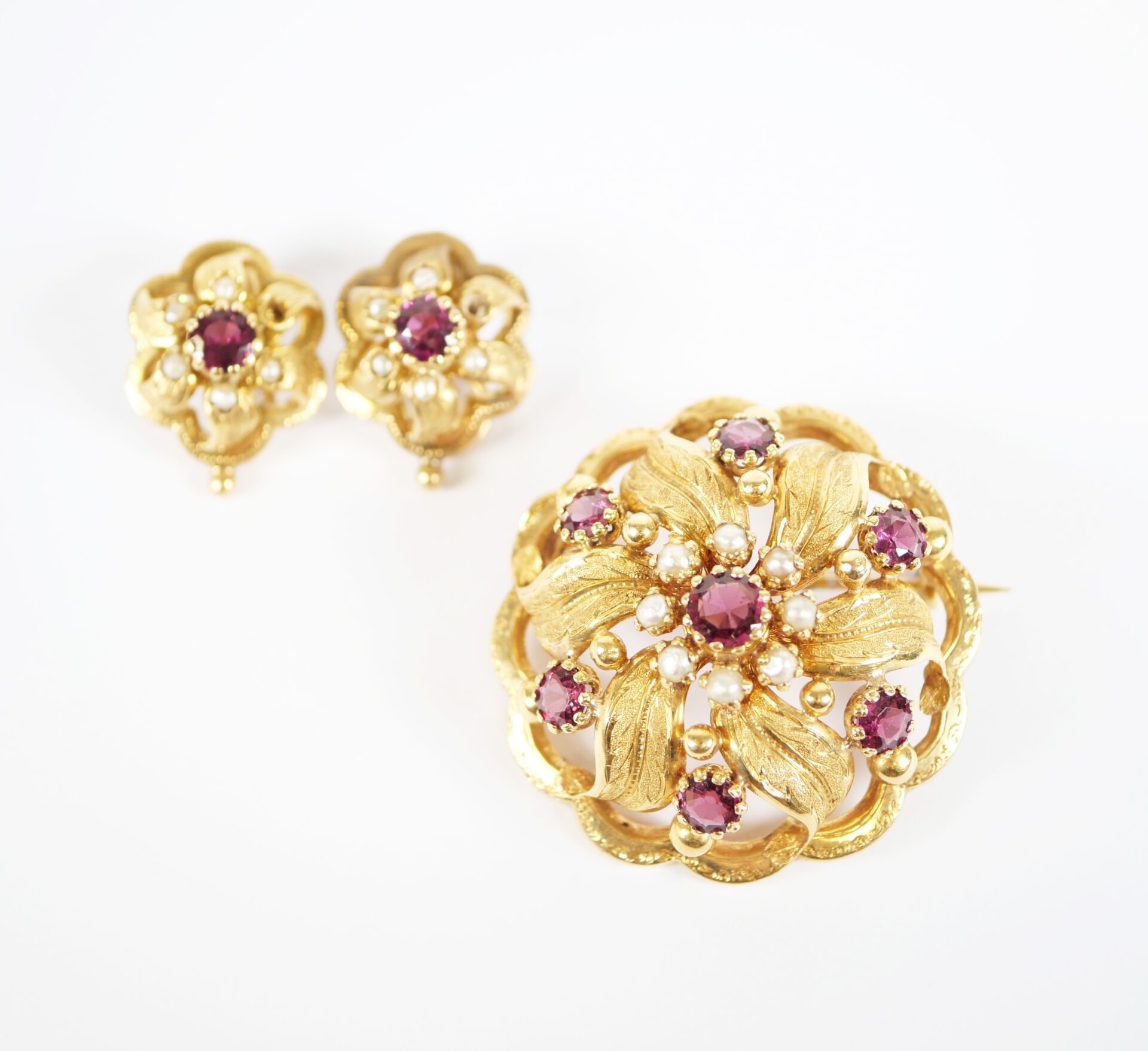 Set in 18K (750‰) yellow gold decorated with stylised flowers, adorned with numerous faceted round amethysts and fine pearls mounted in claw-sets, comprising a brooch and a pair of ear clips.