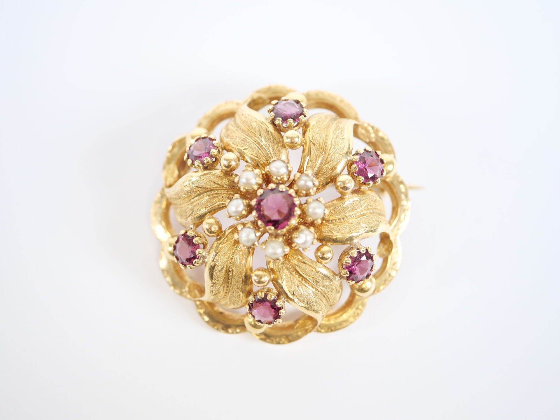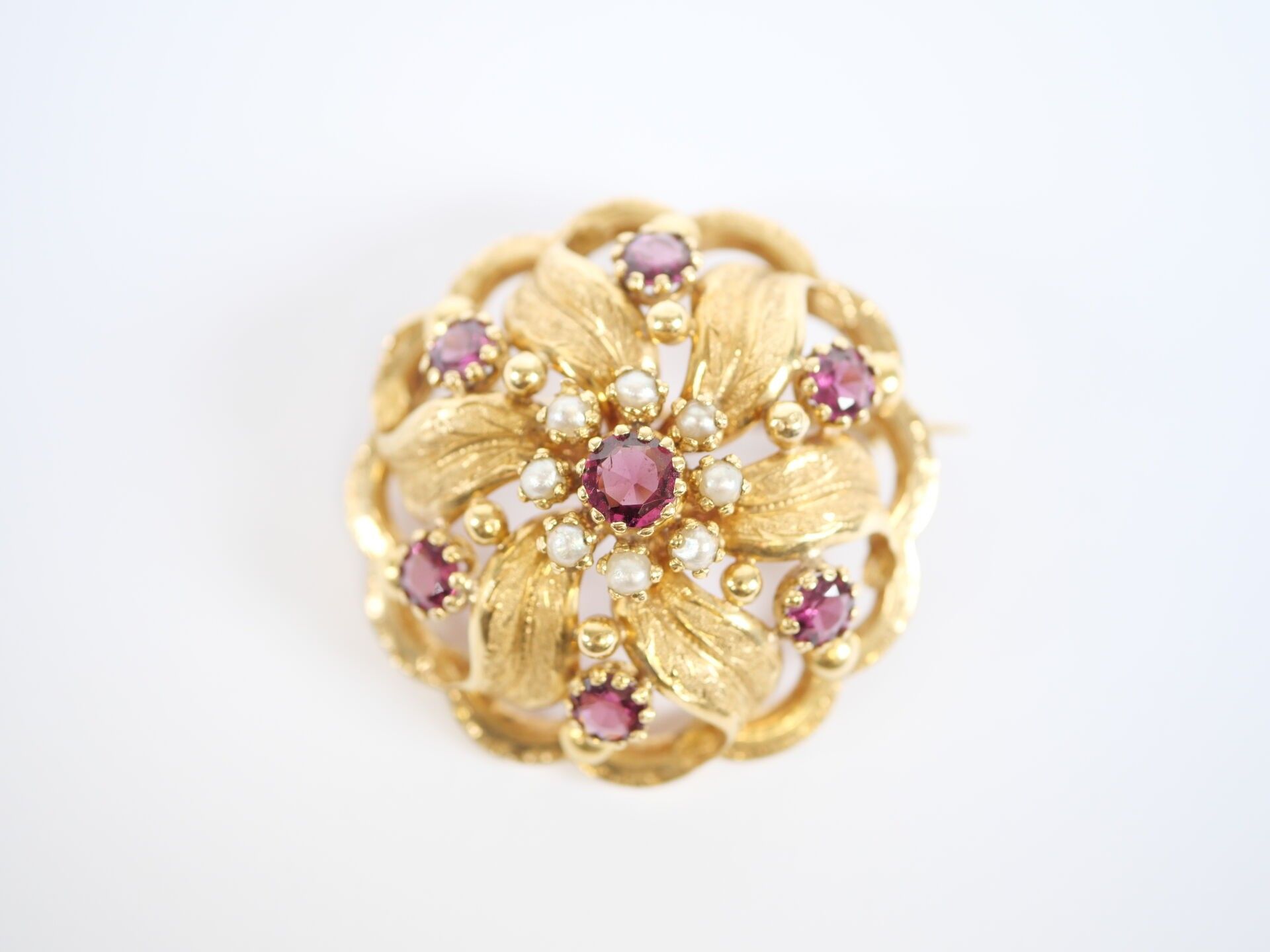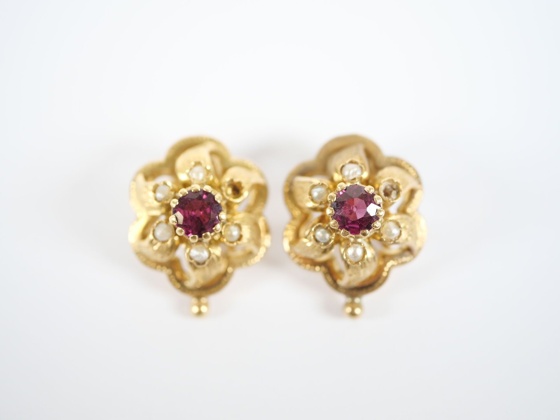 Set in 18K (750‰) yellow gold decorated with stylised flowers, adorned with numerous faceted round amethysts and fine pearls mounted in claw-sets, comprising a brooch and a pair of ear clips.