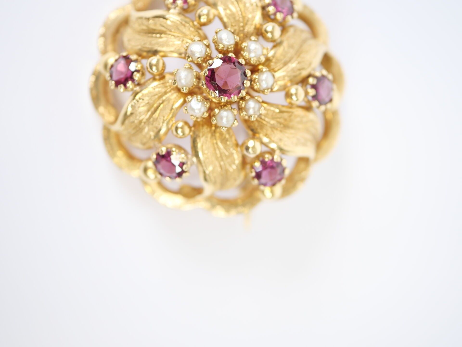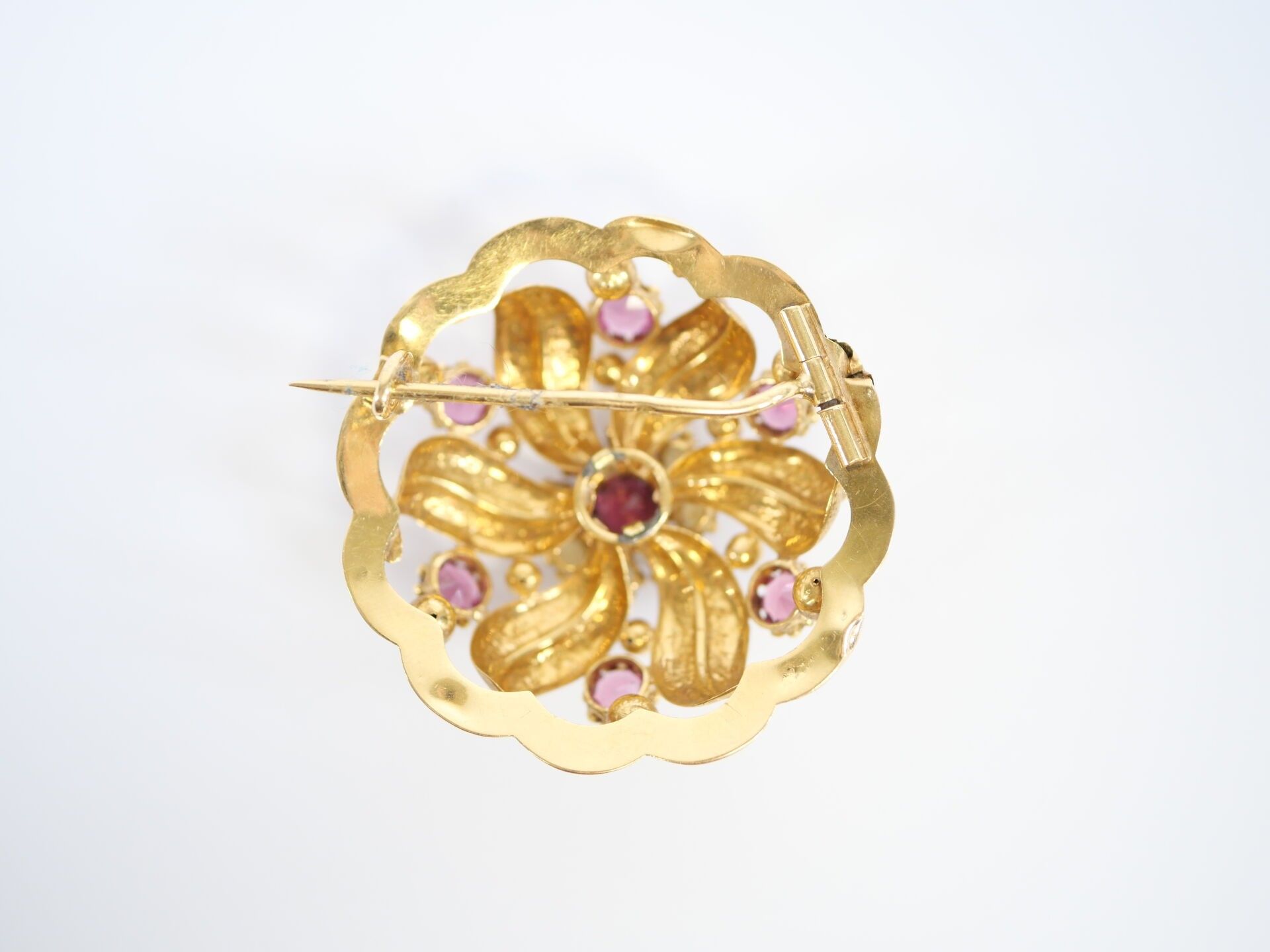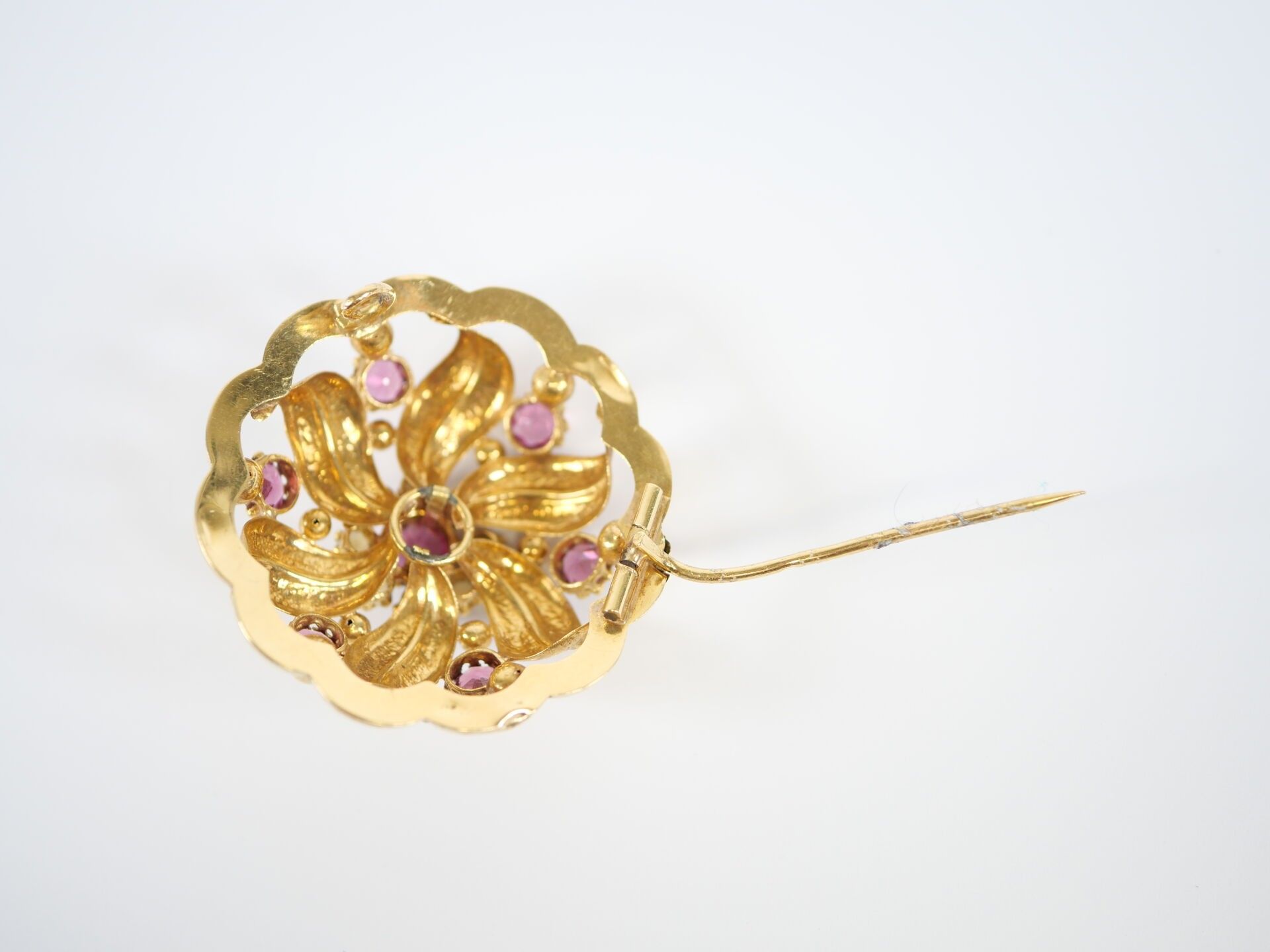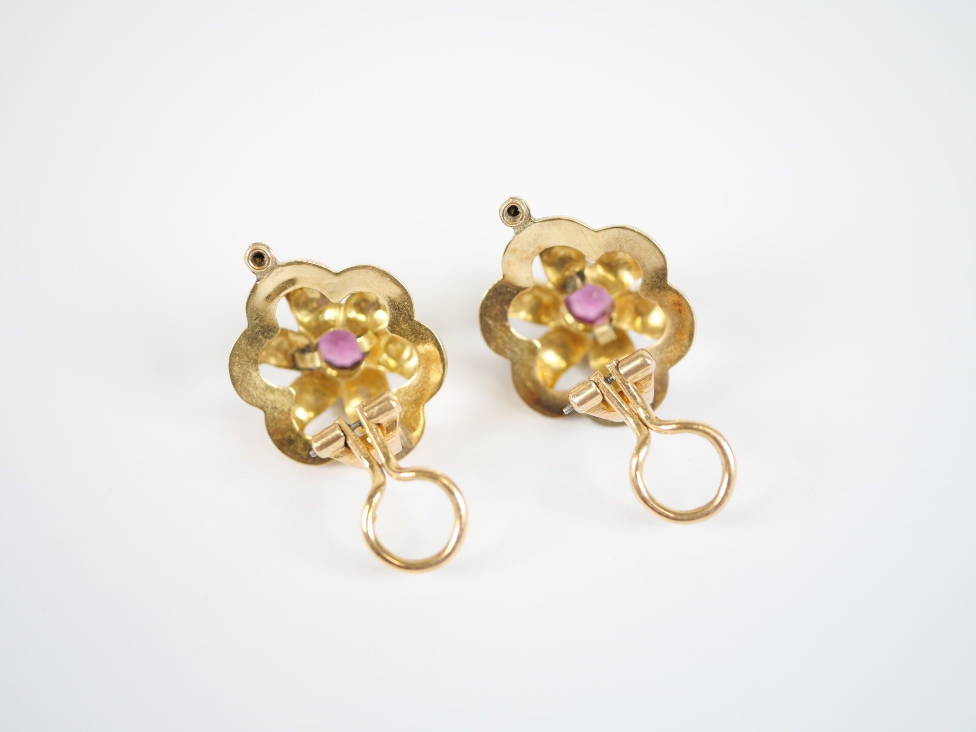 Set in 18K (750‰) yellow gold decorated with stylised flowers, adorned with numerous faceted round amethysts and fine pearls mounted in claw-sets, comprising a brooch and a pair of ear clips.