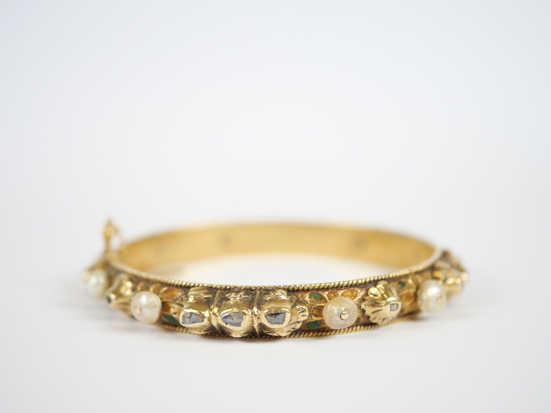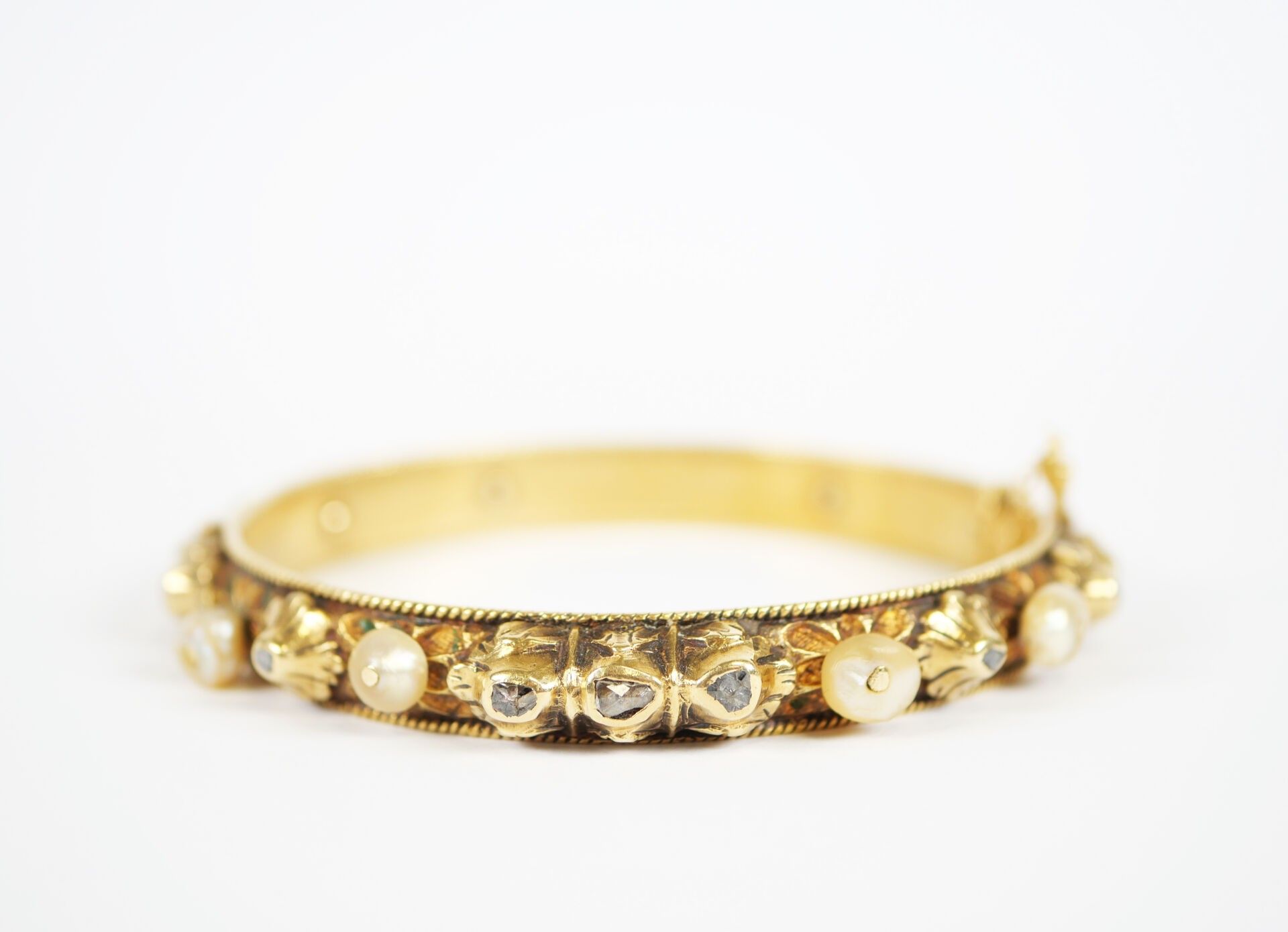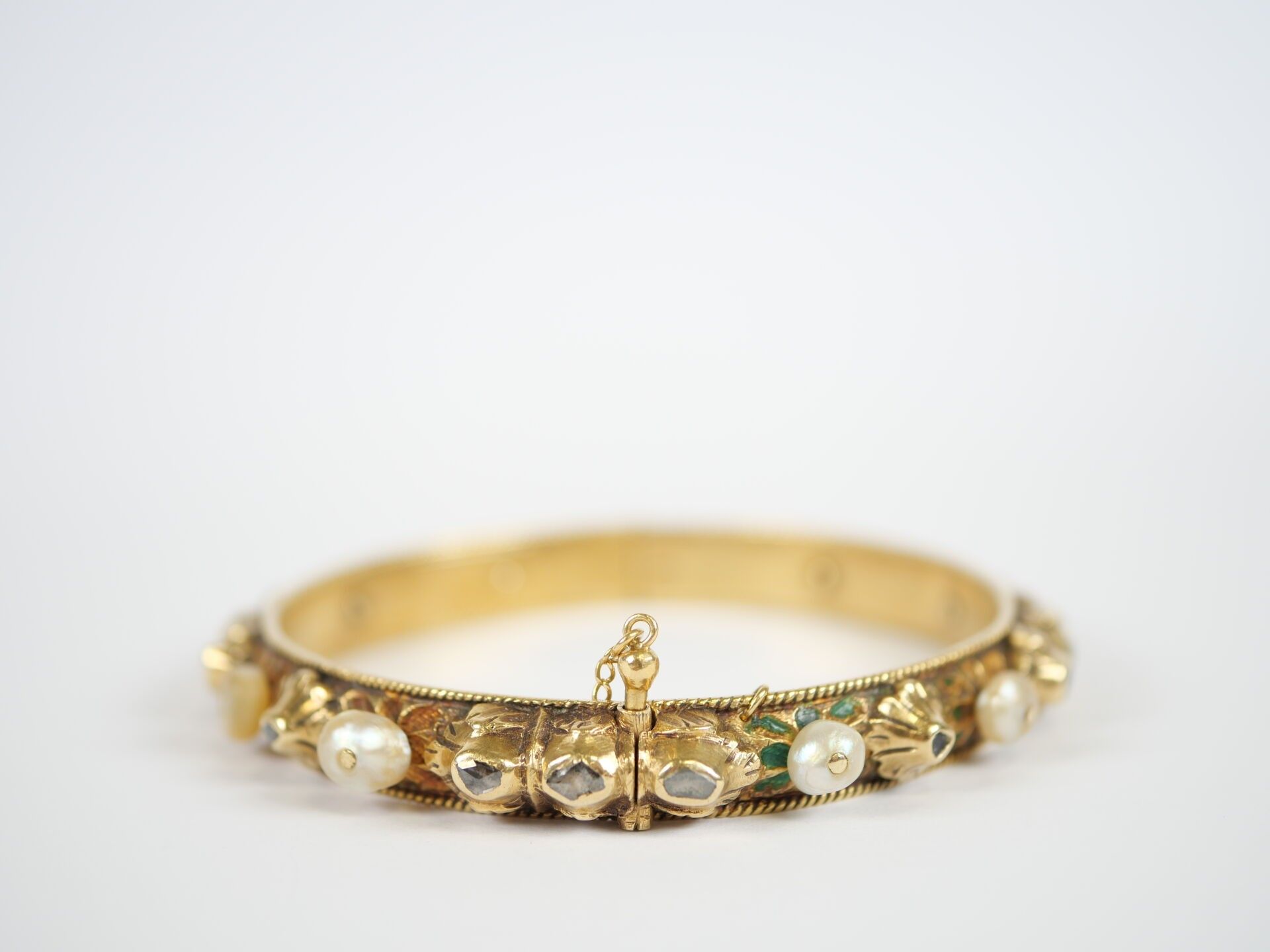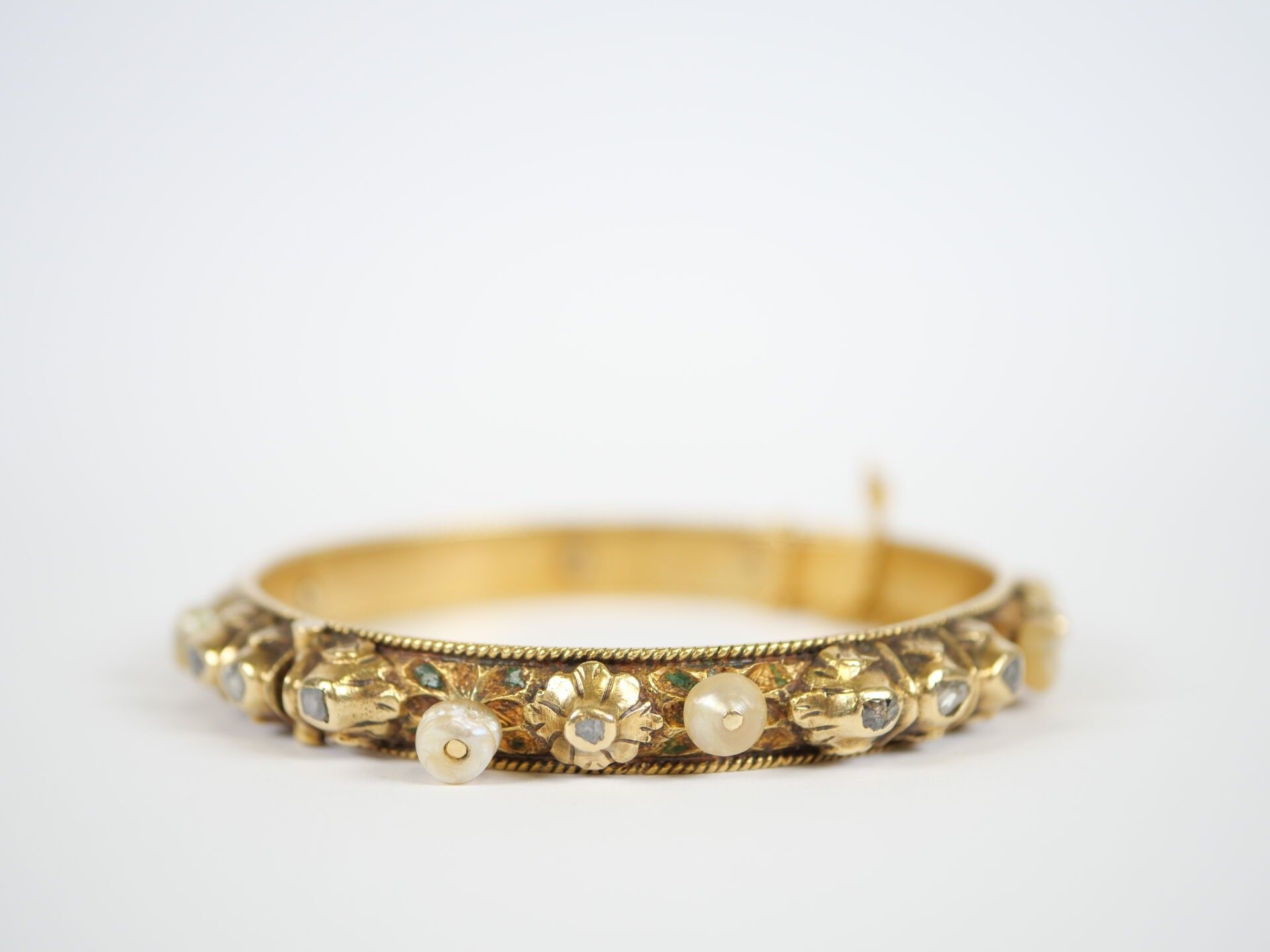 Articulated bracelet in 14K yellow gold (585‰) with finely chased decoration of floral and foliate motifs formerly enamelled polychrome, embellished with baroque pearls alternated with old-cut diamonds mounted in a closed setting. Bayonet clasp.