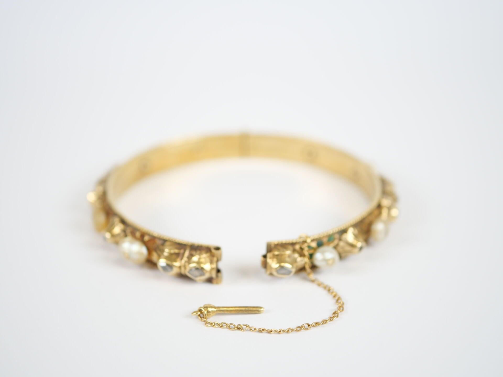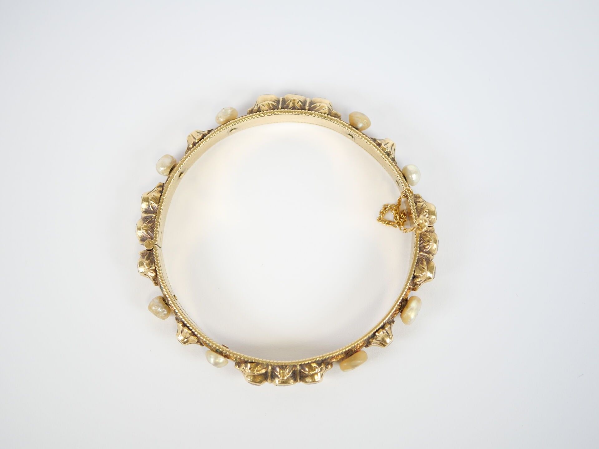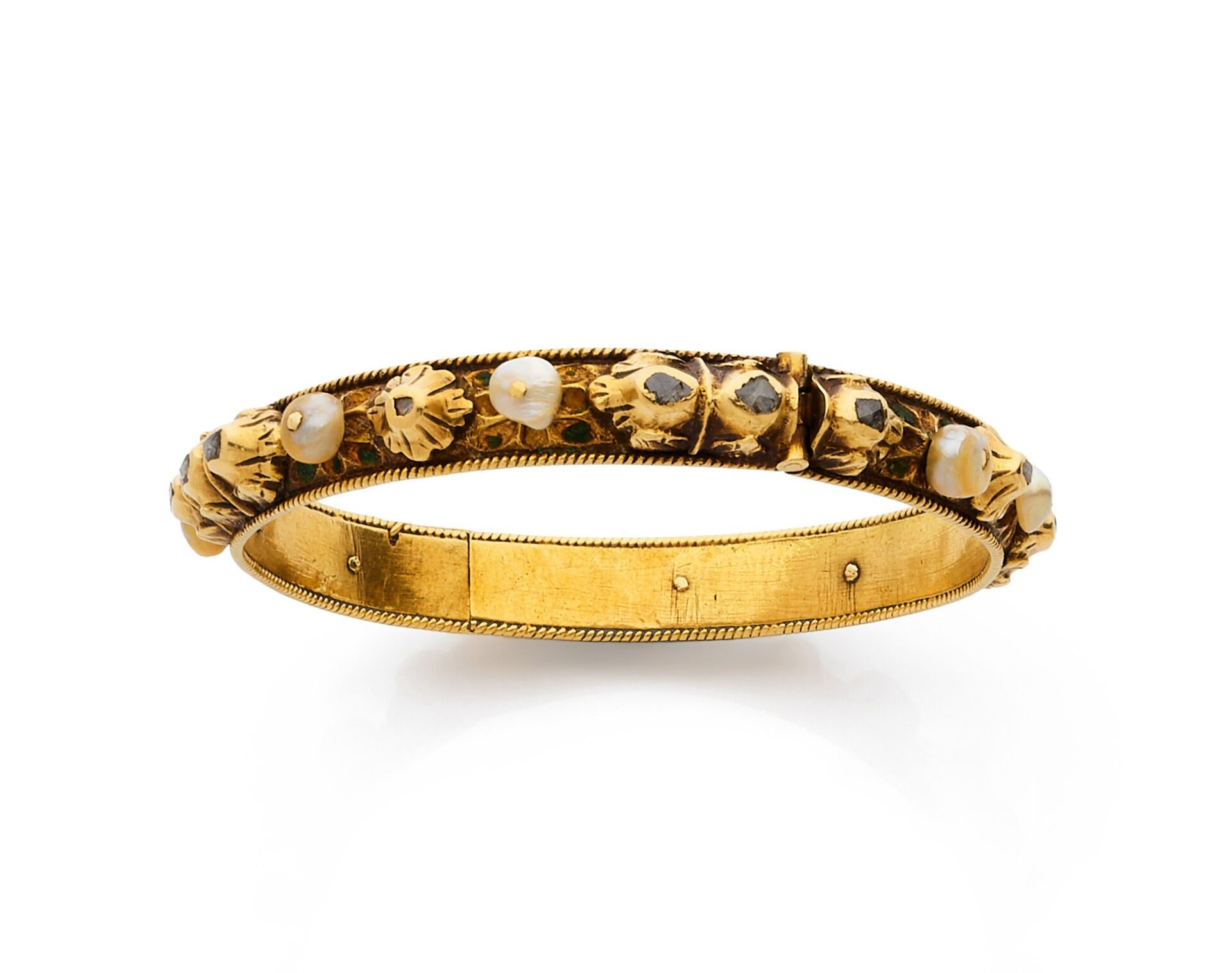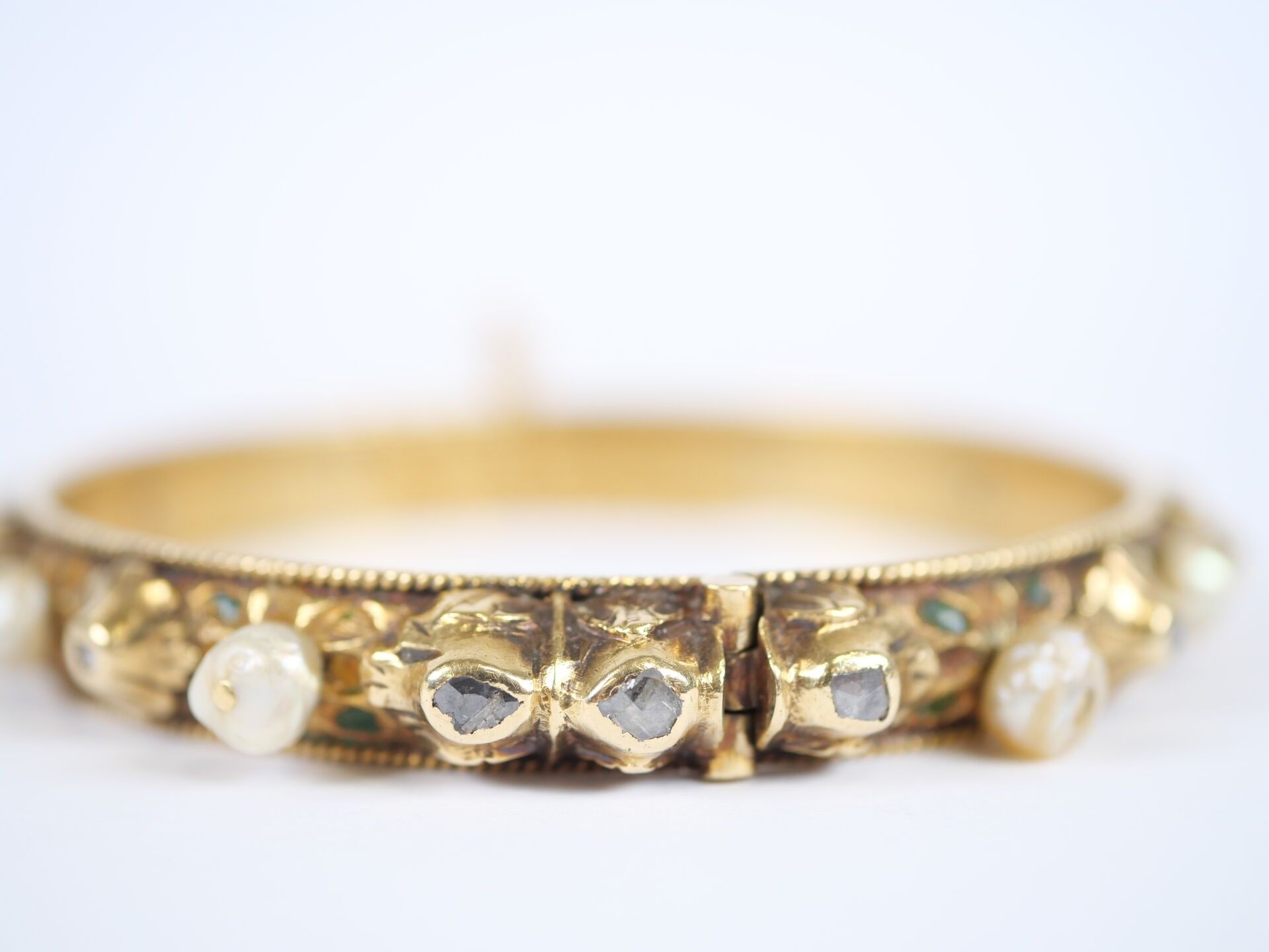 Articulated bracelet in 14K yellow gold (585‰) with finely chased decoration of floral and foliate motifs formerly enamelled polychrome, embellished with baroque pearls alternated with old-cut diamonds mounted in a closed setting. Bayonet clasp.