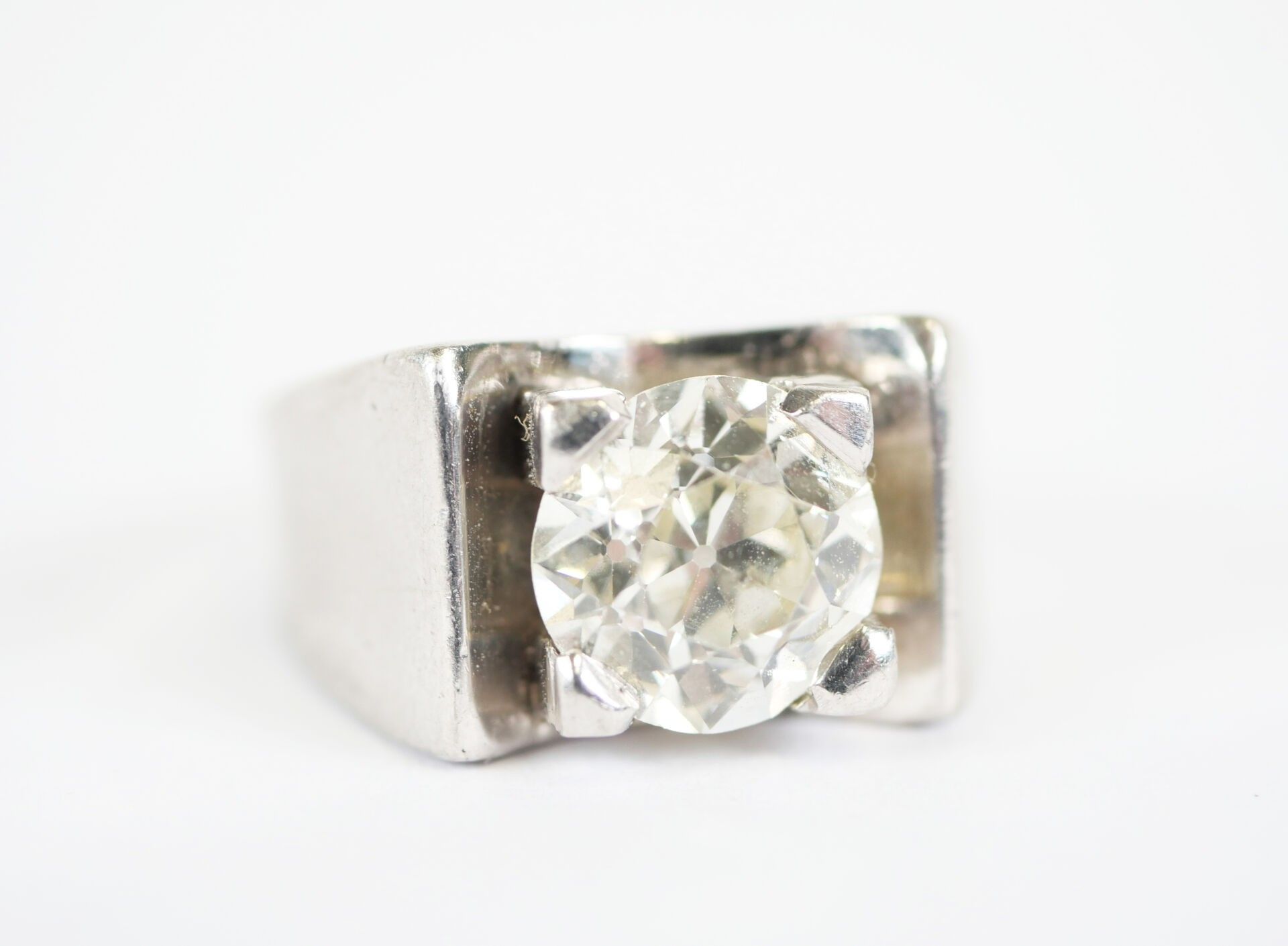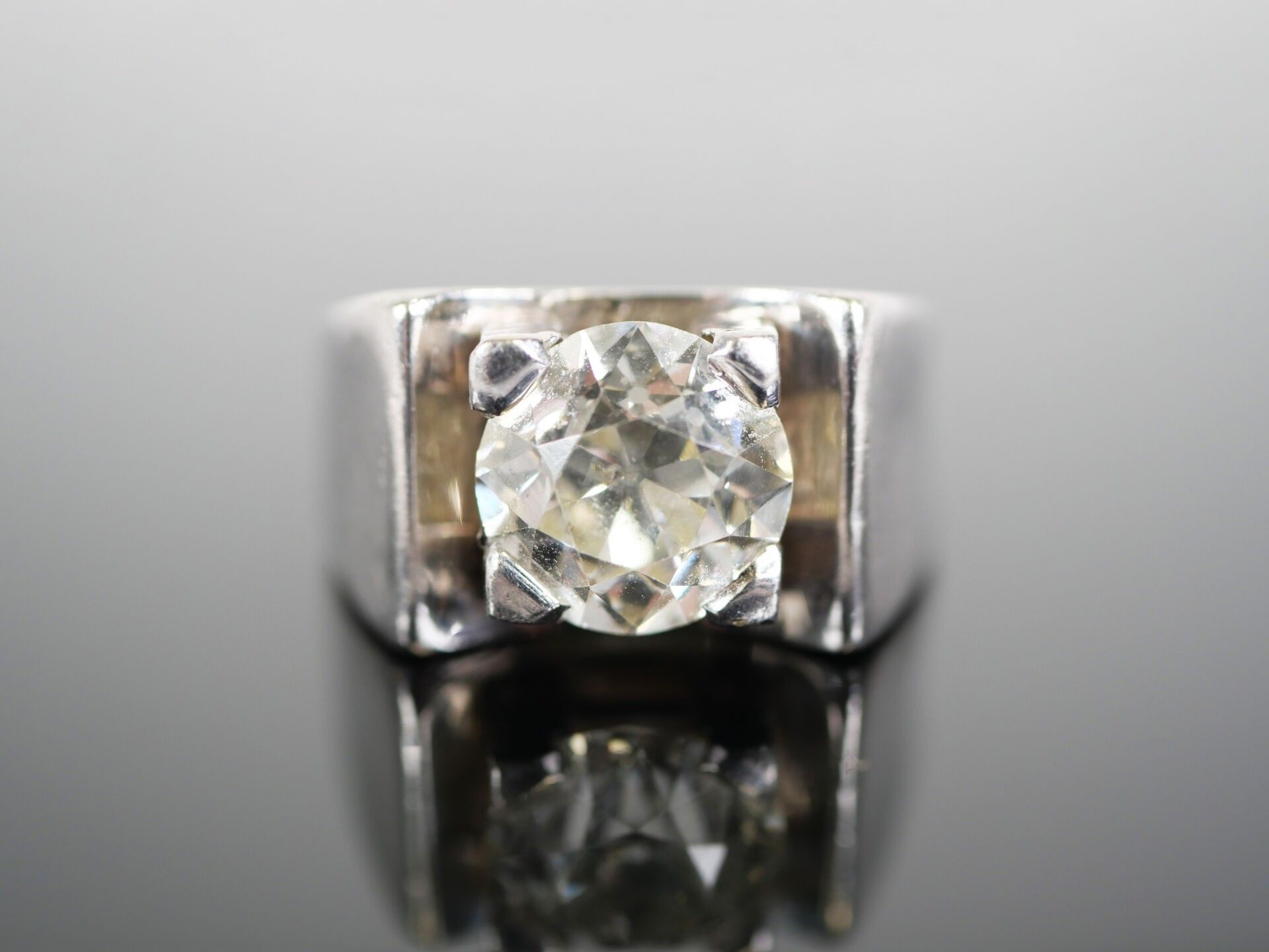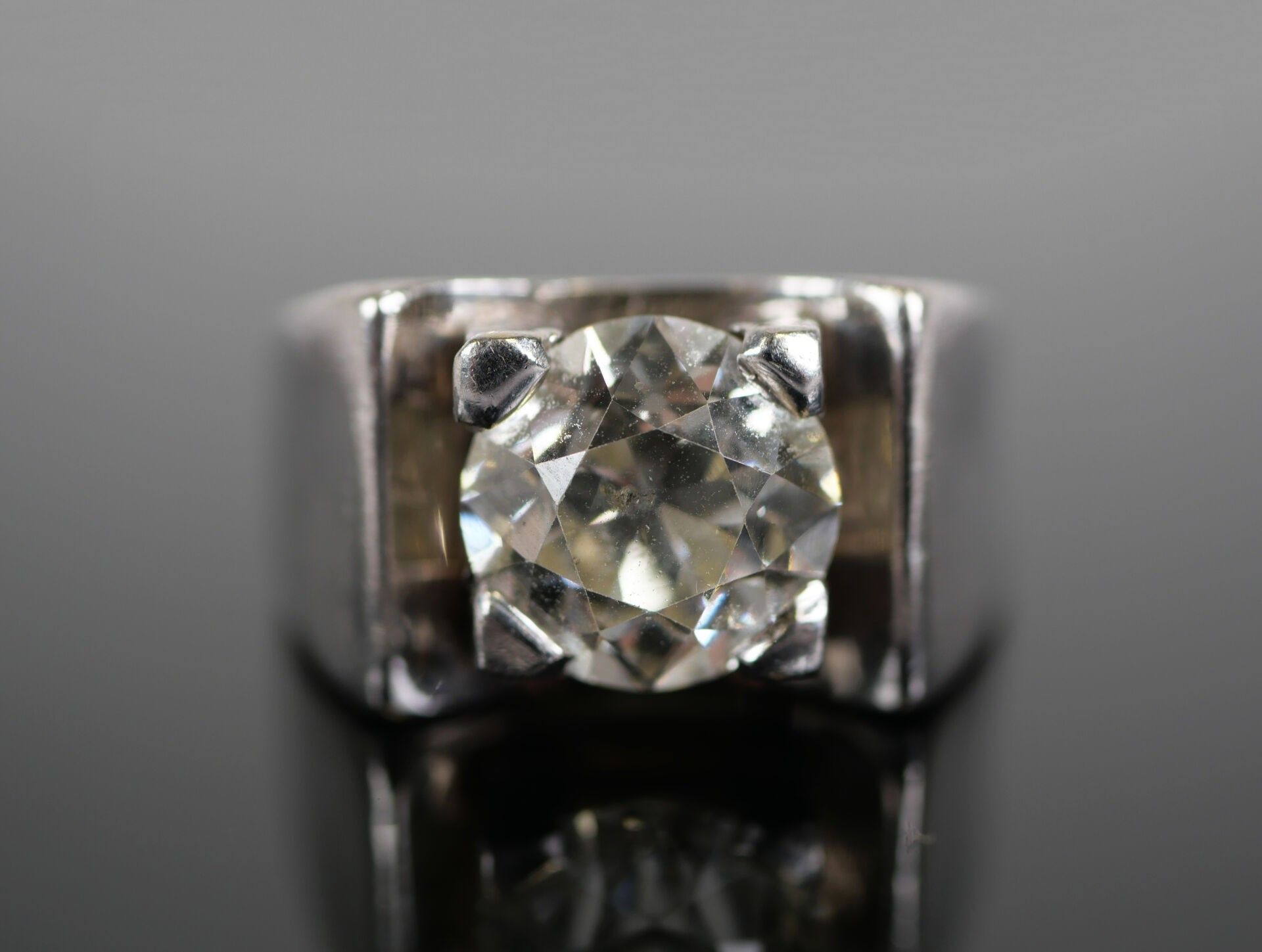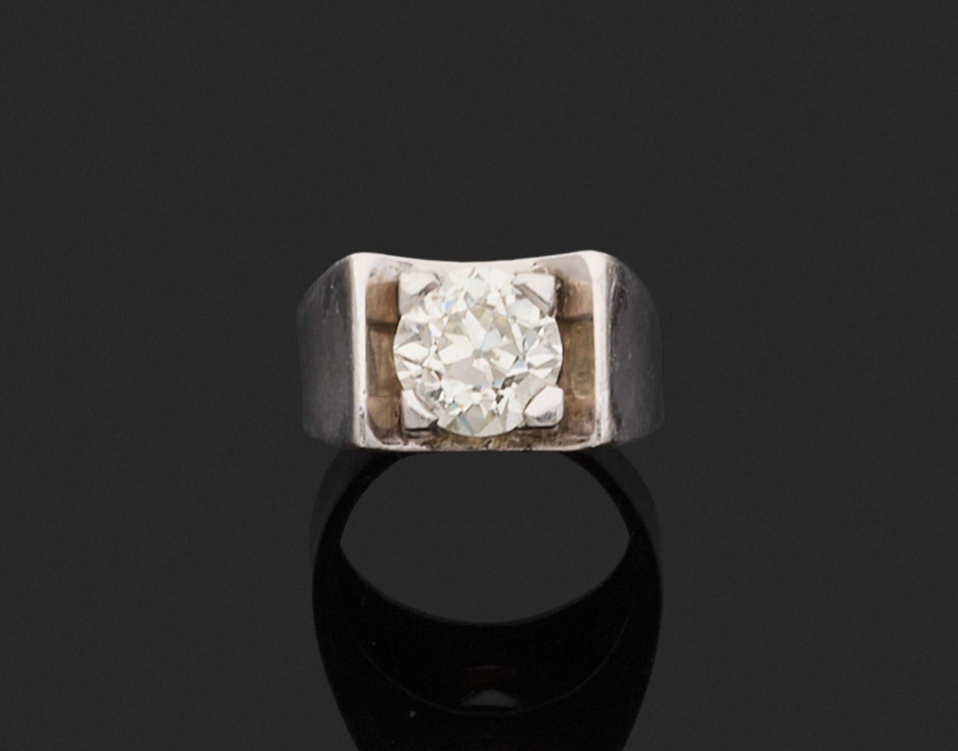 Important signet ring in platinum (850‰) centred with a round old-cut diamond, approximately 2.40/2.70 carats, mounted in a claw-set setting.