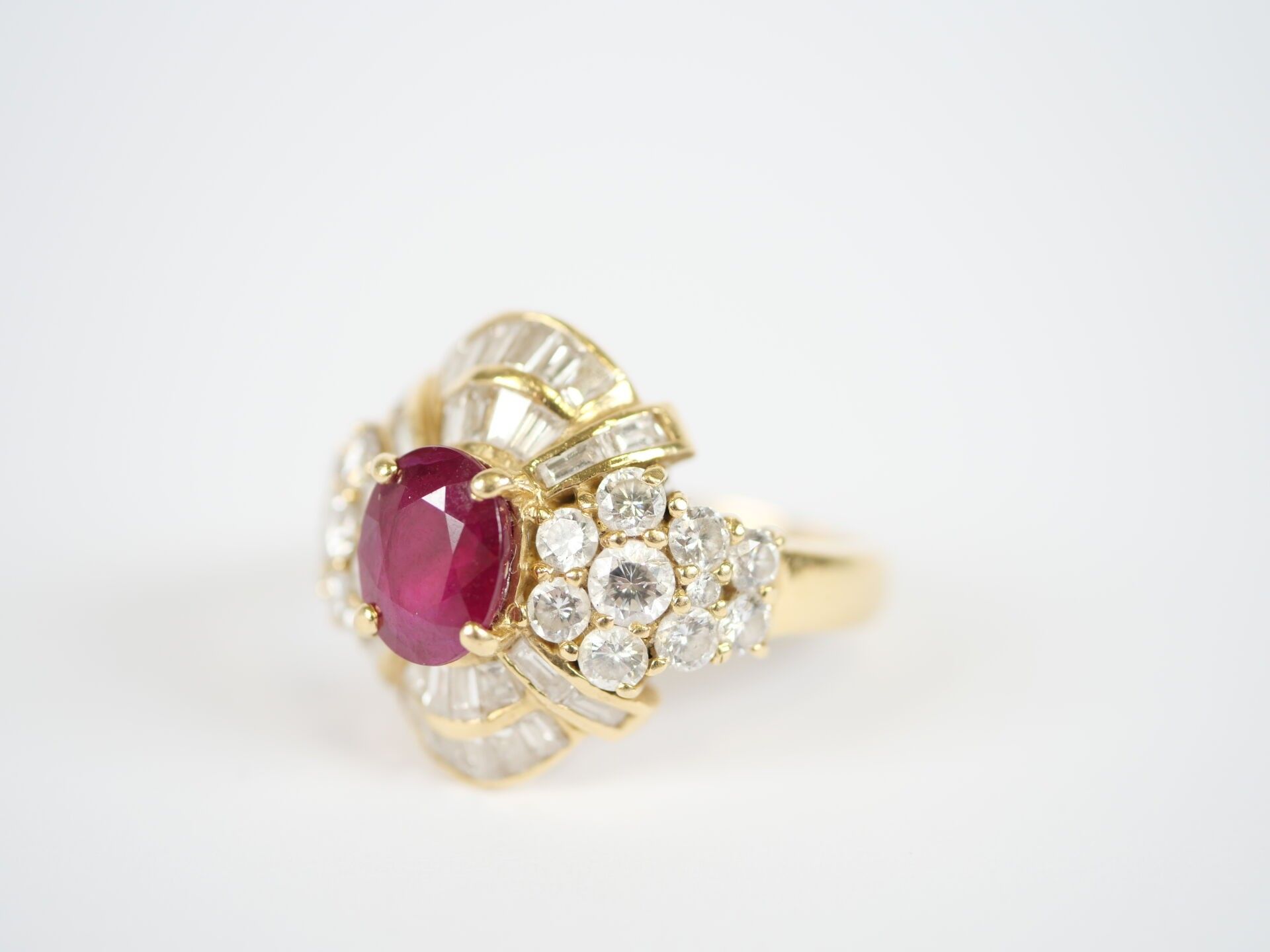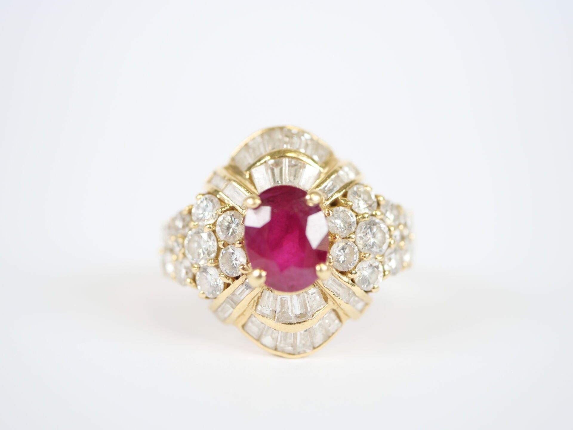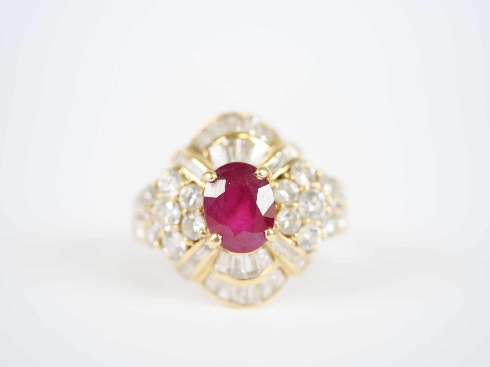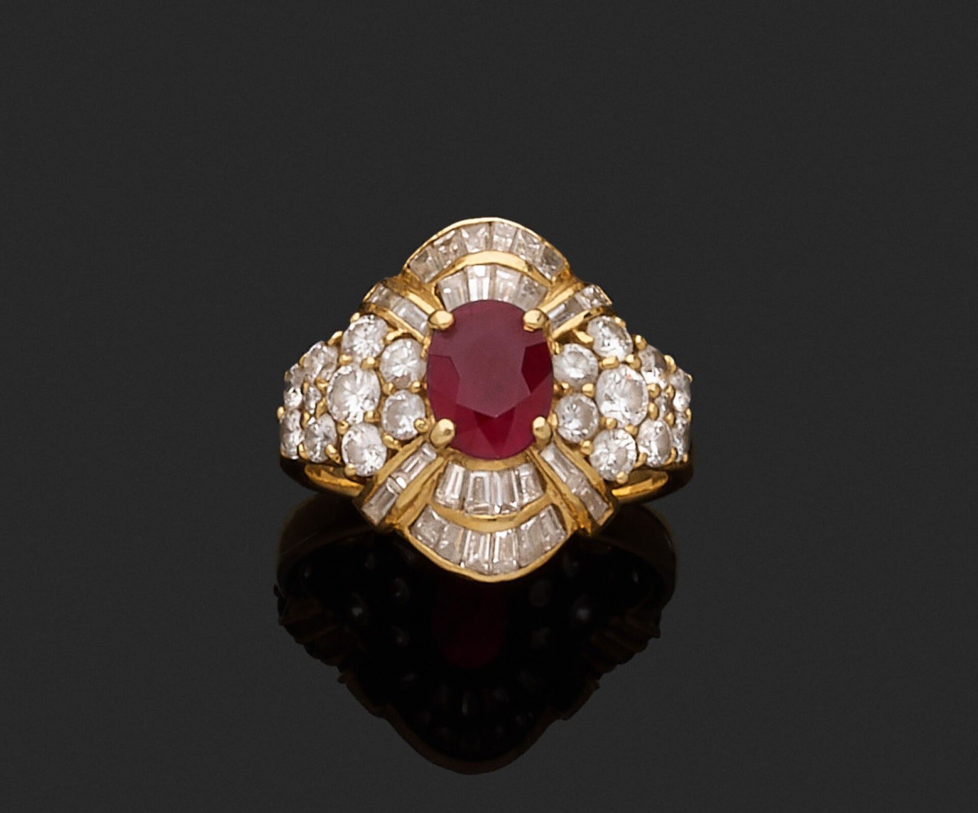 Important 18K (750‰) yellow gold ring centred on a faceted oval ruby, approximately 7 x 6 mm, set in a claw-setting in a surround of numerous round brilliant-cut and baguette-cut diamonds, the largest of which weigh approximately 0.10 carat.