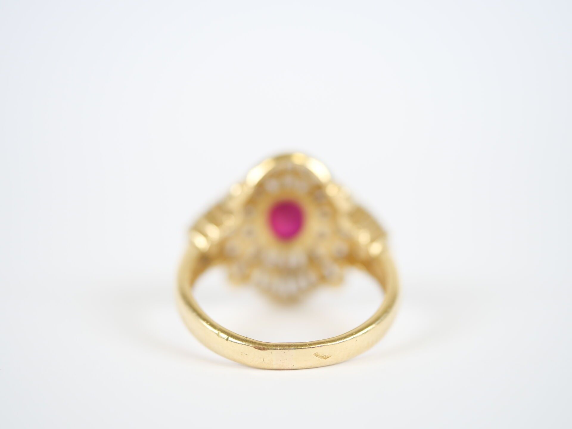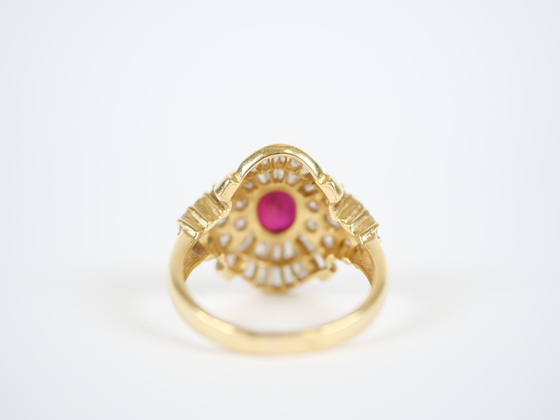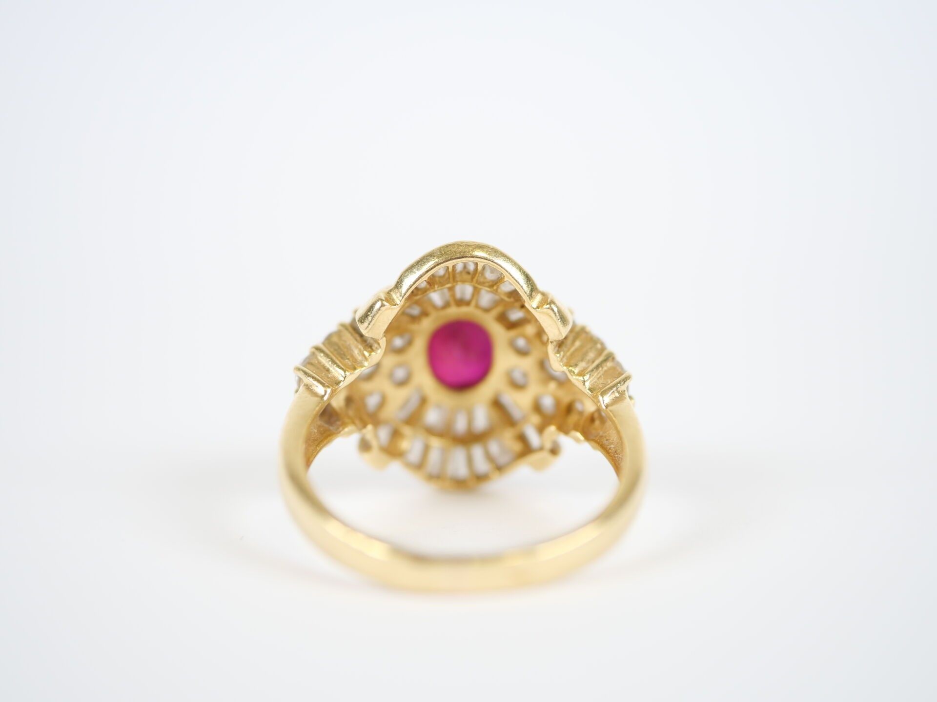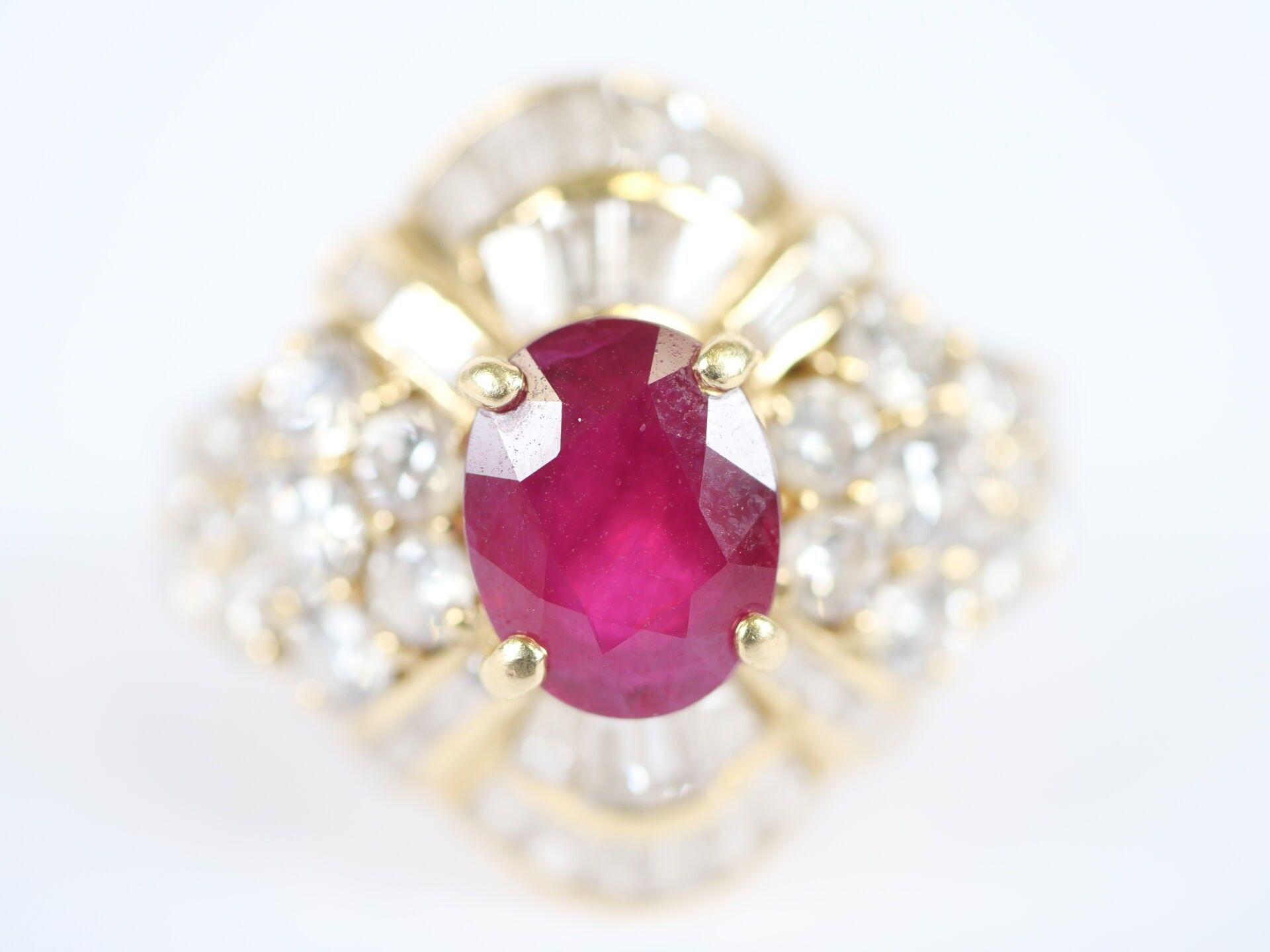 Important 18K (750‰) yellow gold ring centred on a faceted oval ruby, approximately 7 x 6 mm, set in a claw-setting in a surround of numerous round brilliant-cut and baguette-cut diamonds, the largest of which weigh approximately 0.10 carat.