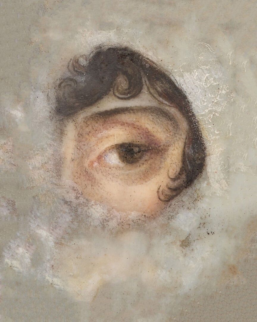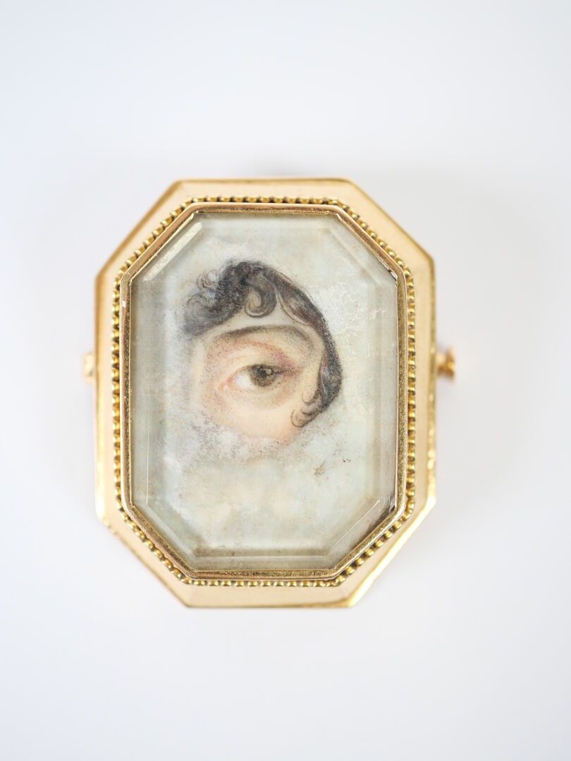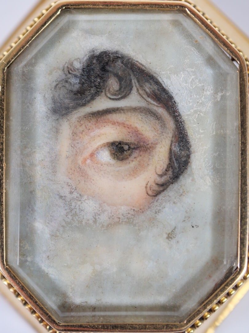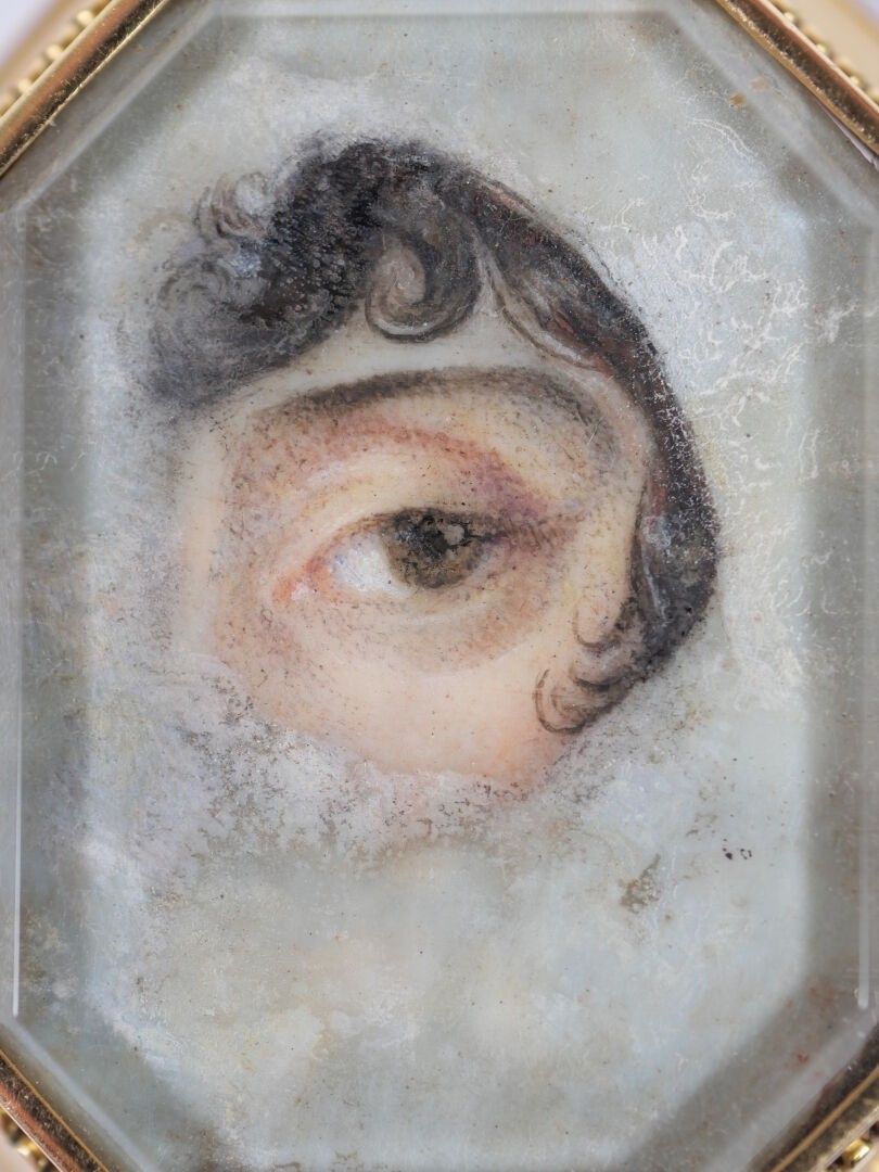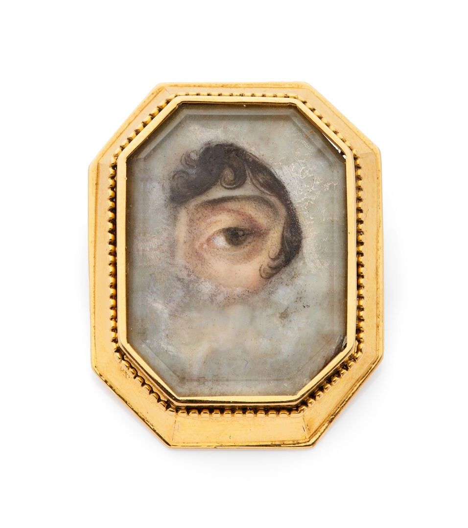 Note: This perfectly preserved brooch is an extraordinary example of the "lover's eye" jewel of the 19th century. Inherited from British fashion in the early 19th century, this jewellery, whether brooch, bracelet or even ring, was intended to represent the male or female eye of the loved one in painted miniature.