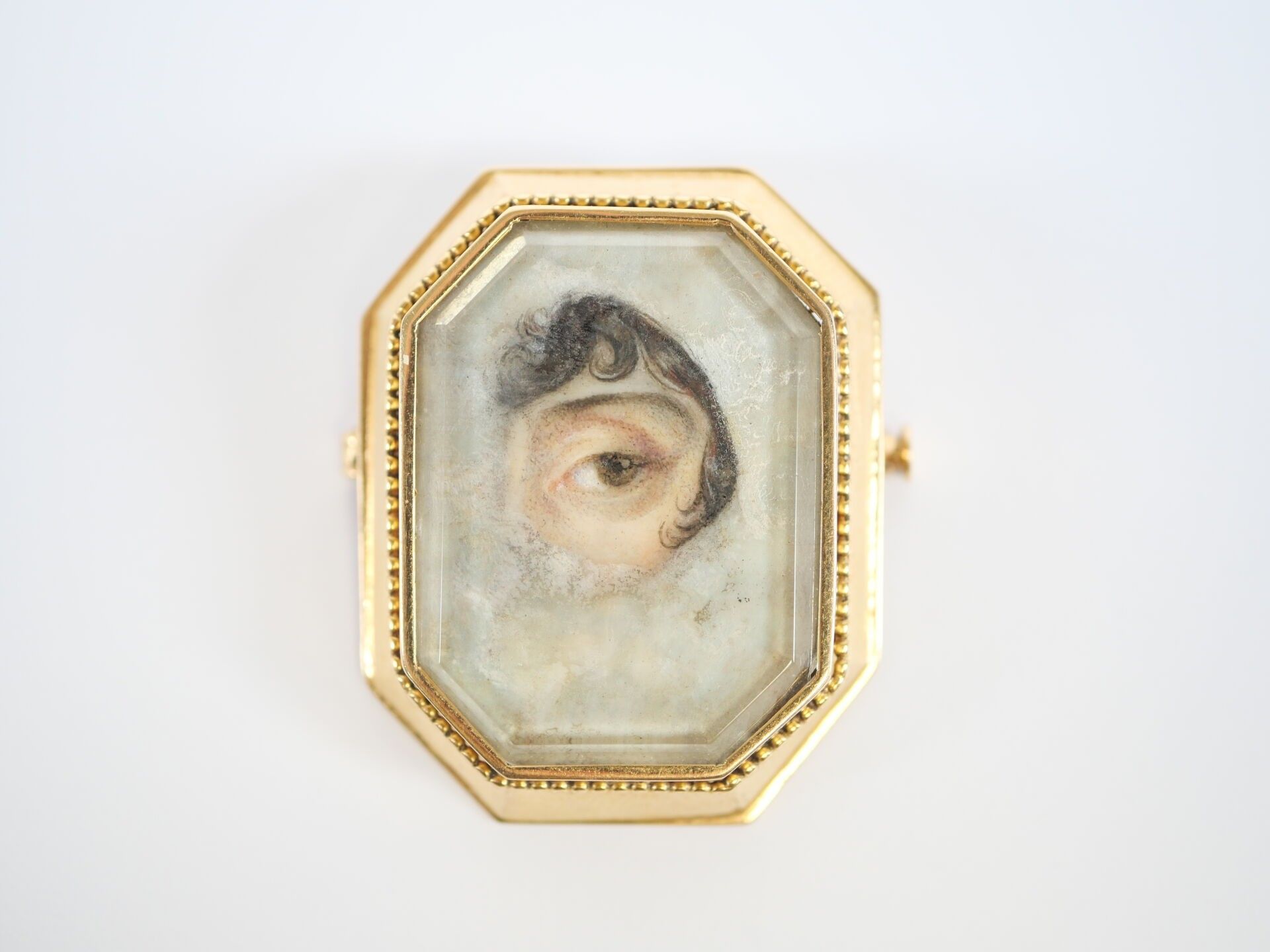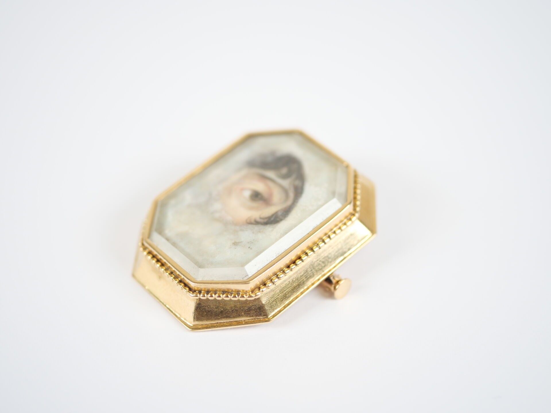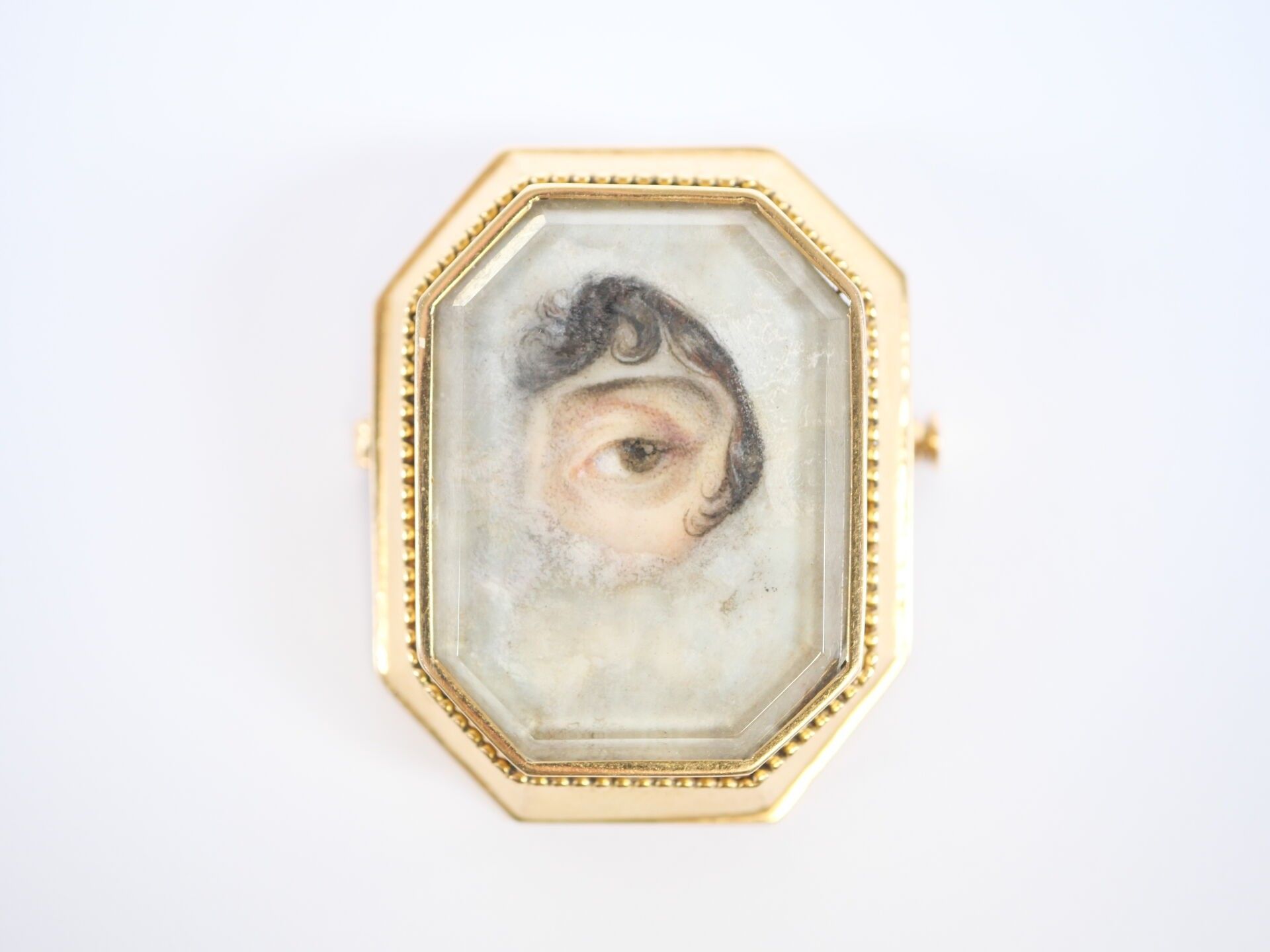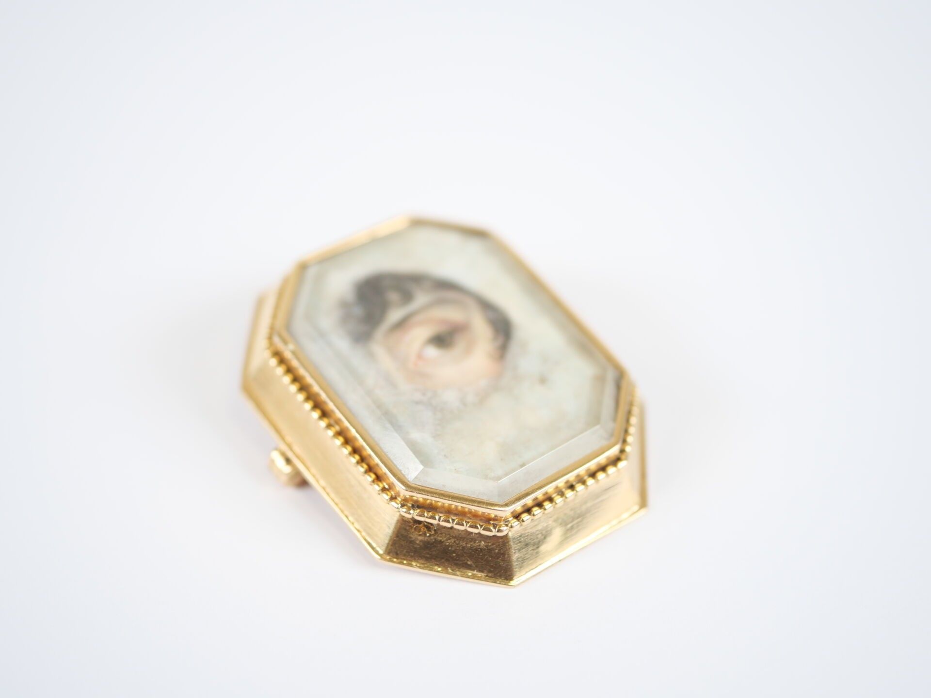 An 18K (750‰) yellow gold cutaway "Lover's Eye" brooch adorned with a gouache-painted miniature depicting a male eye, presented beneath a bevelled mirror encircled by a string of pearls.