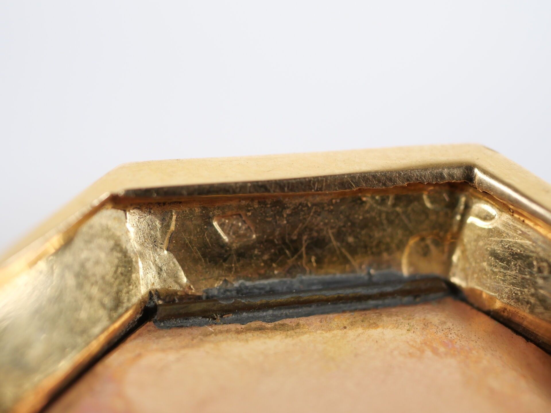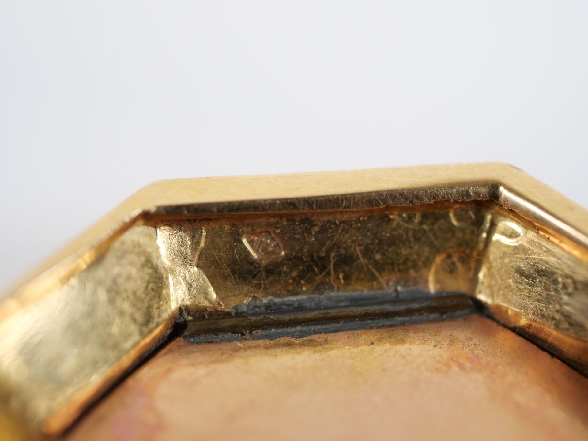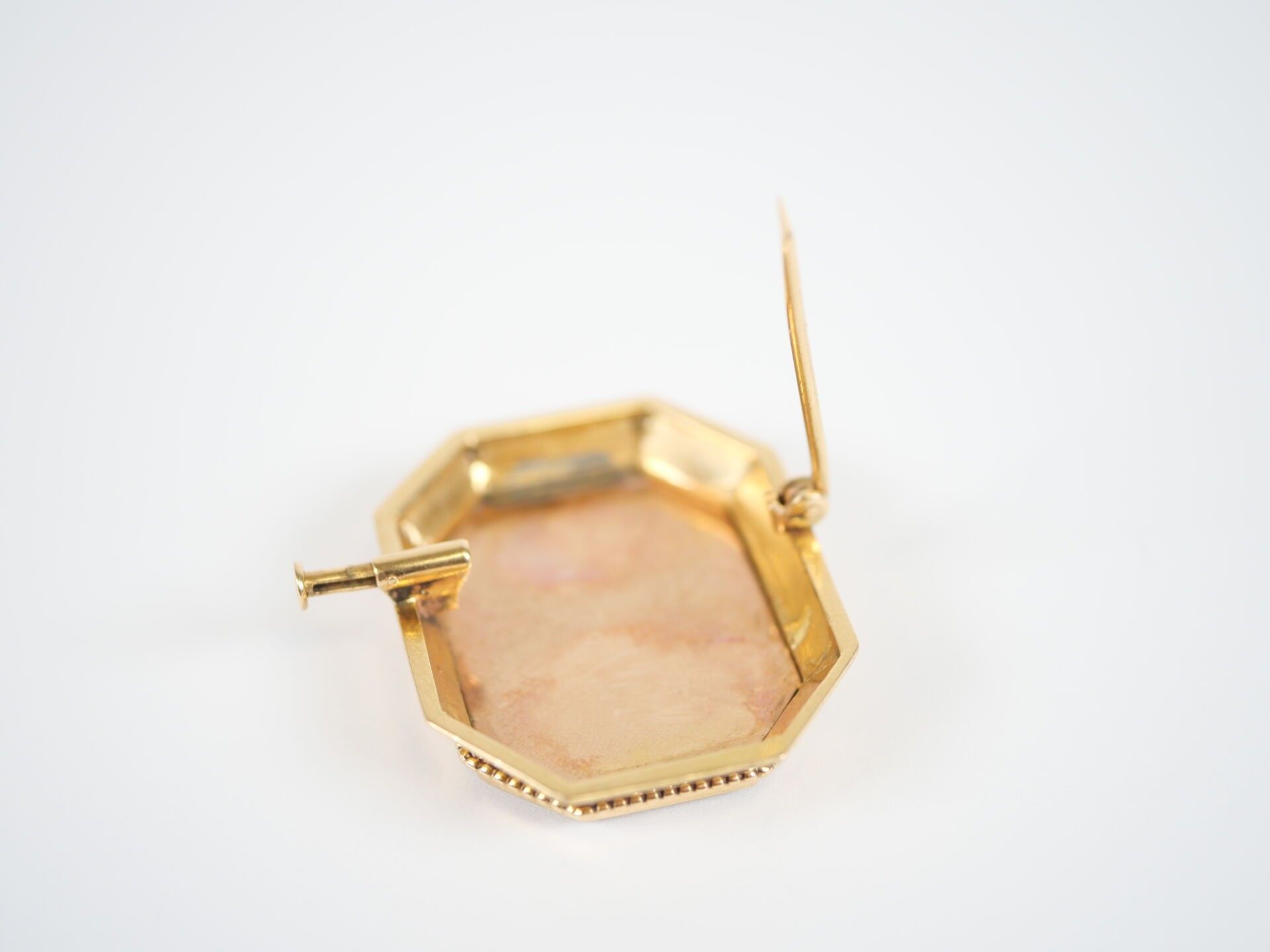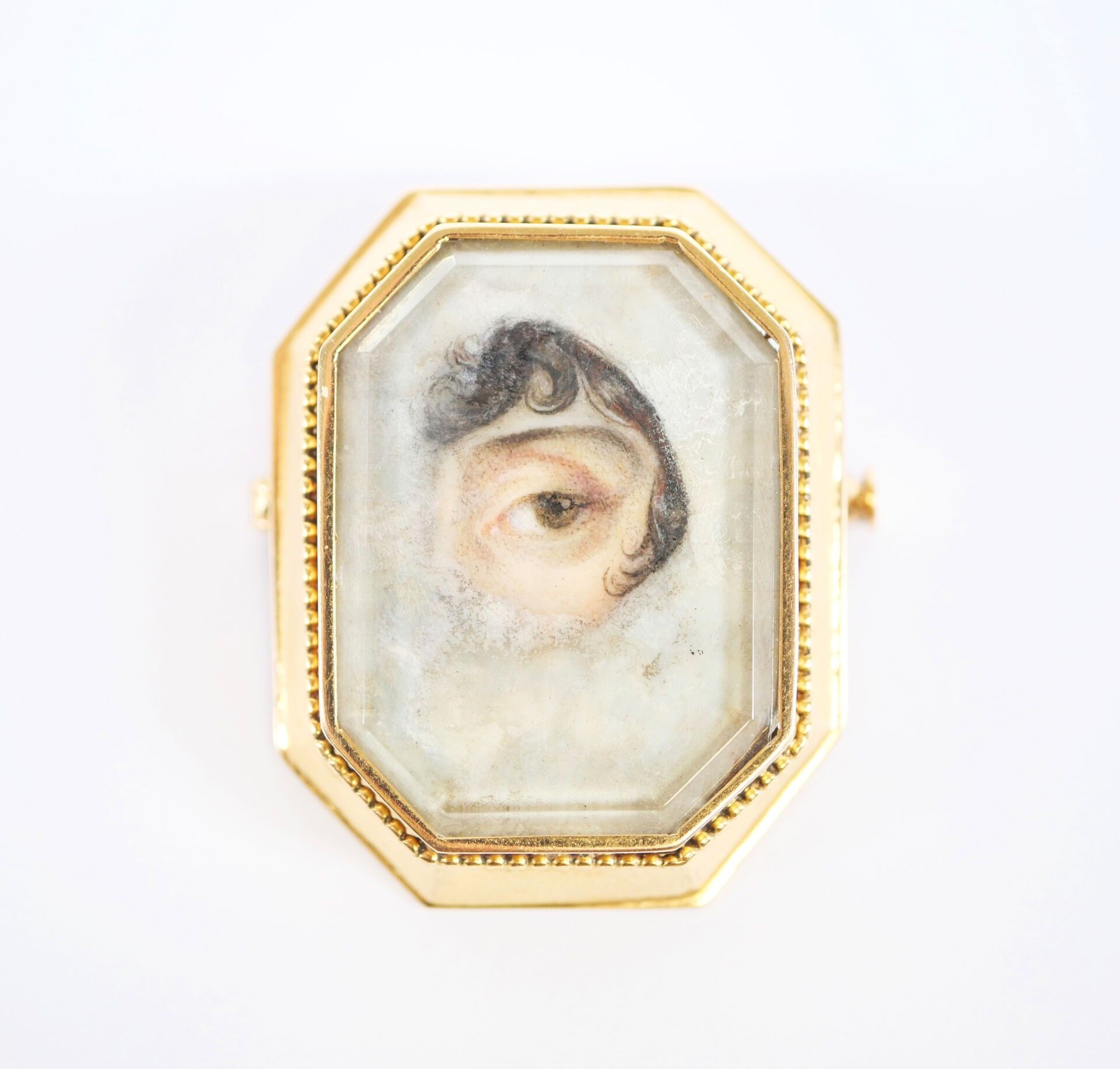 An 18K (750‰) yellow gold cutaway "Lover's Eye" brooch adorned with a gouache-painted miniature depicting a male eye, presented beneath a bevelled mirror encircled by a string of pearls.