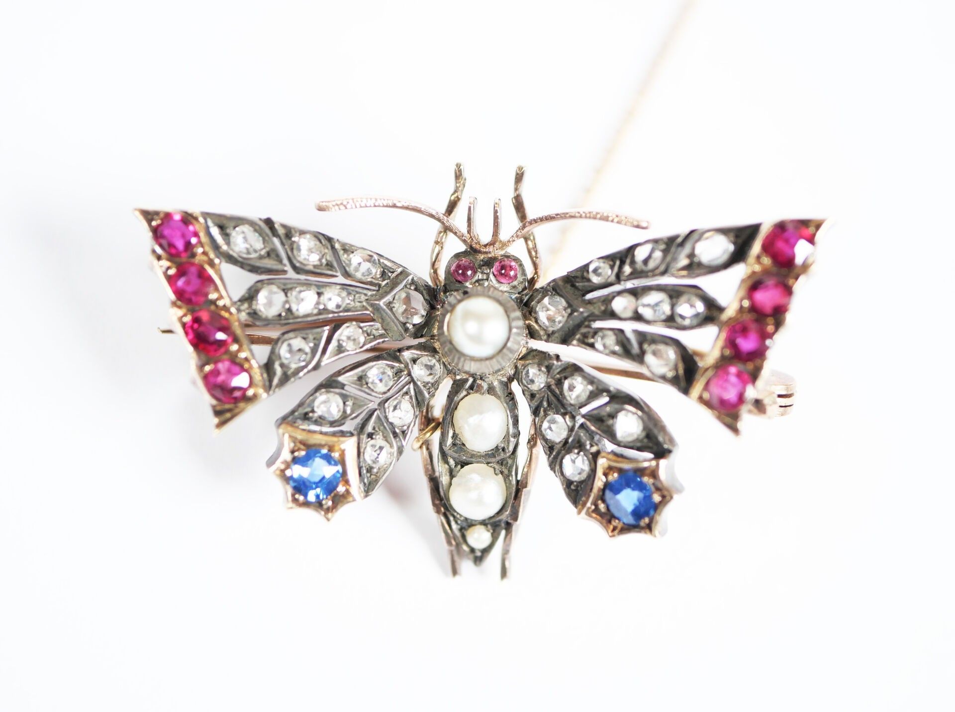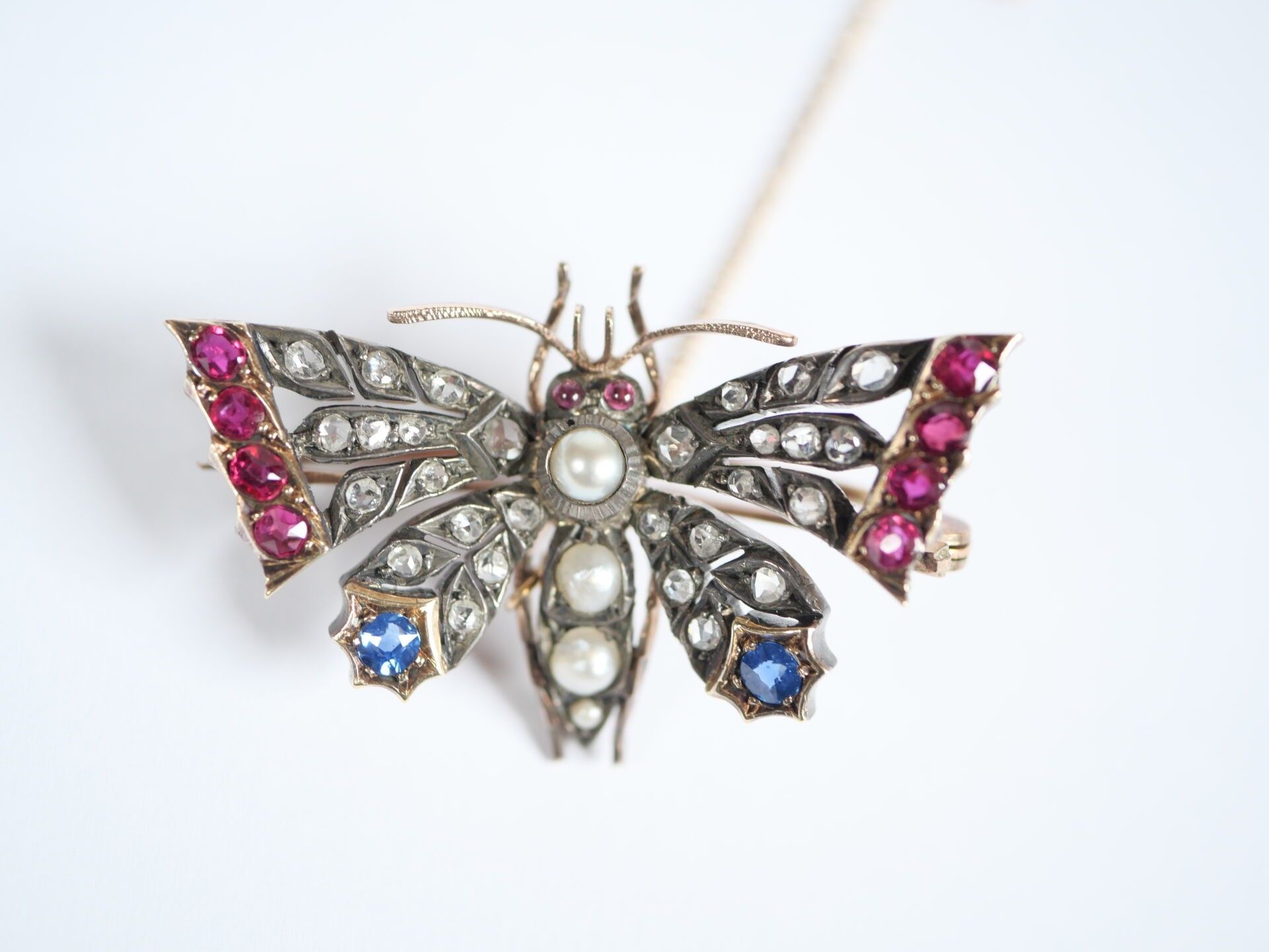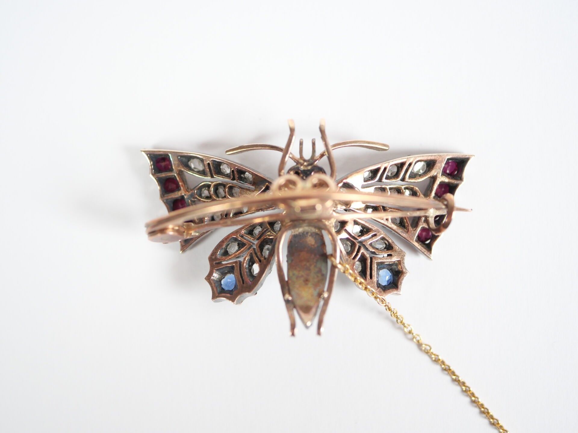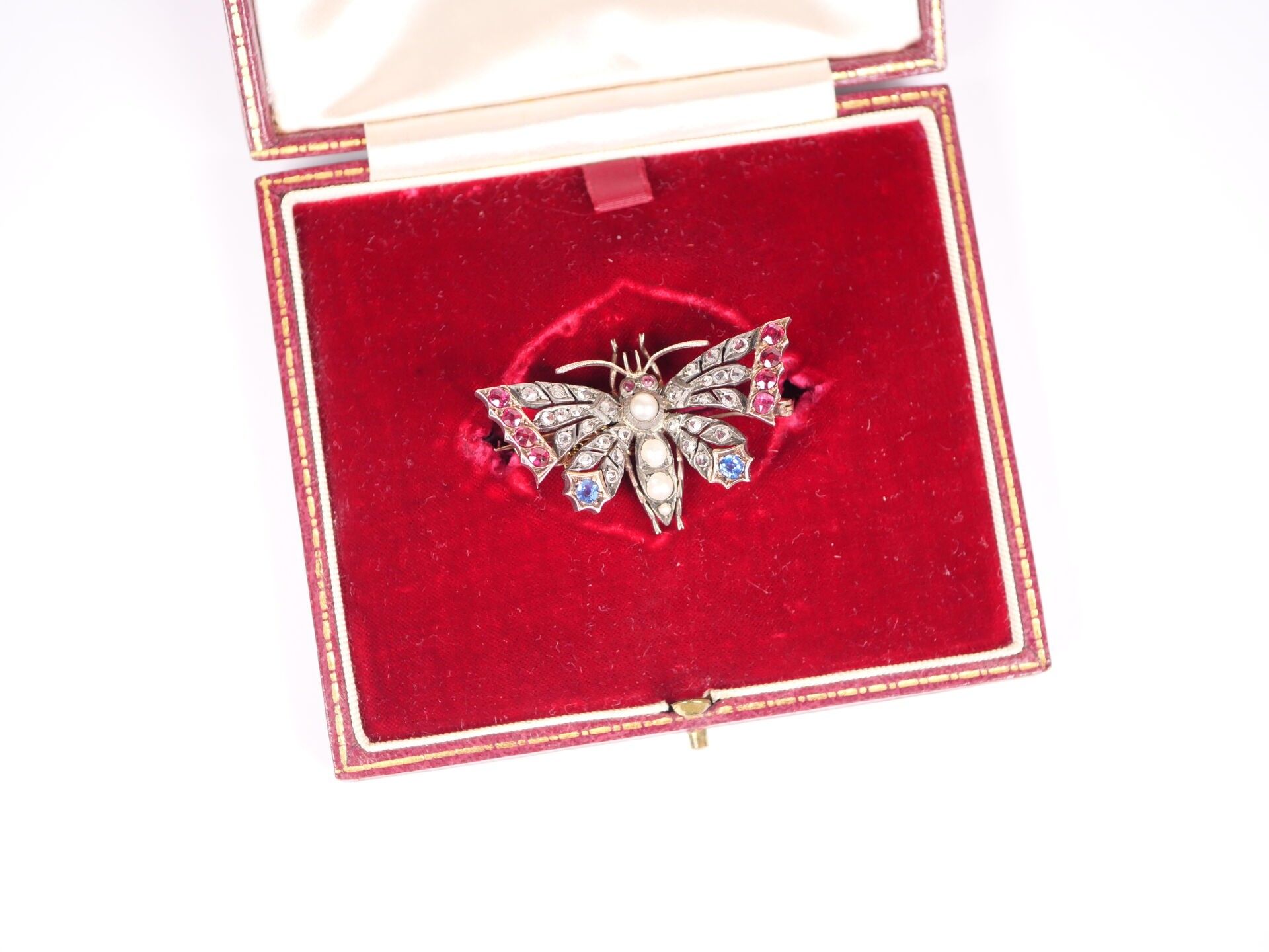 9K yellow gold (375‰) and silver brooch featuring a butterfly integrally paved with sparkles of rose, rubies, sapphires and fine pearls.