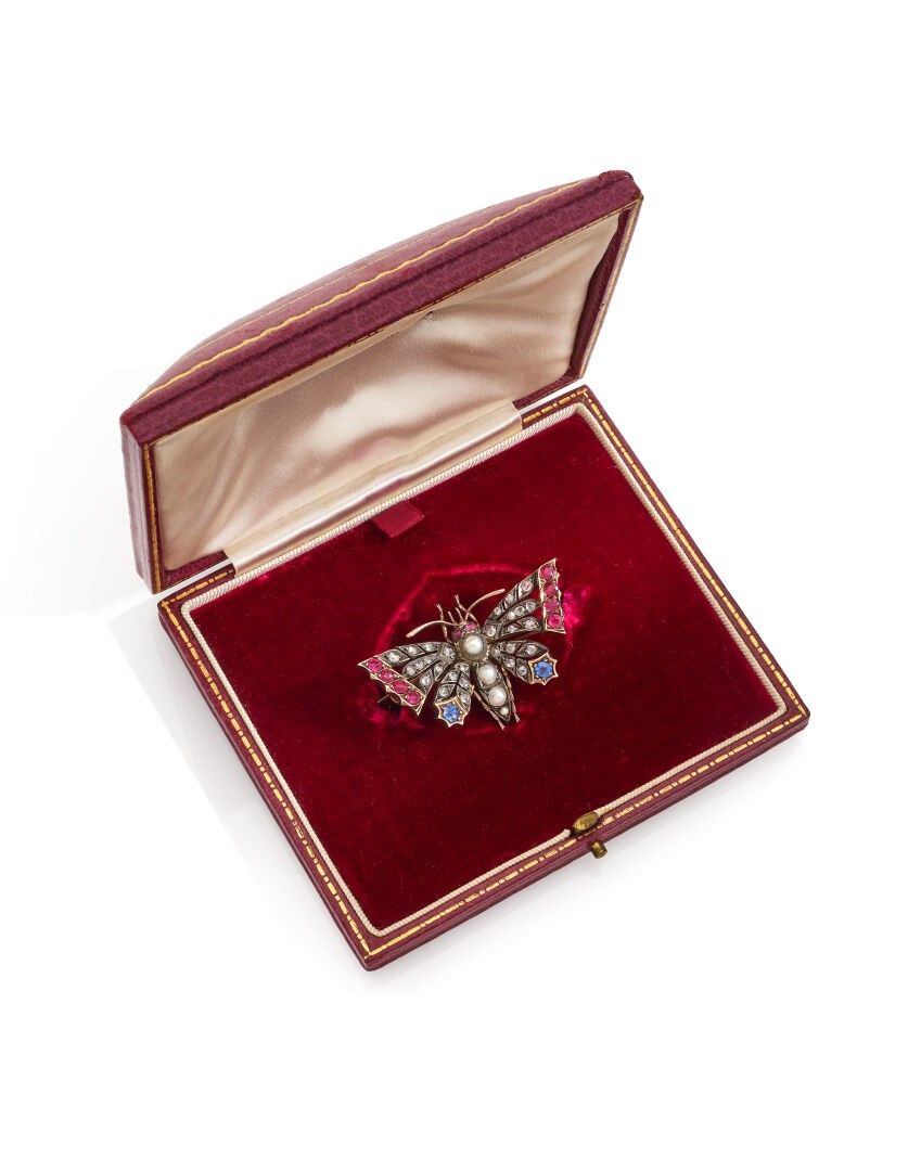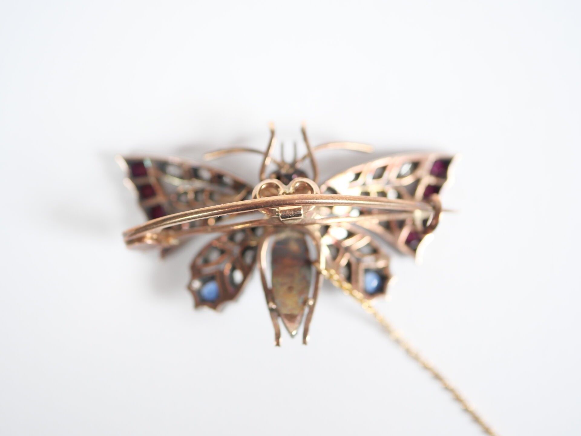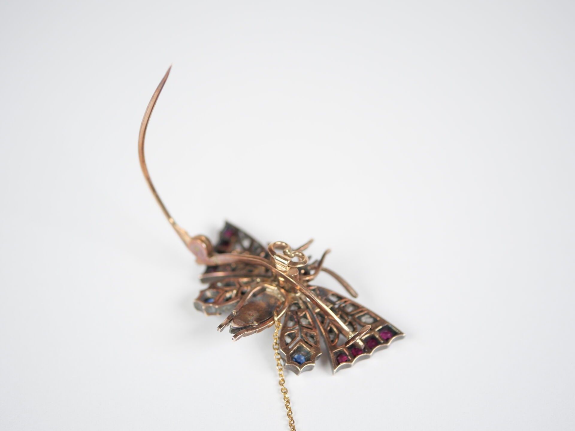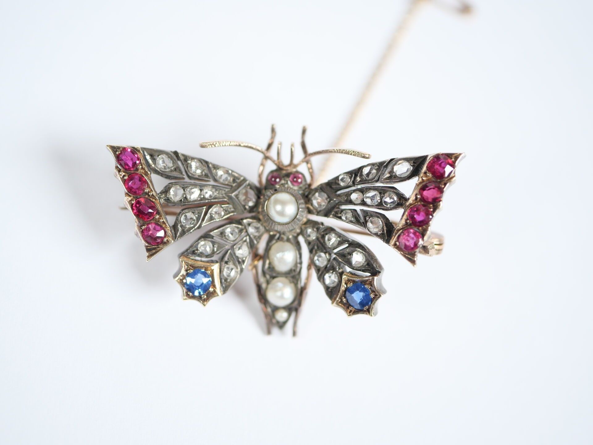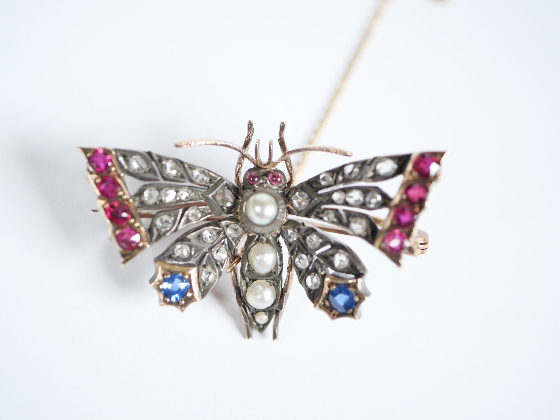 9K yellow gold (375‰) and silver brooch featuring a butterfly integrally paved with sparkles of rose, rubies, sapphires and fine pearls.