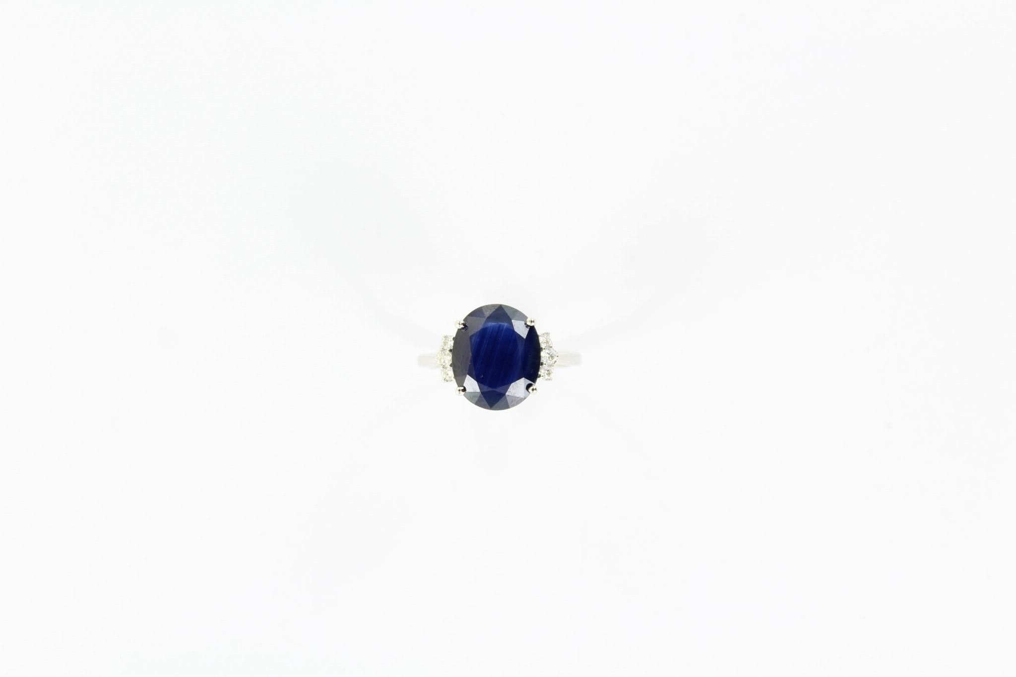 White gold ring set with a dark oval sapphire (12 x 10.5 mm) set with 6 diamonds of 0.02 ct. TDD: 54