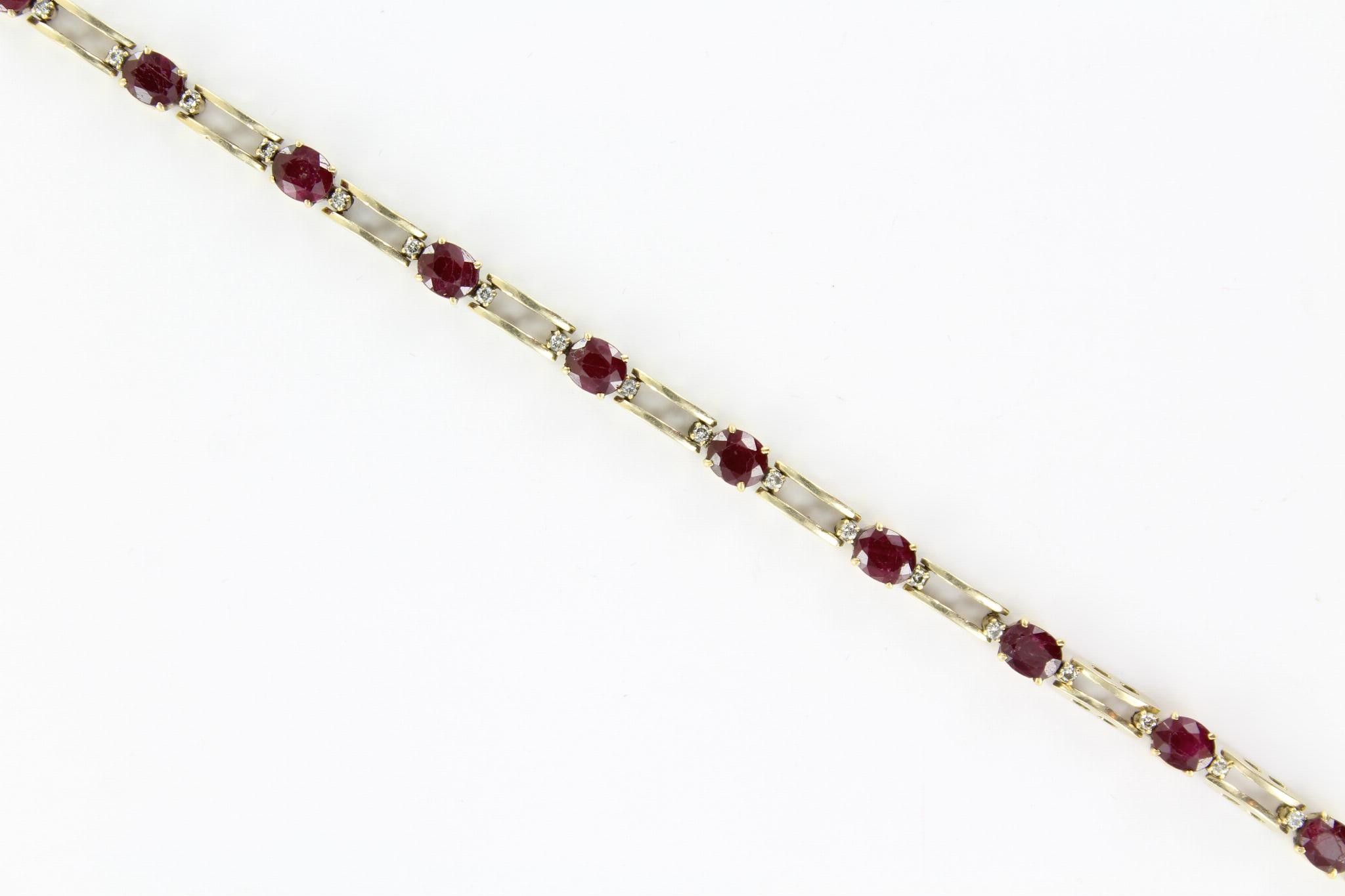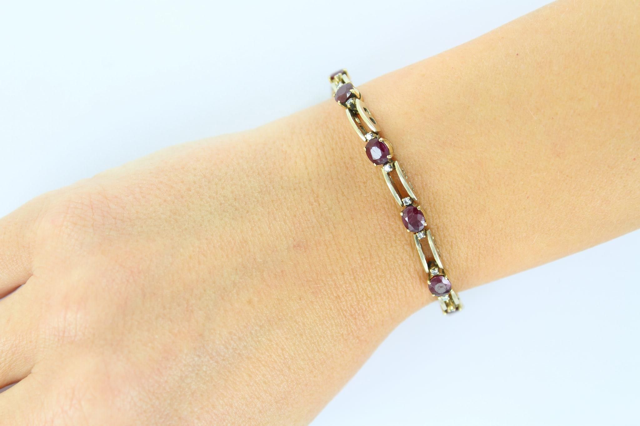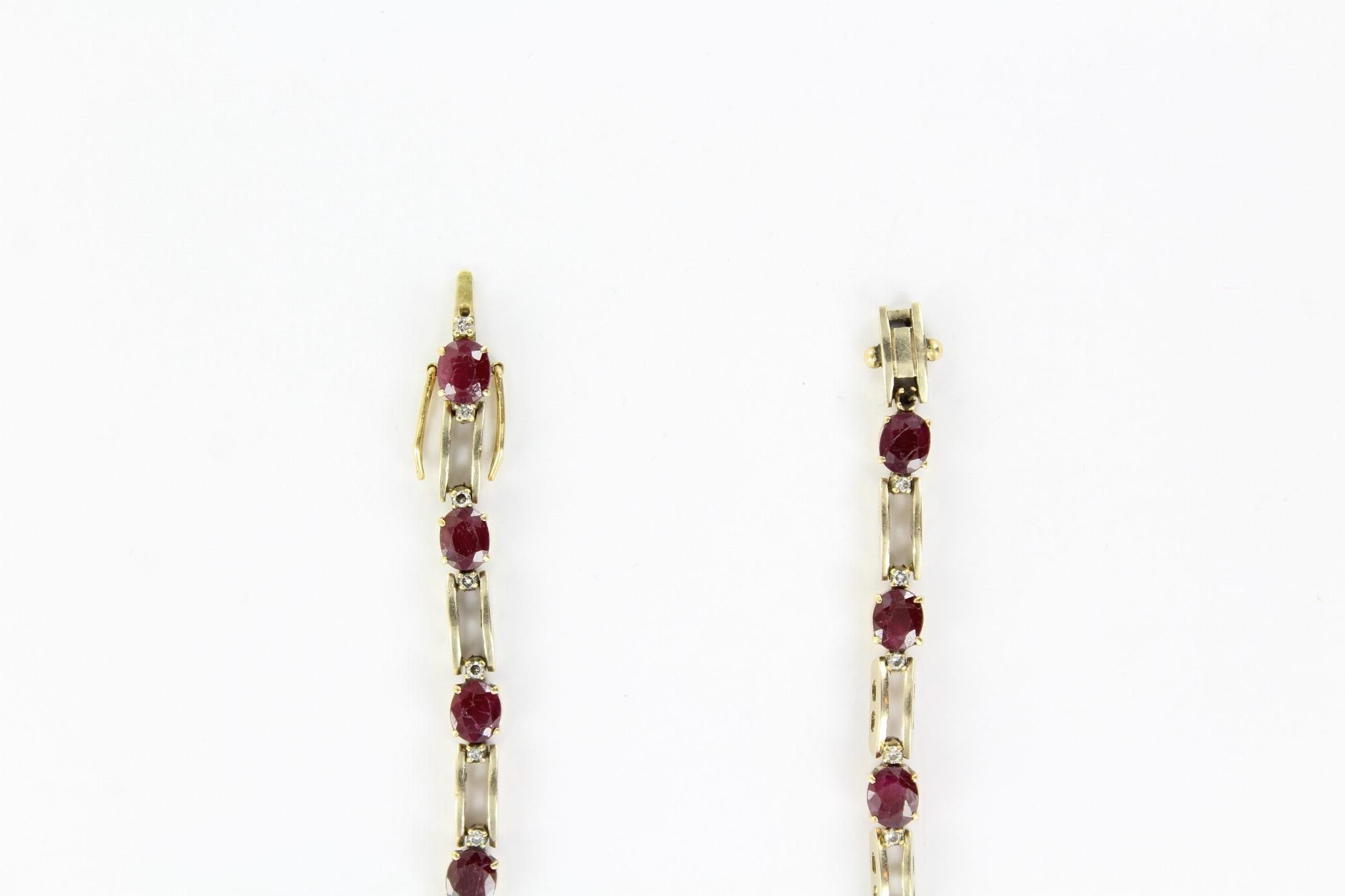 Flexible yellow gold bracelet set with 13 oval rubies each with 2 small diamonds (one missing). Length: 21.5