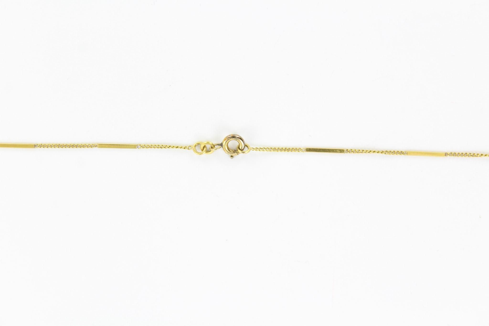 Yellow gold necklace embellished with a volute motif and paved with 24 rose-cut diamonds, 2 8/8-cut diamonds and 3 diamonds of 0.10 ct, all topped with a pearl and another as a pendant