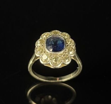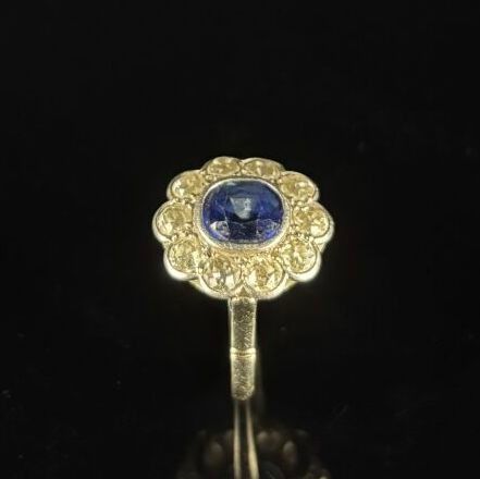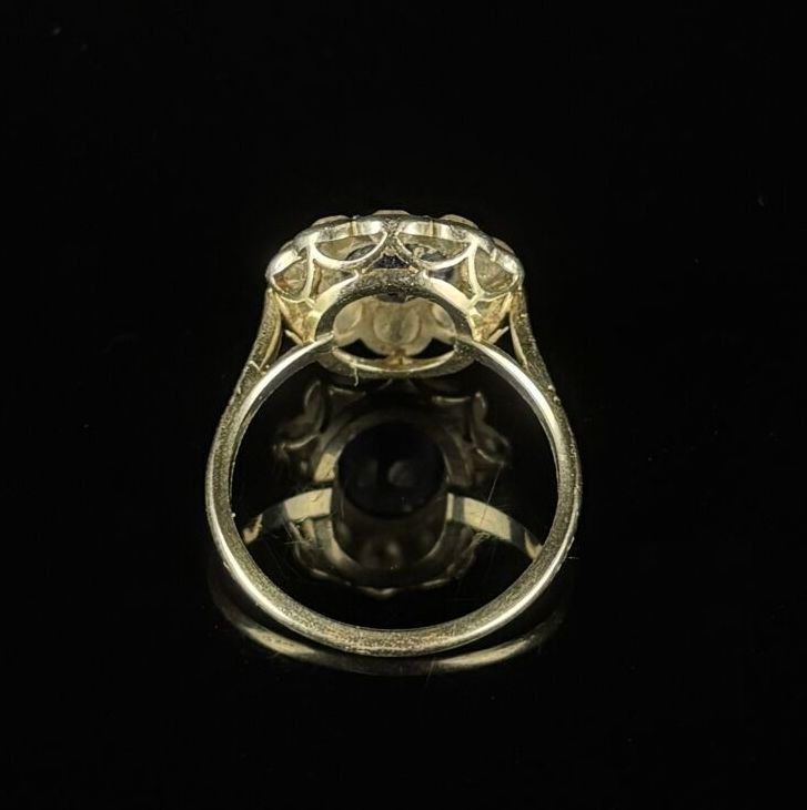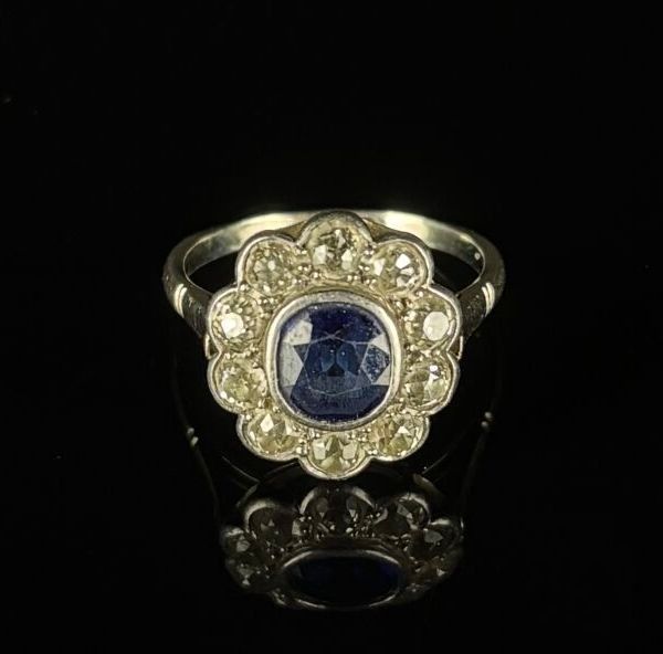 White gold and platinum daisy ring set with a slightly cushion-cut sapphire surrounded by ten round old-cut diamonds.