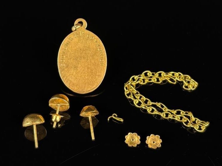 Reunion of gold jewellery including a religious medal and three ear studs.
