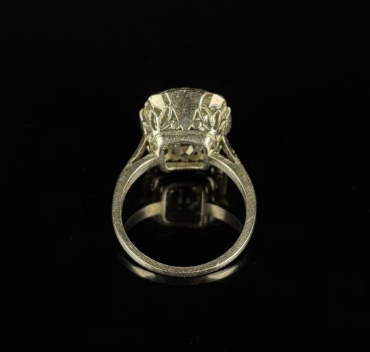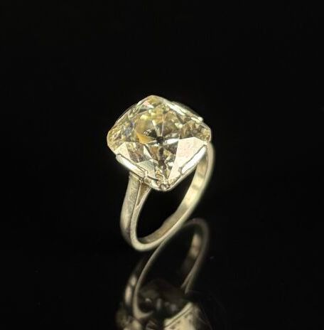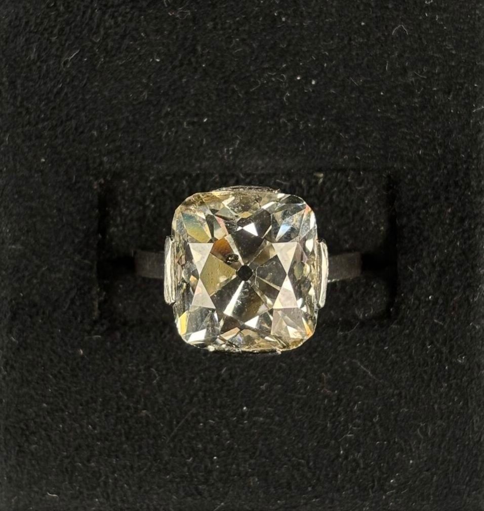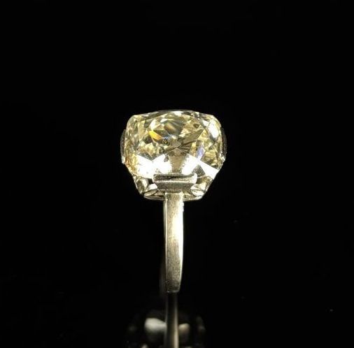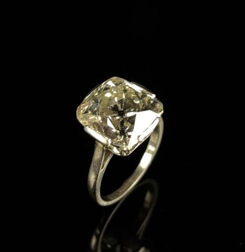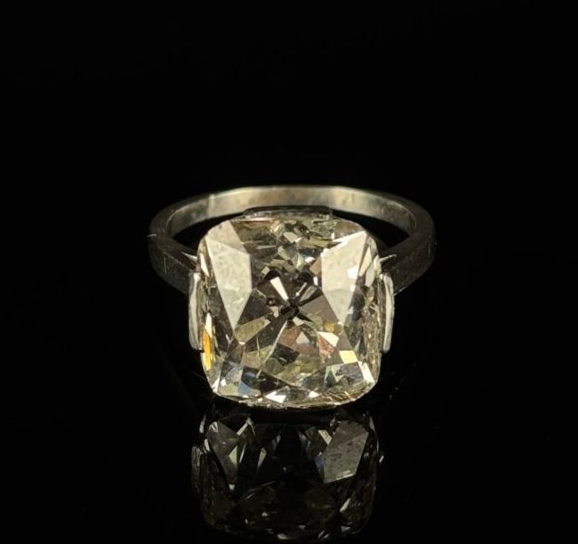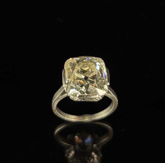 Platinum ring set with an old-cut cushion diamond weighing 8.76 carats.