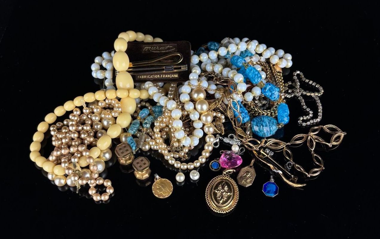 Reunion of costume jewellery including pearl necklaces, two necklaces adorned with imitation stones, a damaged heart pendant and numerous pieces of gilded metal jewellery.