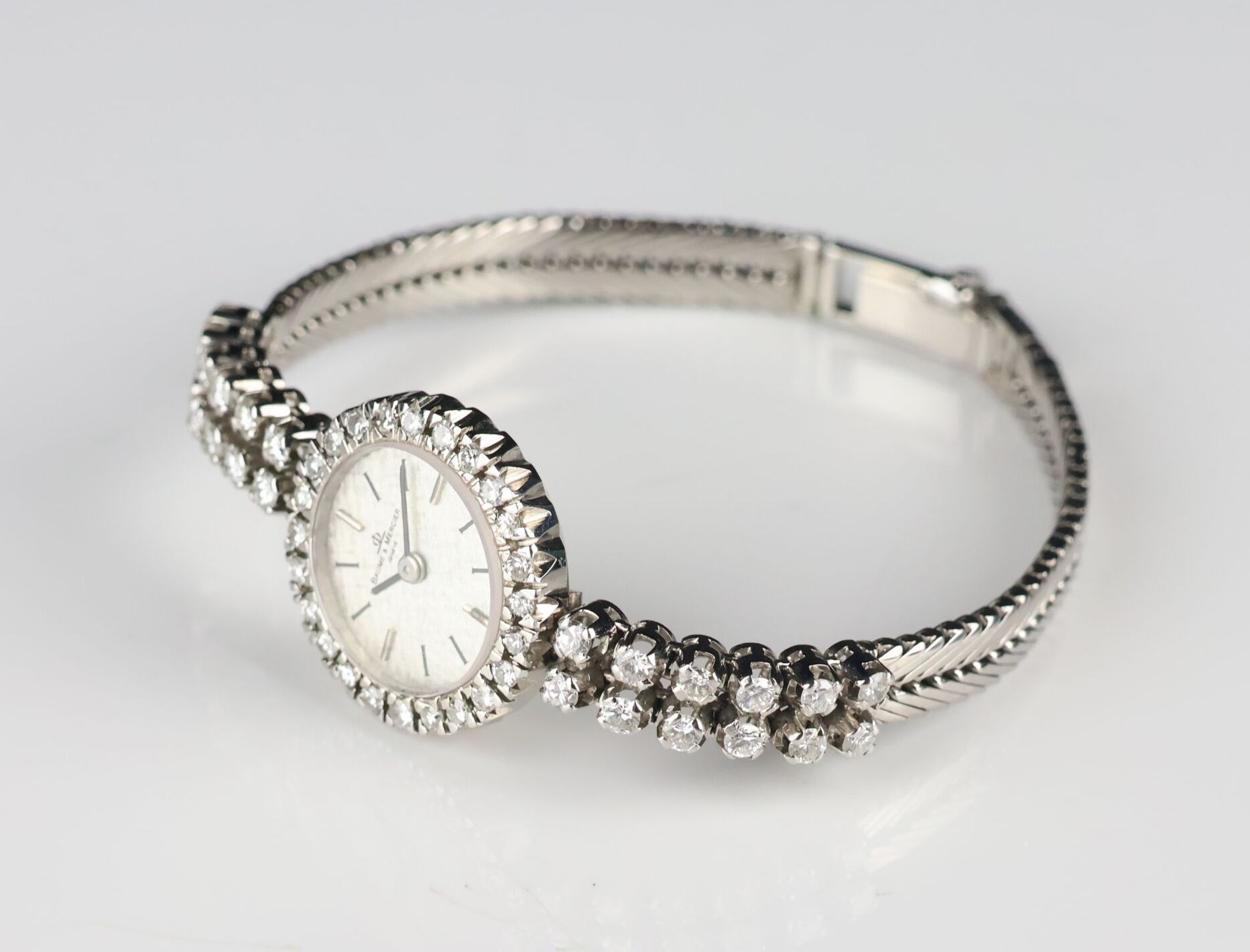 Ladies' wristwatch, the case and bracelet in white gold set with diamonds.