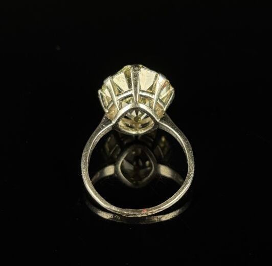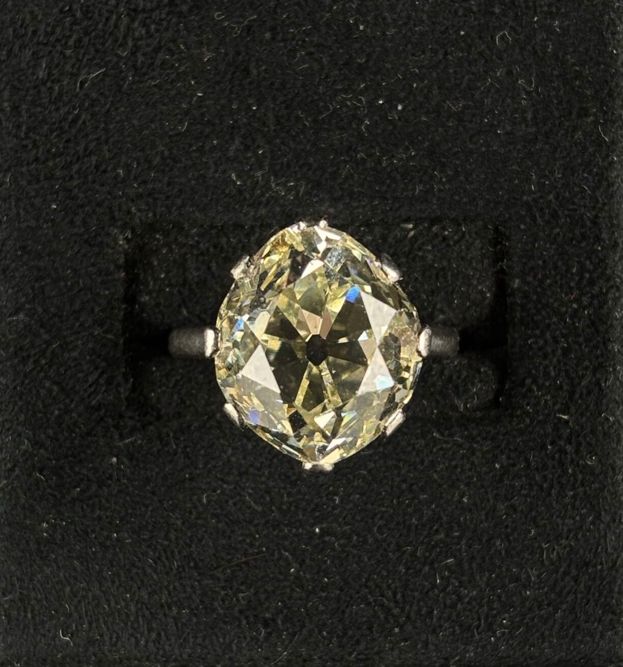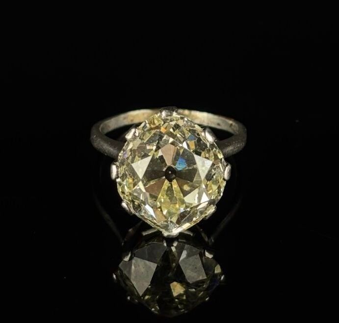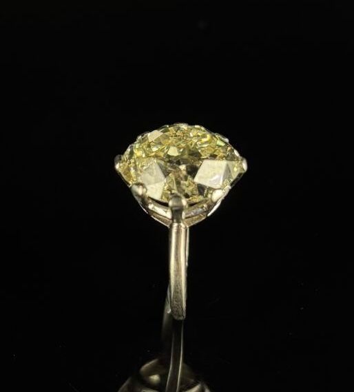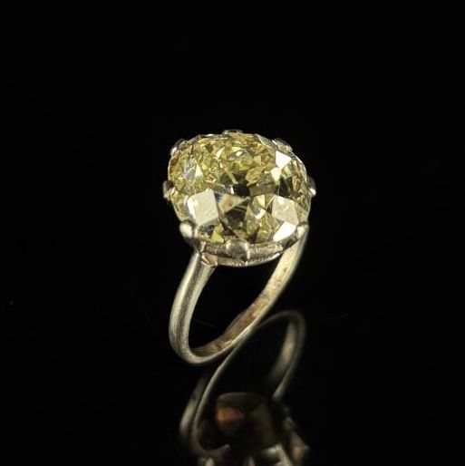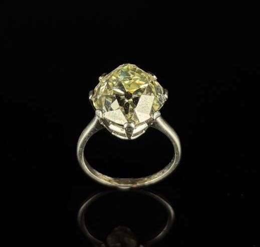 Platinum ring set with an old-cut navette diamond weighing 9.38 carats.