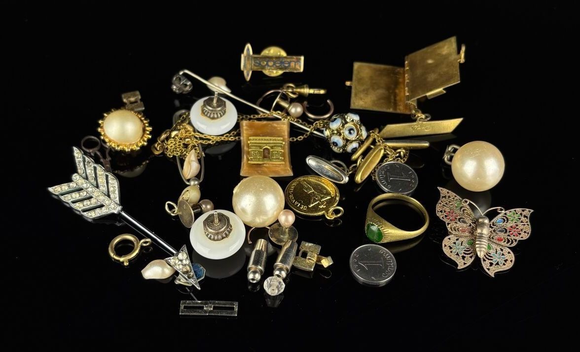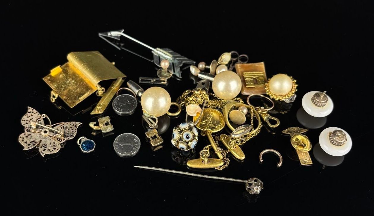 A collection of metal costume jewellery including buttons, a ring, brooches, chains, fastenings and pendants.