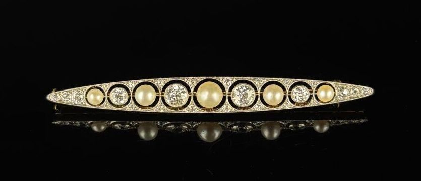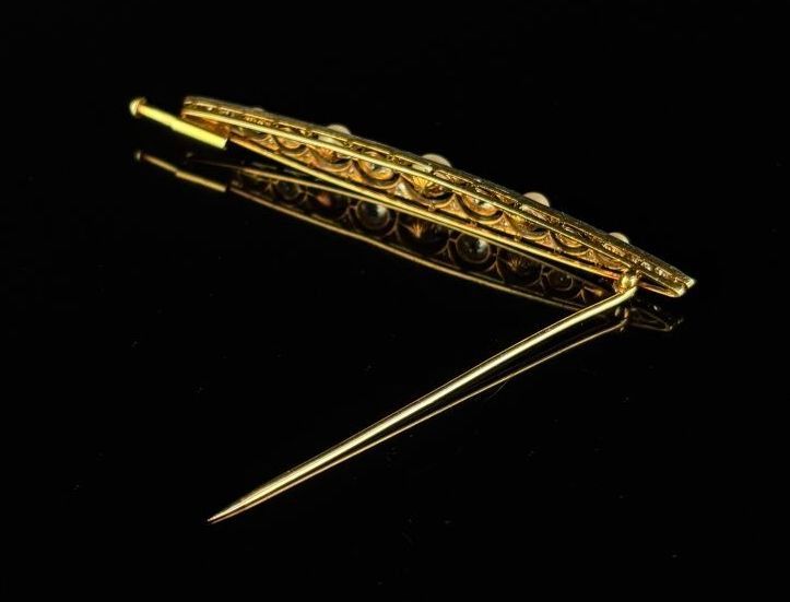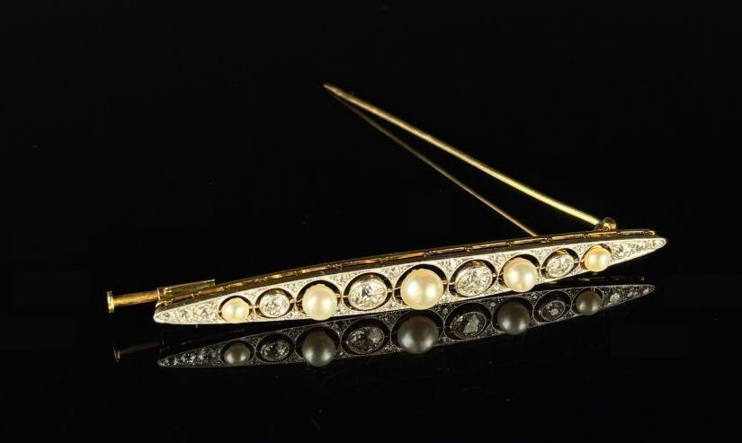 Gold and platinum navette brooch set with five white pearls alternating with round old-cut diamonds.