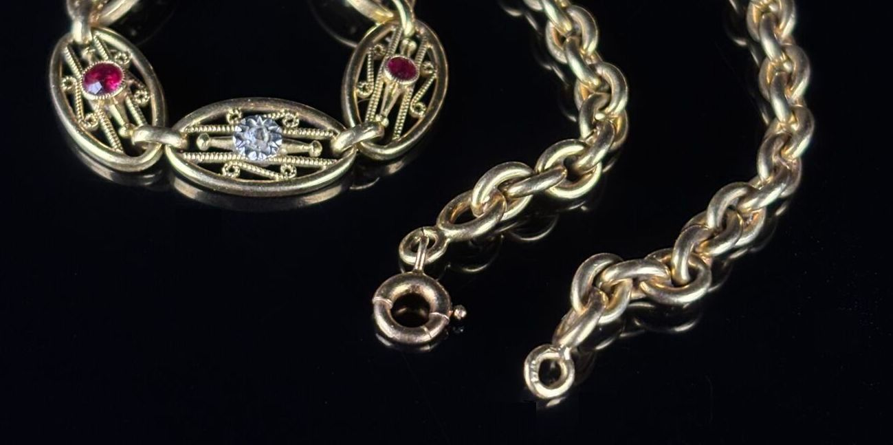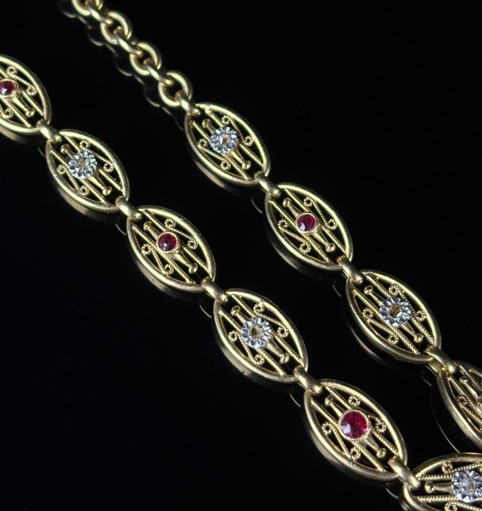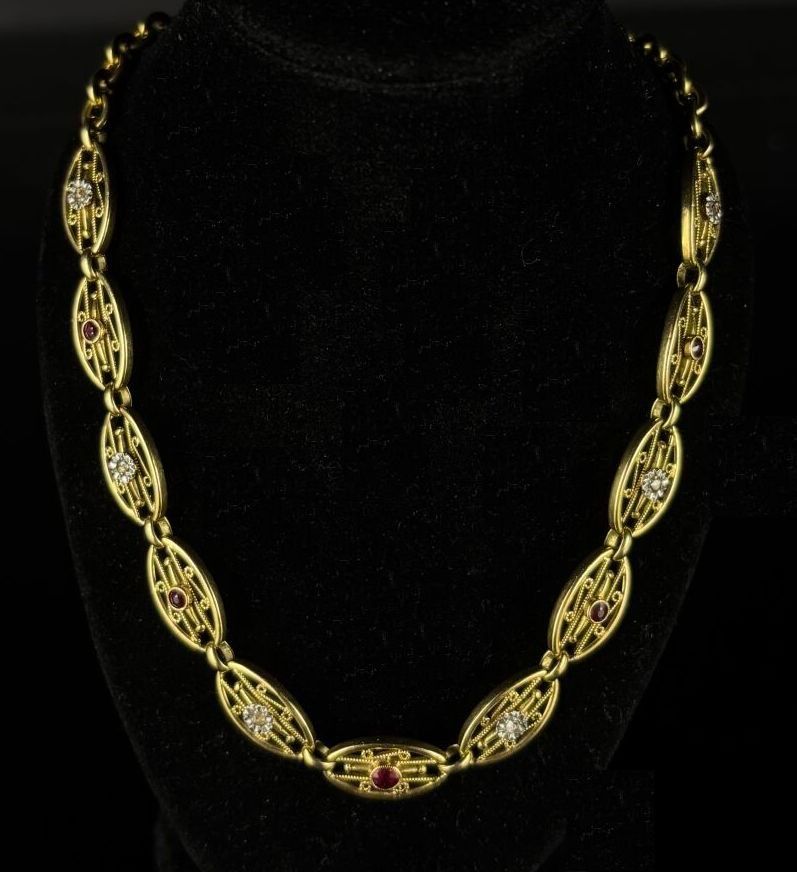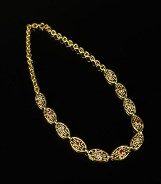 Yellow gold necklace with oval links decorated with filigree and set with coloured stones and silver flowers.