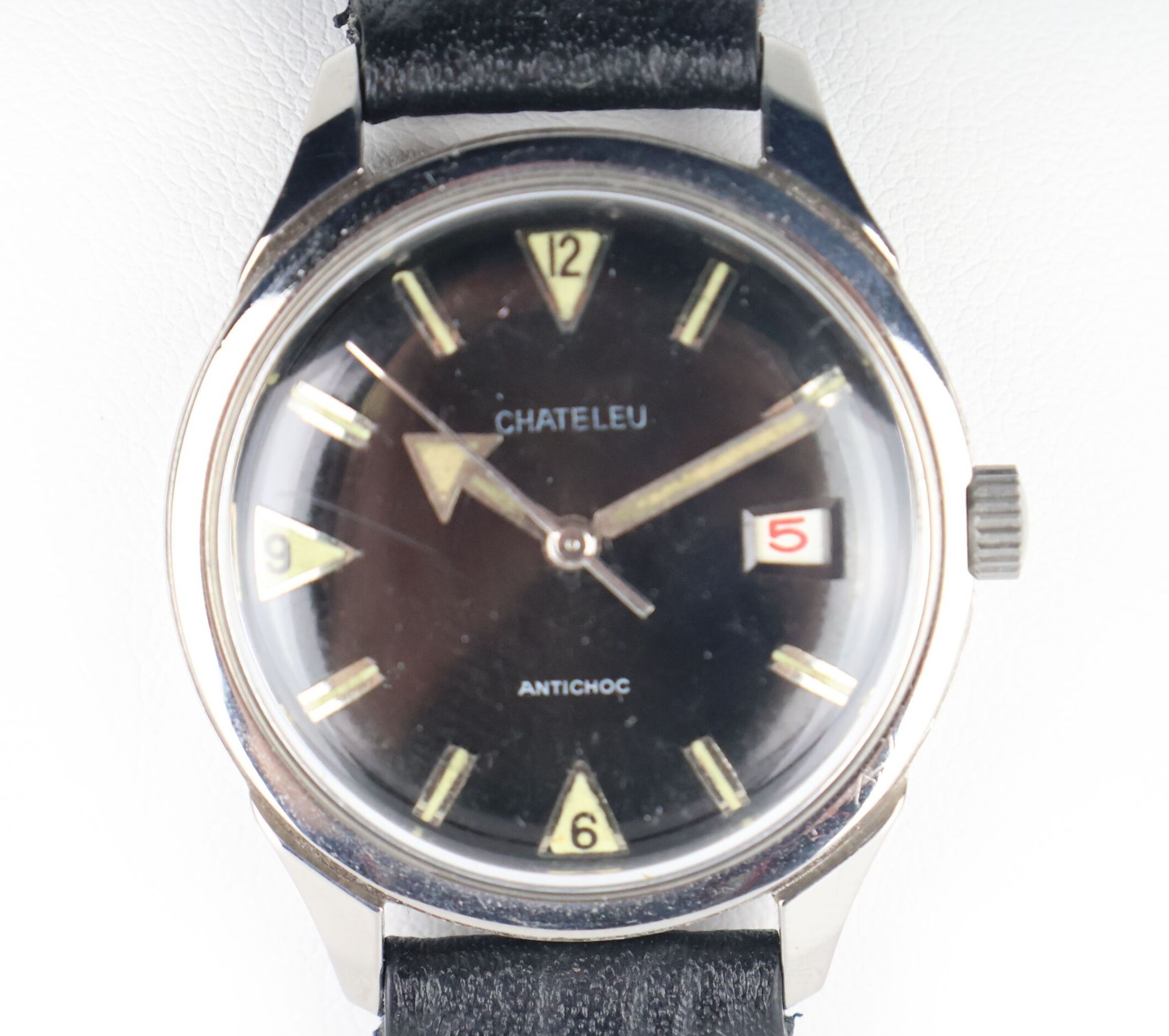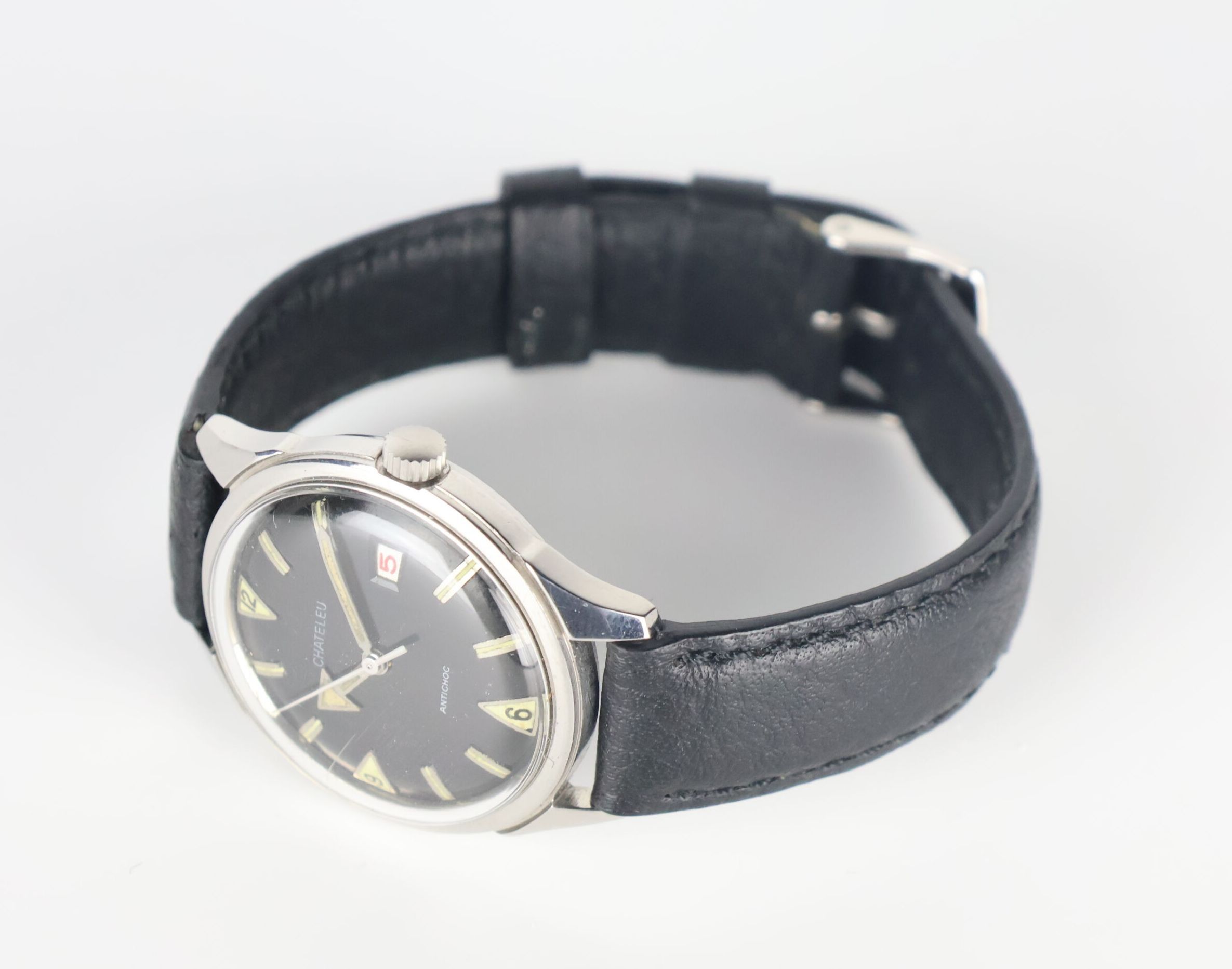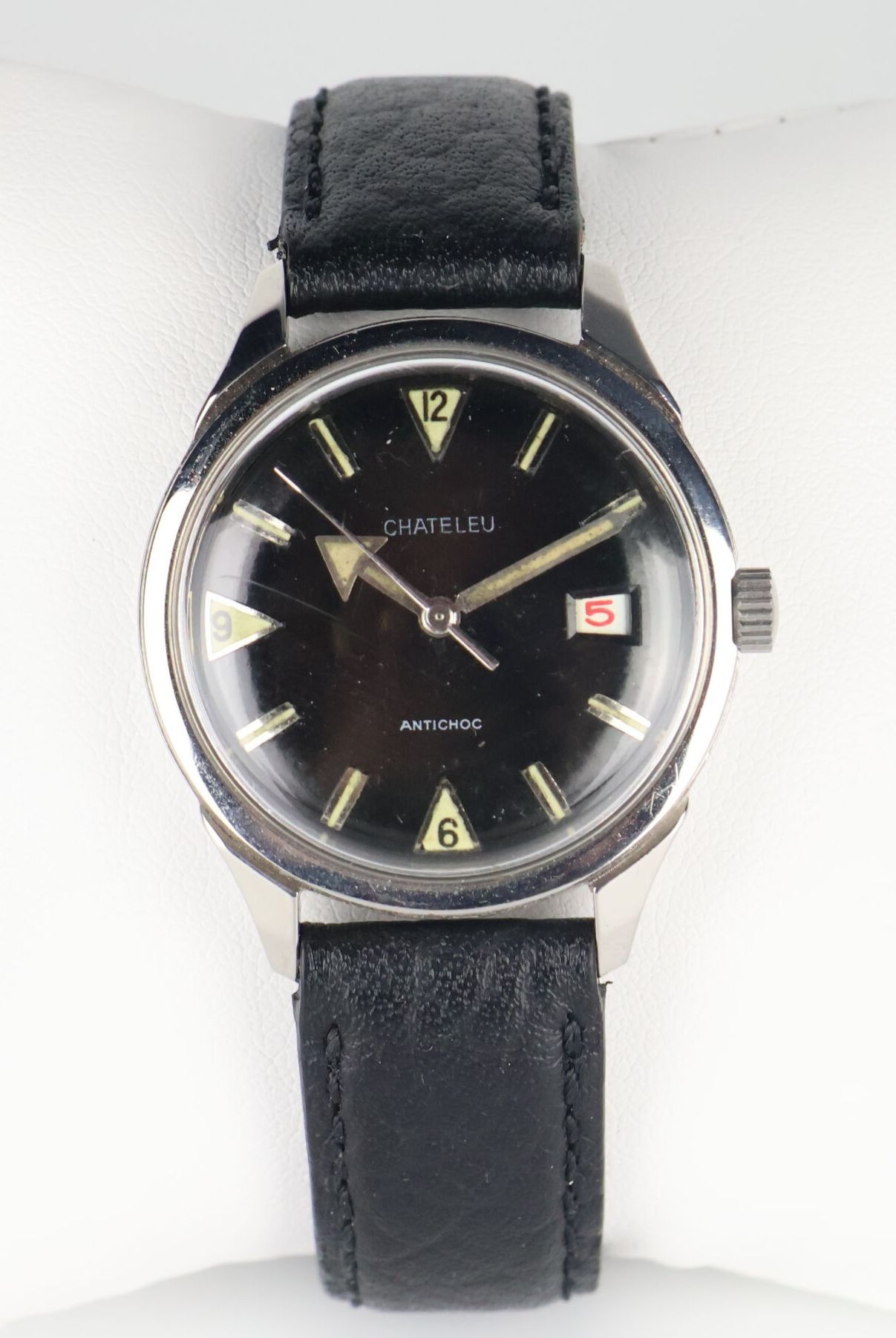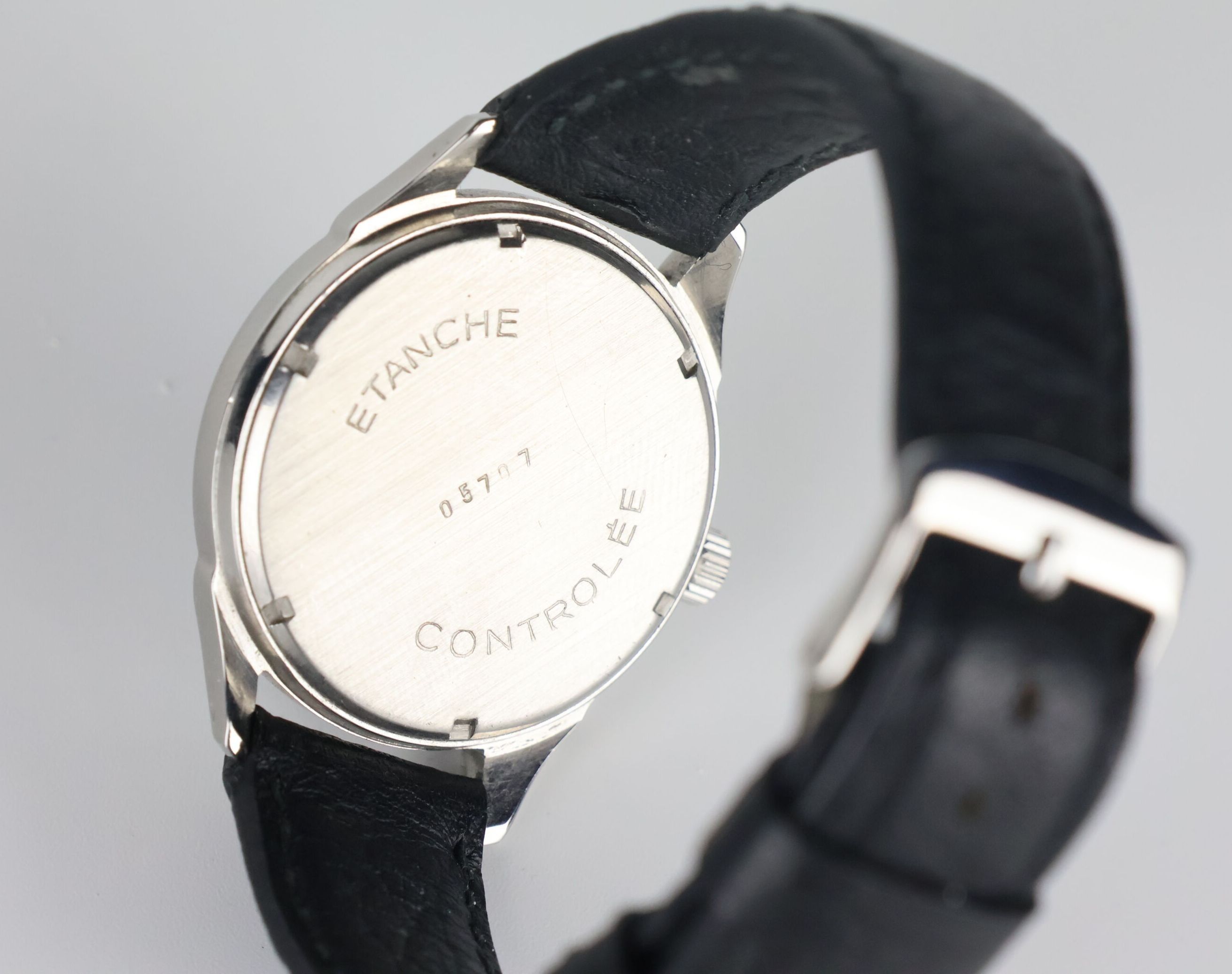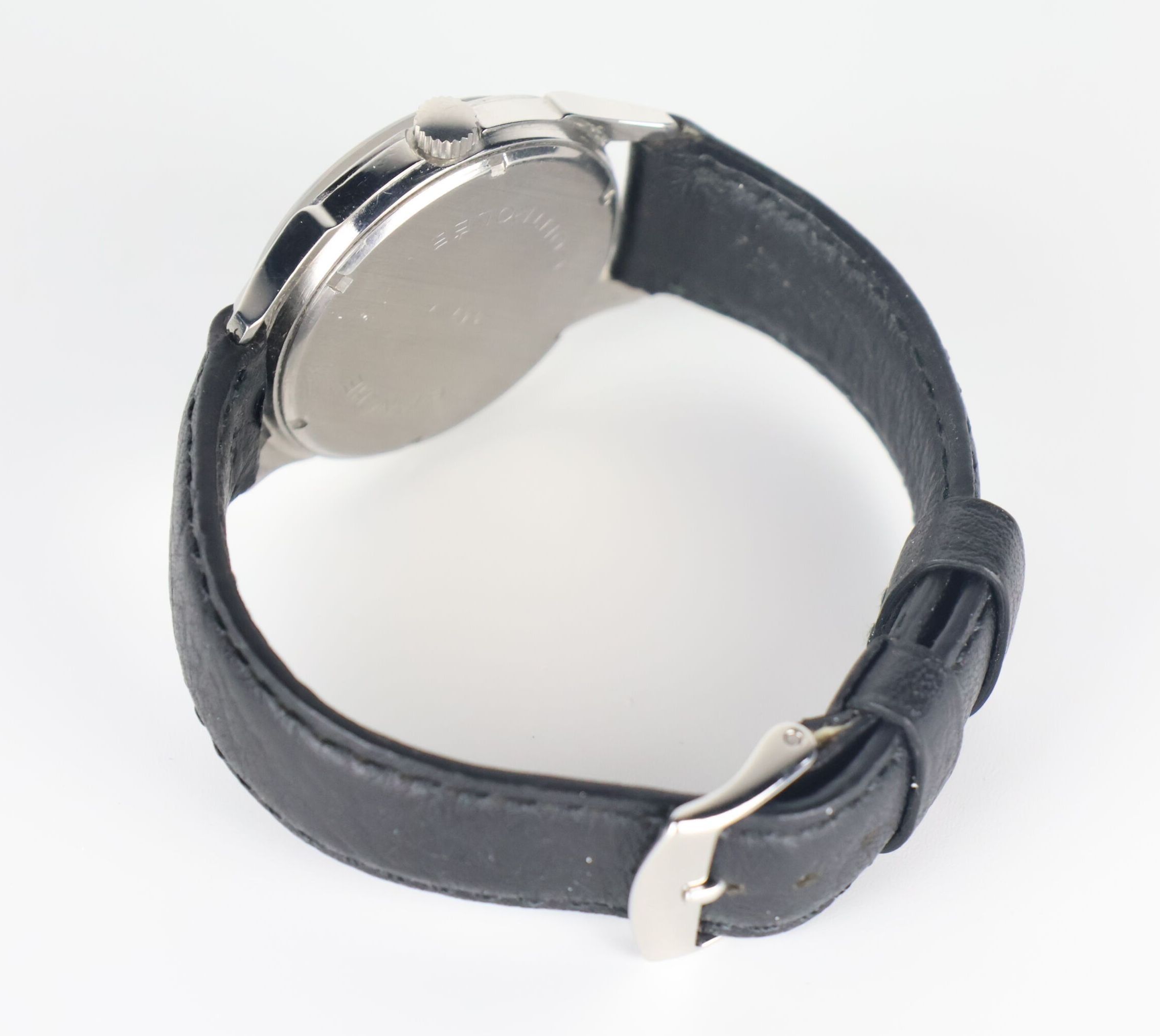 Dial: black, luminescent applied hour-markers, painted minute track, broad arrow hands, central seconds-hand, date window at 3 o'clock, signed.