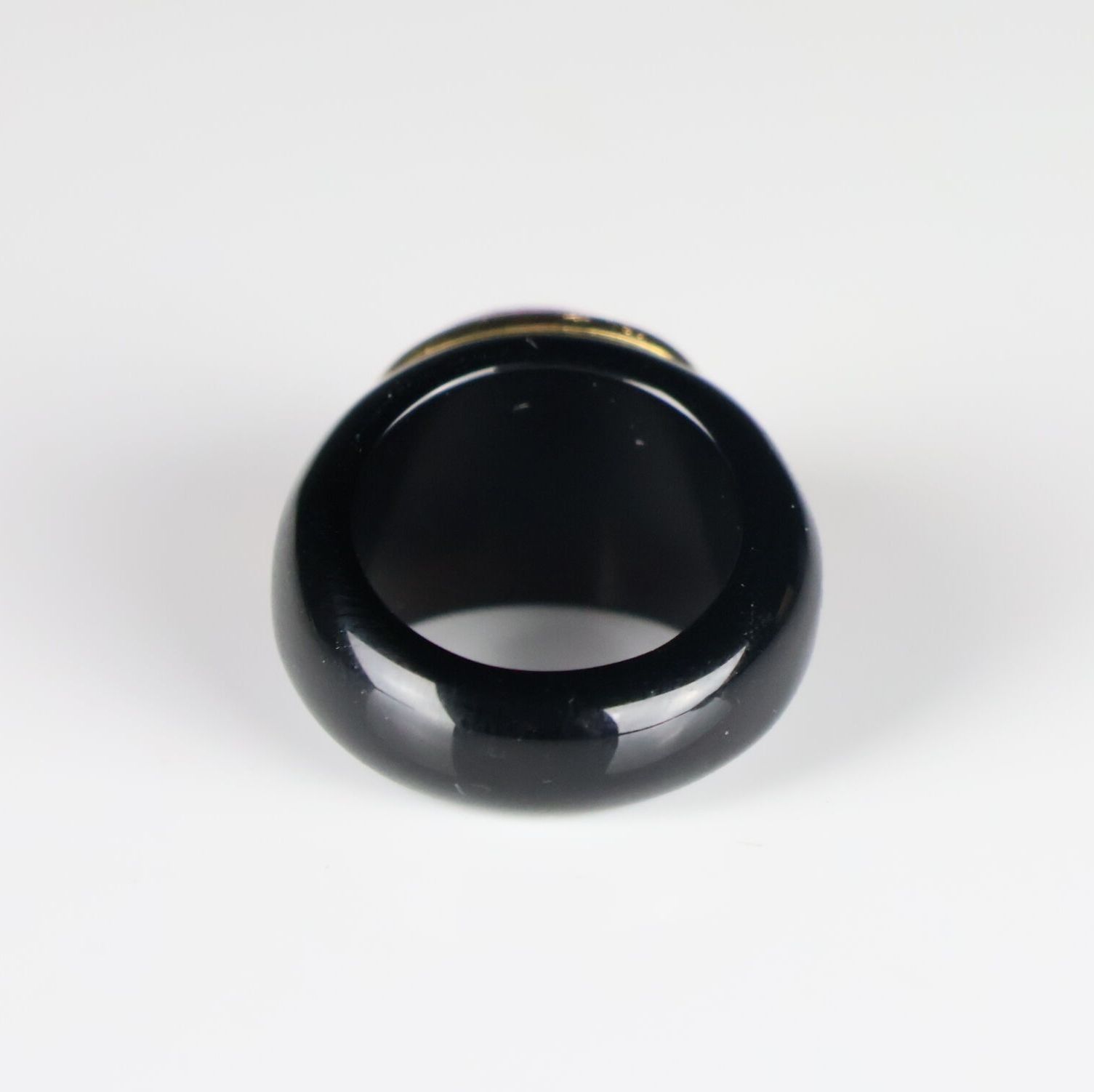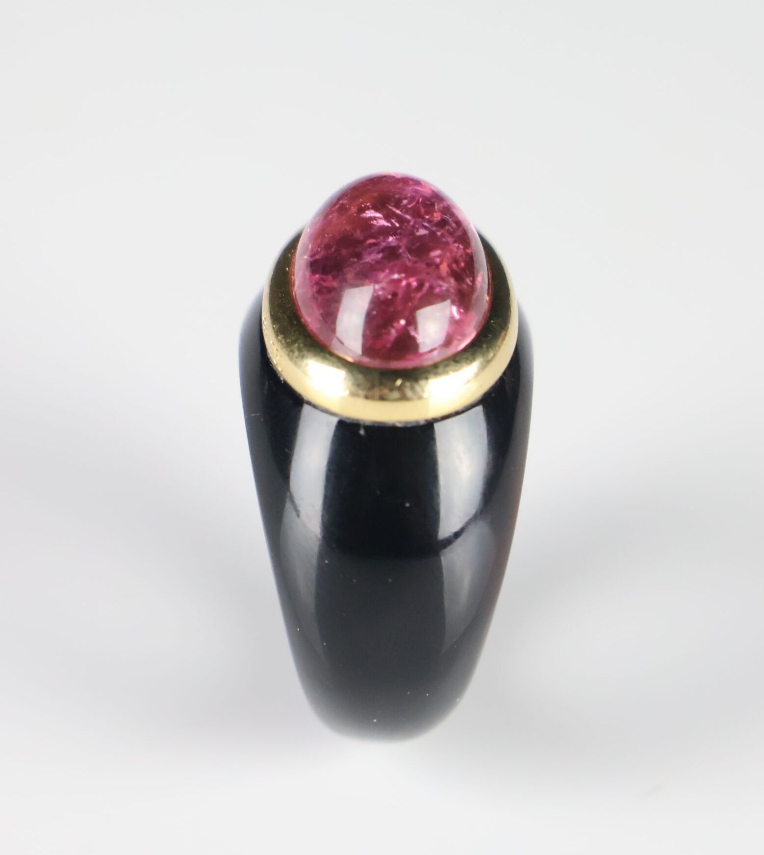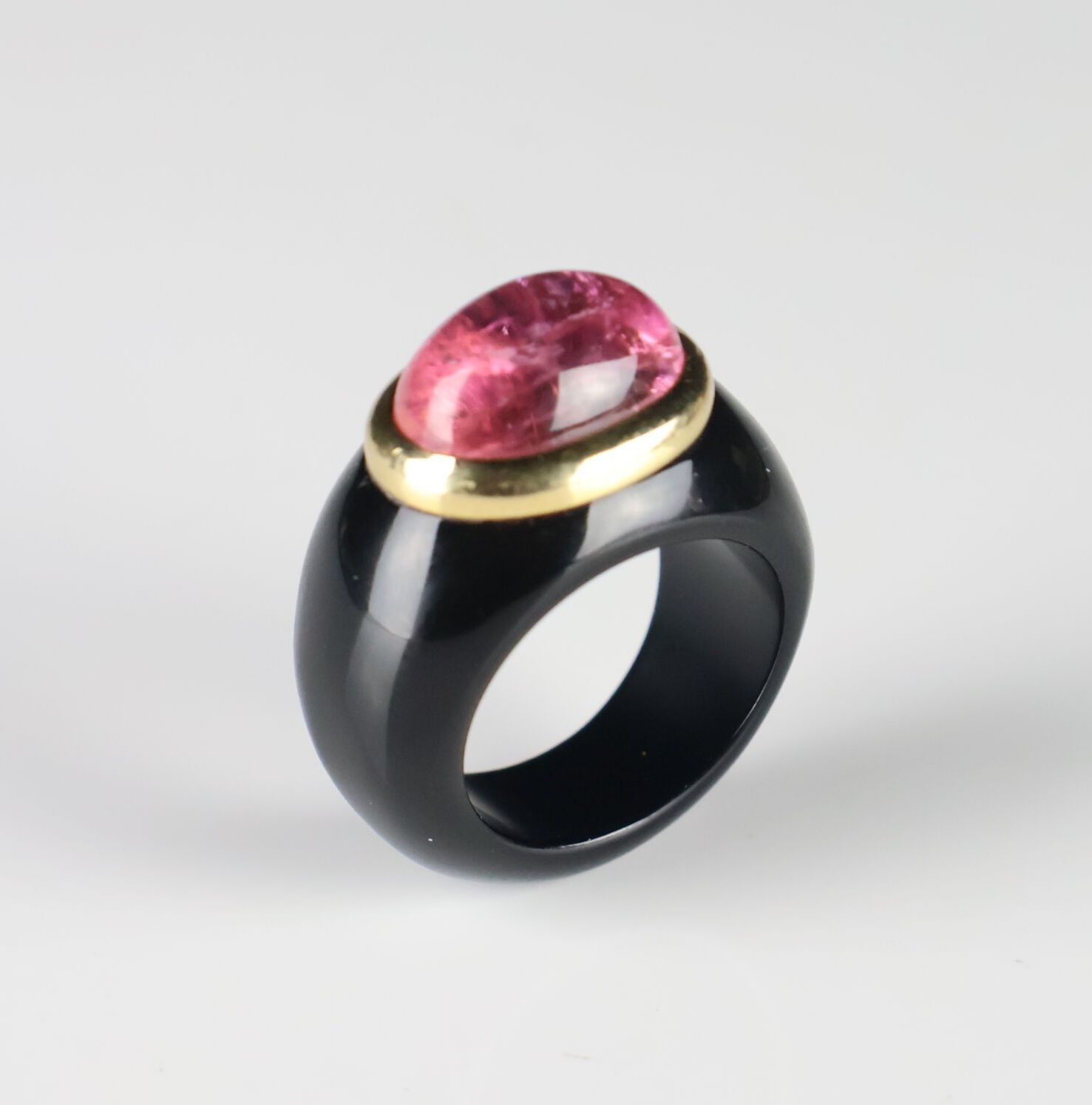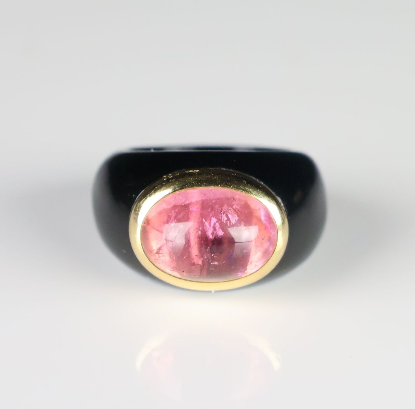 Onyx ring set with a cabochon pink stone surrounded by gold.