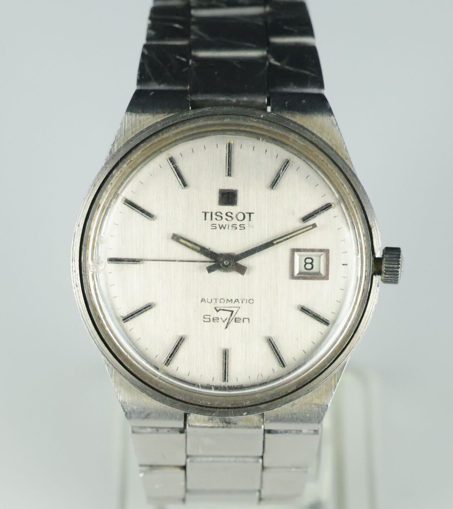 Dial: grey, applied hour markers, painted minute track, grey hands, central seconds, date window at 3 o'clock, signed.