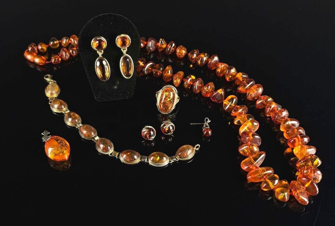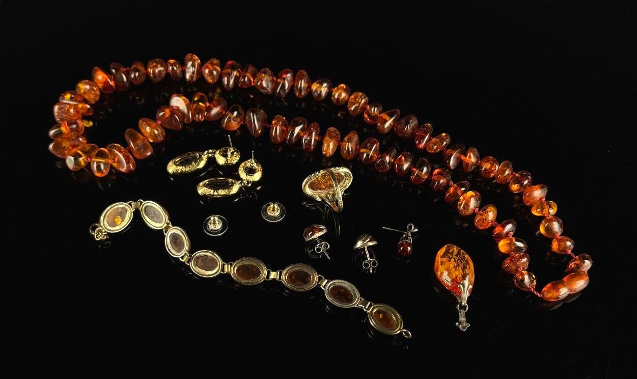 A necklace, a pair of stud earrings and an amber pendant are included.