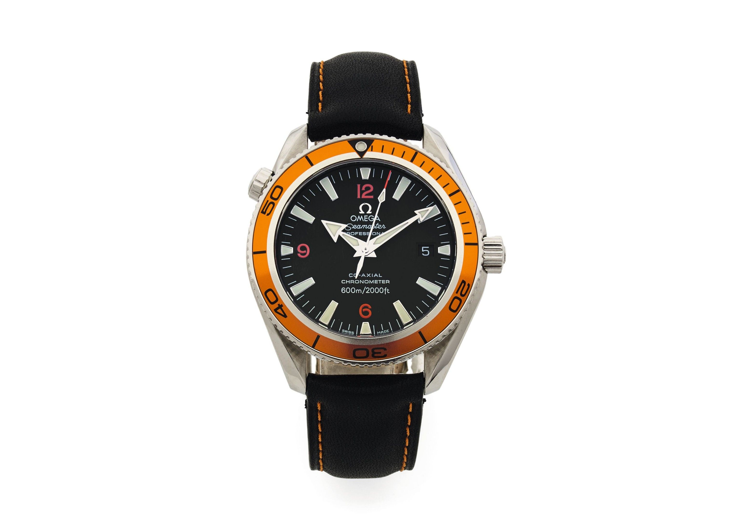 Barrel case, orange unidirectional rotating bezel, screw-down caseback with Seamaster logo, signed Black dial, Arabic numerals, luminescent hour-markers and hands, centre seconds-hand, date window, signed.