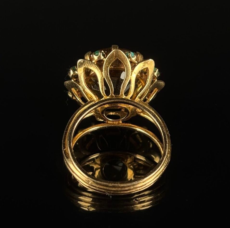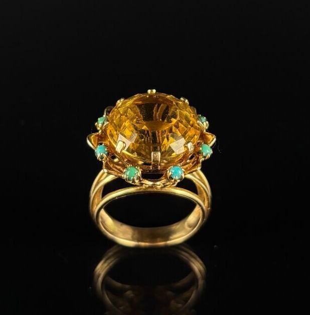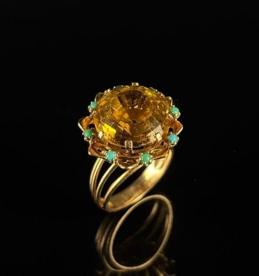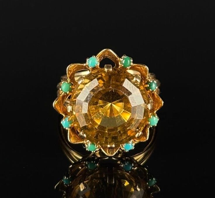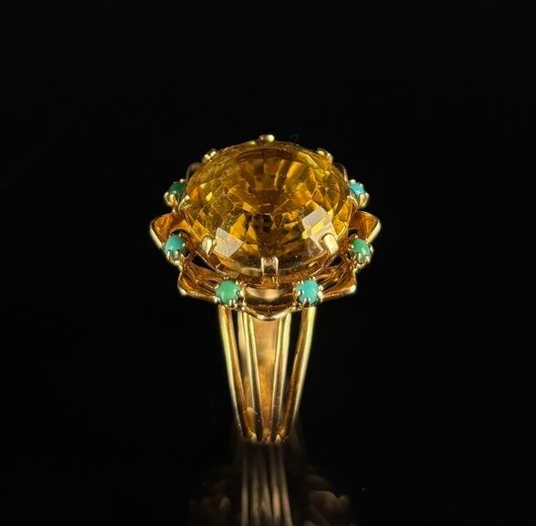 Yellow gold cocktail ring set with a round citrine surrounded by eight turquoise cabochons.