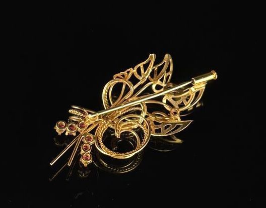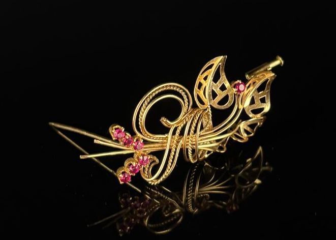 Openwork gold bouquet brooch set with pink stones.