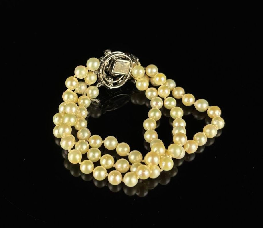 Bracelet with three rows of cultured pearls, the platinum cl…