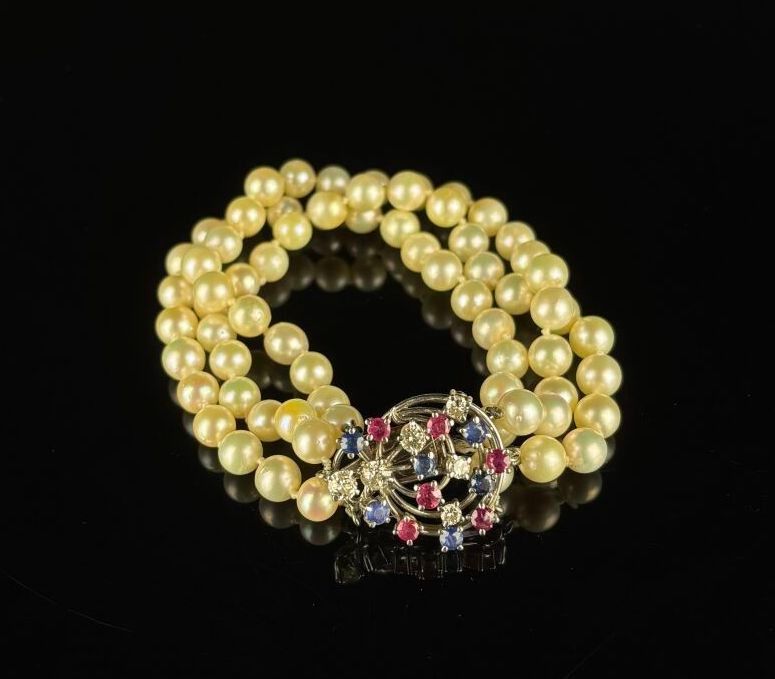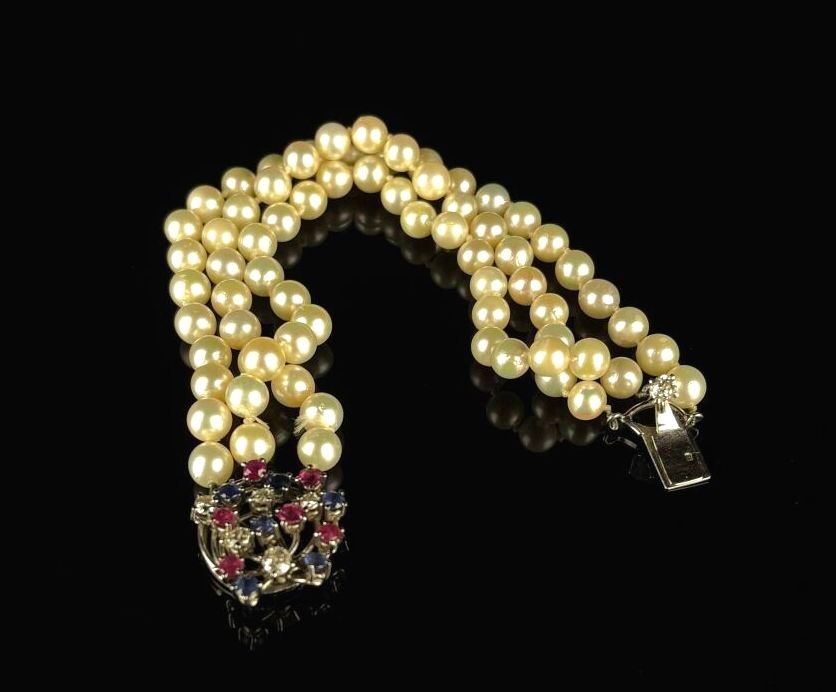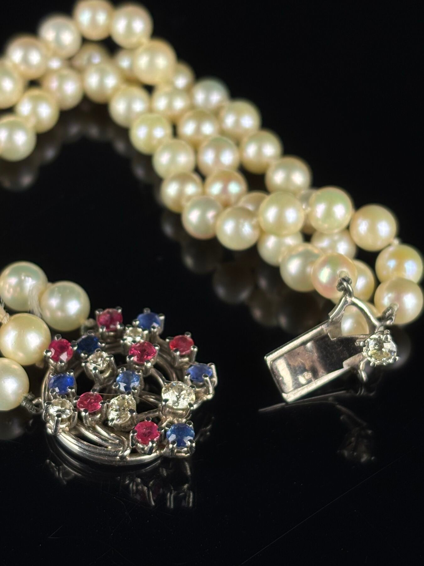 Bracelet with three rows of cultured pearls, the platinum clasp set with rubies, sapphires and round diamonds.