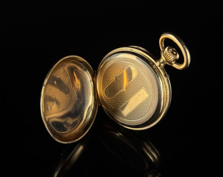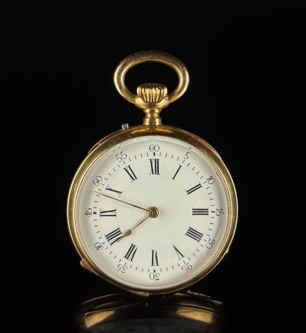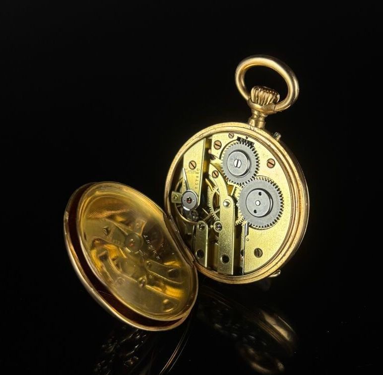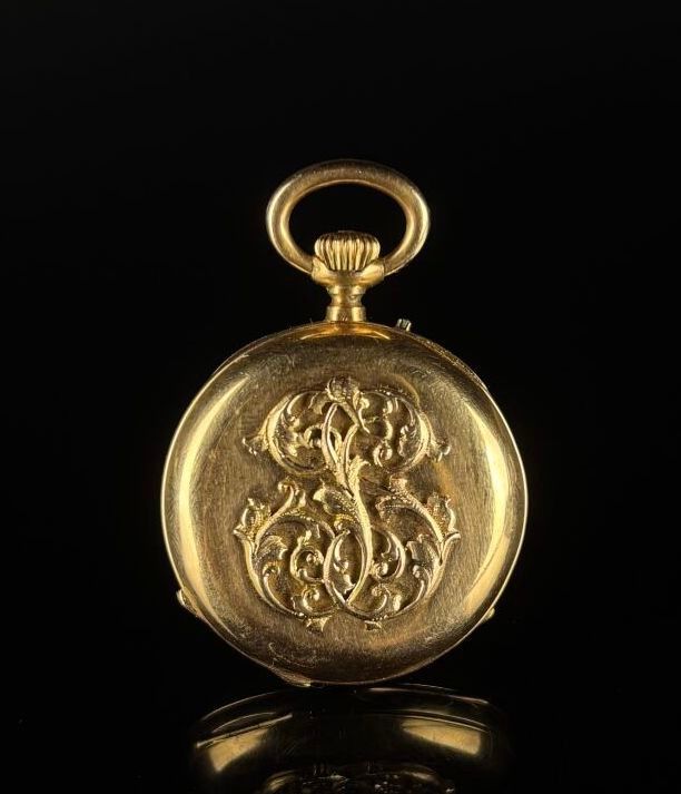 Collar watch with applied numeral decoration, gold case and dust cover.
