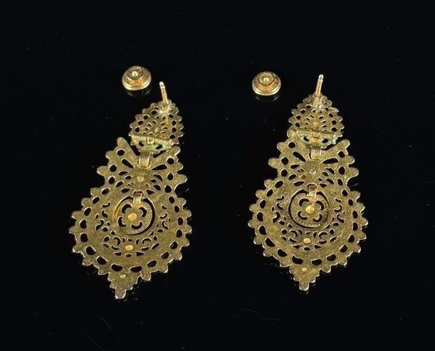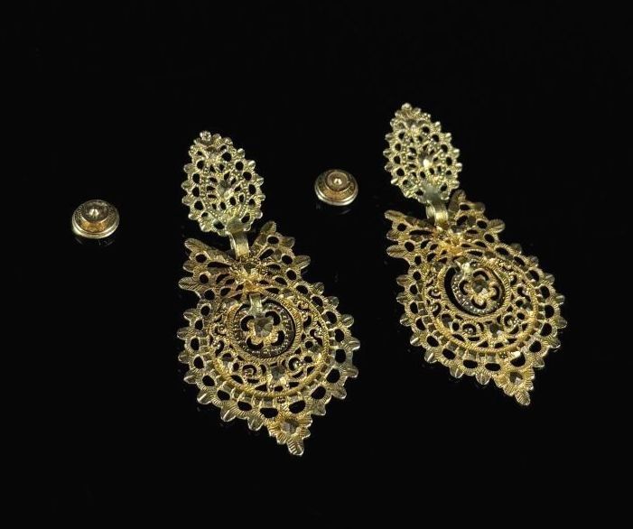 Pair of yellow gold regional ear studs with openwork and cha…