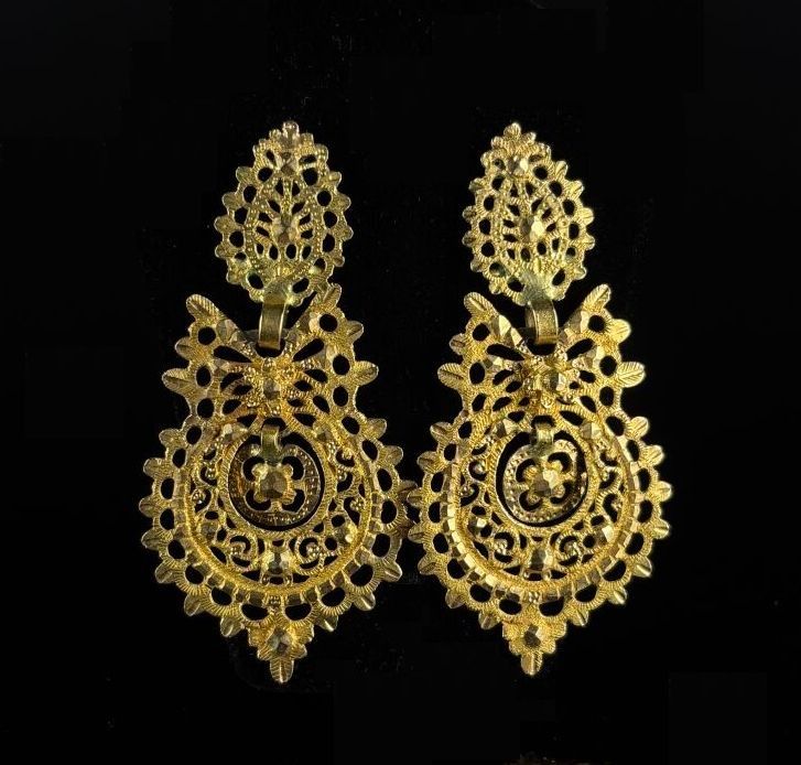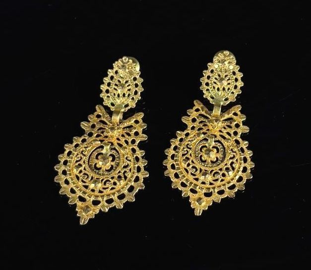 Pair of yellow gold regional ear studs with openwork and chased decoration.