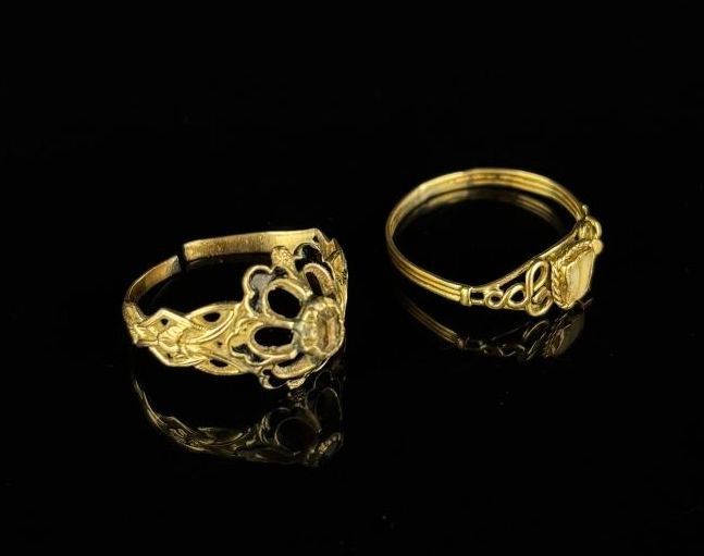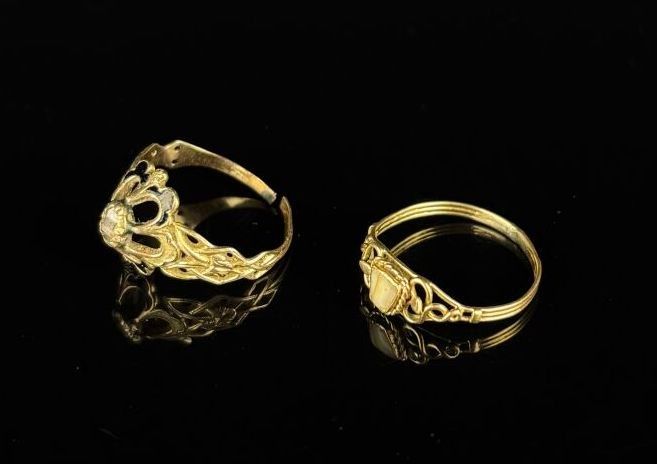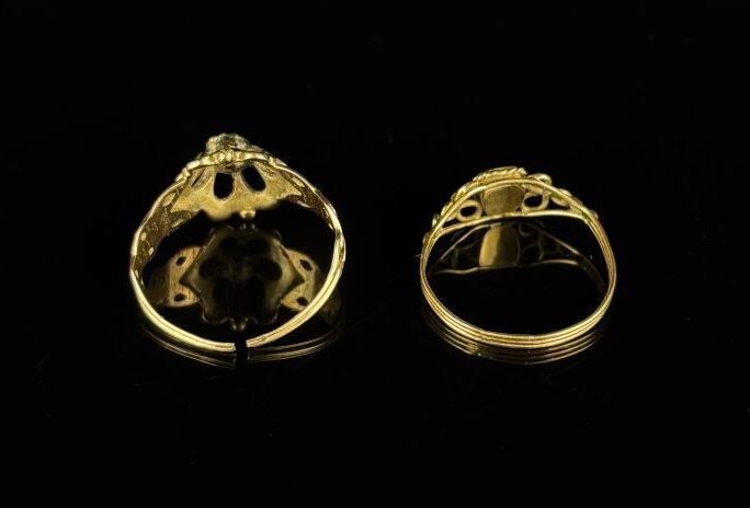An openwork gilt metal ring with a rose-cut diamond surrounded by black enamel.