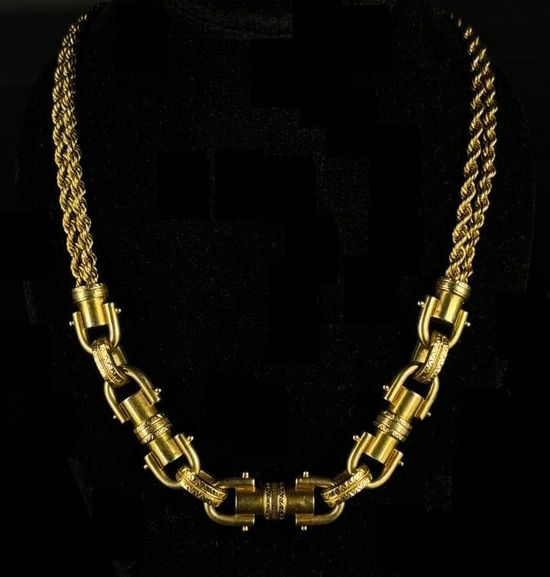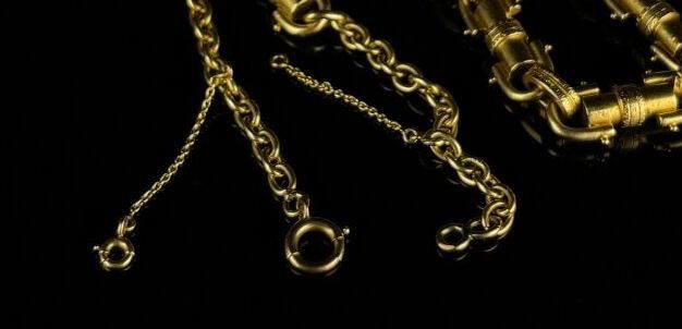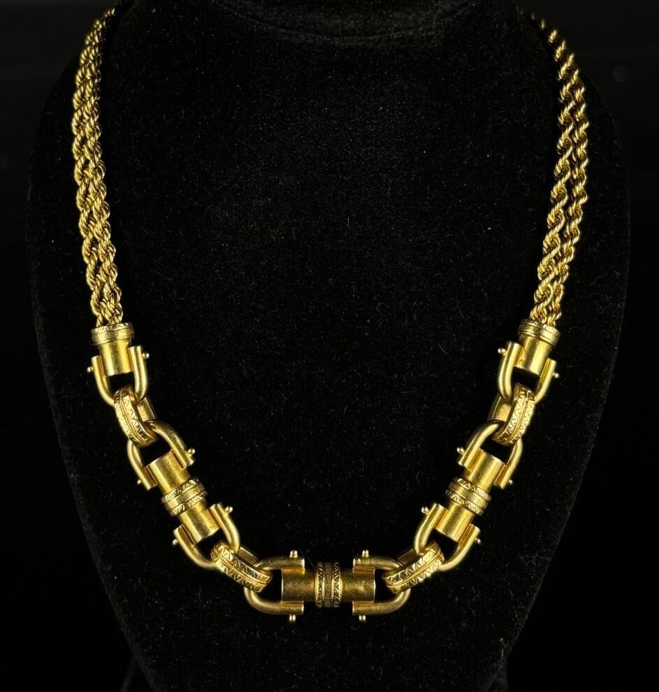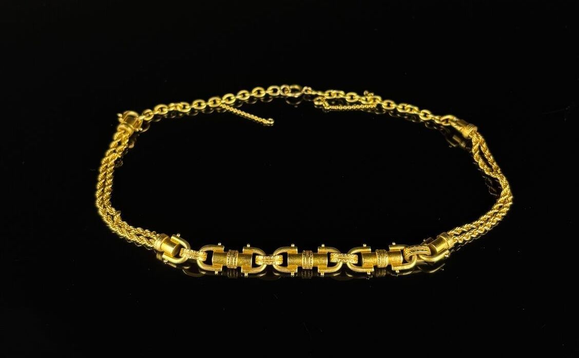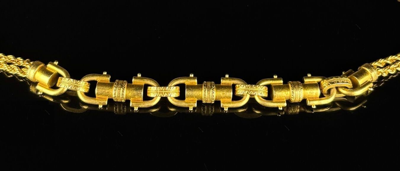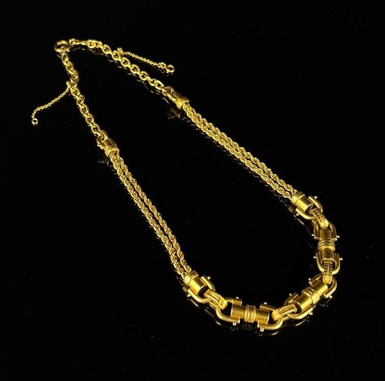 Necklace or watch chain in yellow gold with braided links framing stylised and chased links.