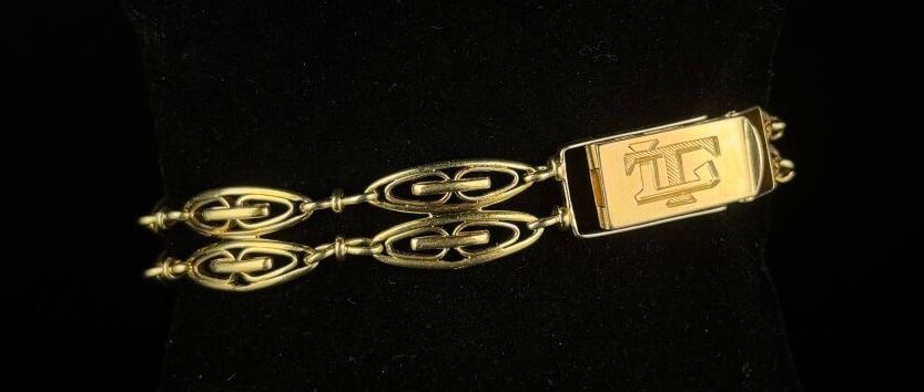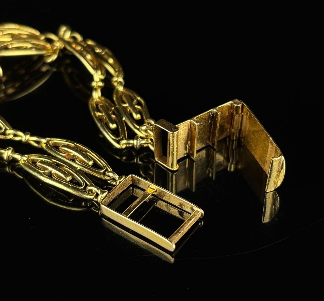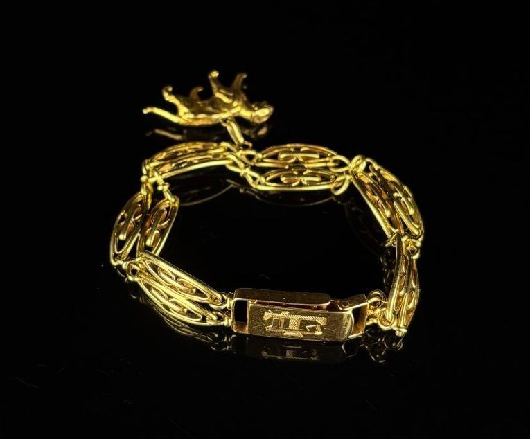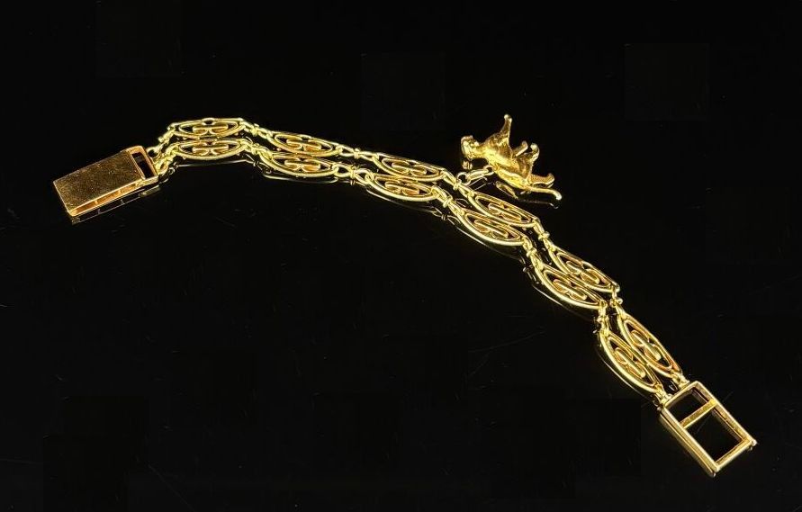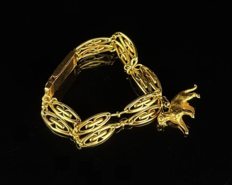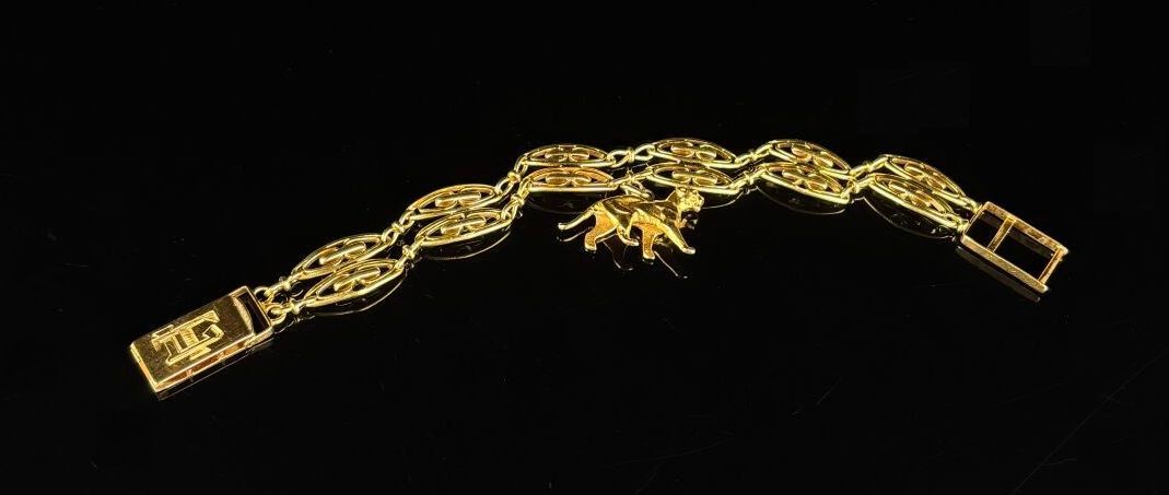 Yellow gold bracelet with two rows of openwork diamond-shaped links, adorned with a charm depicting a panther.